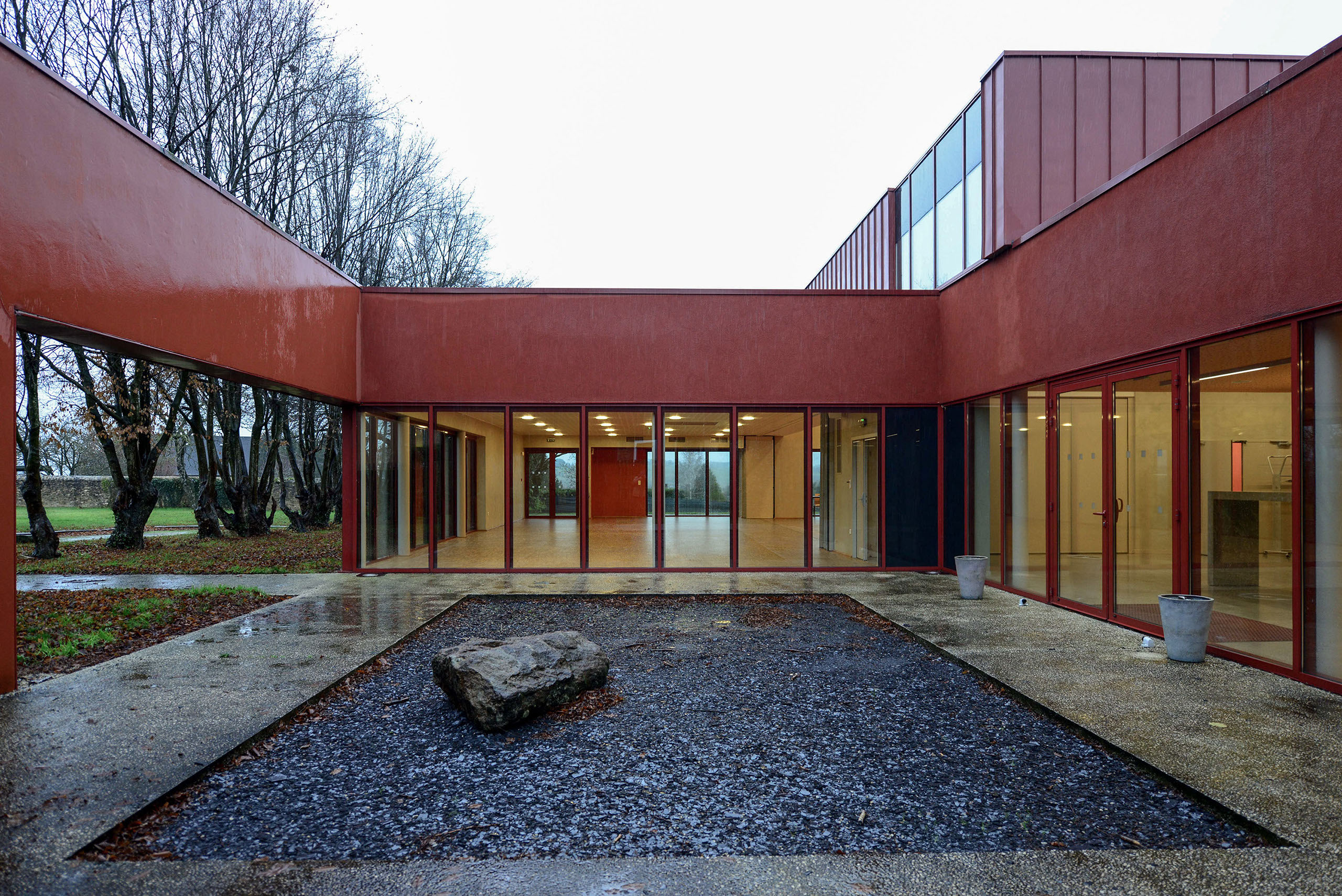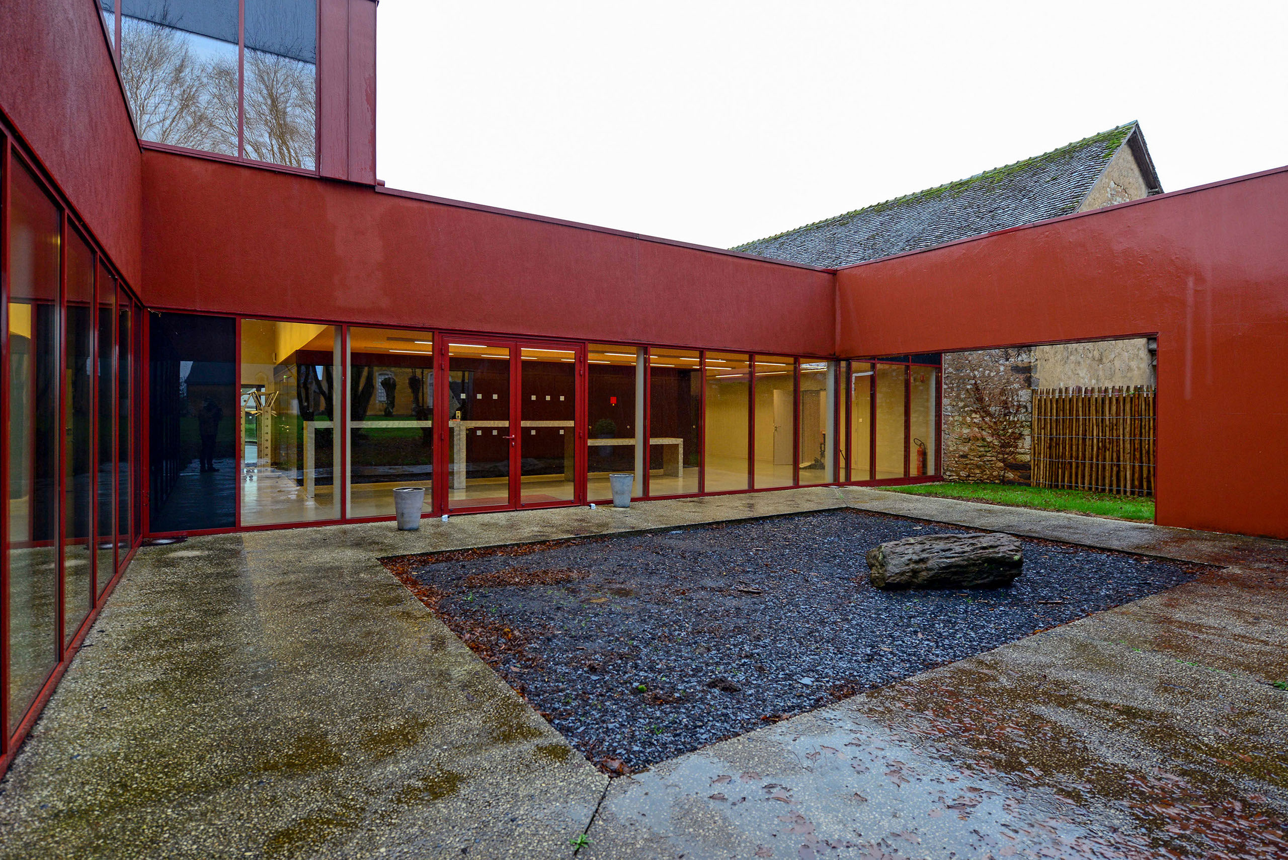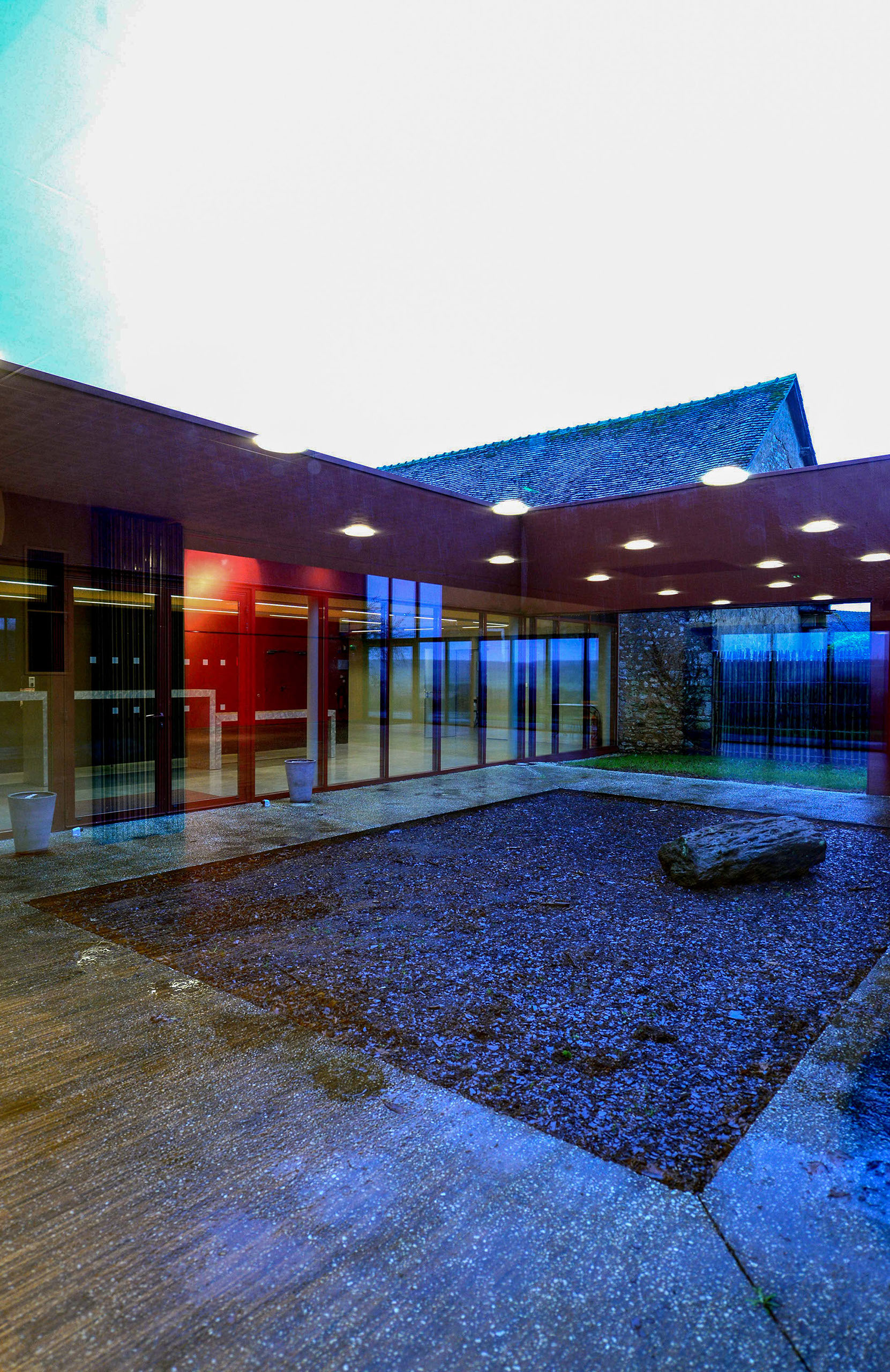 Dans cette ambiance où la couleur ocre rouge est très prégnante, ce projet se veut volontairement minimaliste, parce qu’il s’accroche à la grange d’une part mais aussi parce qu’il participe de l’aménagement des espaces existants dans le parc de la mairie (ancien presbytère).