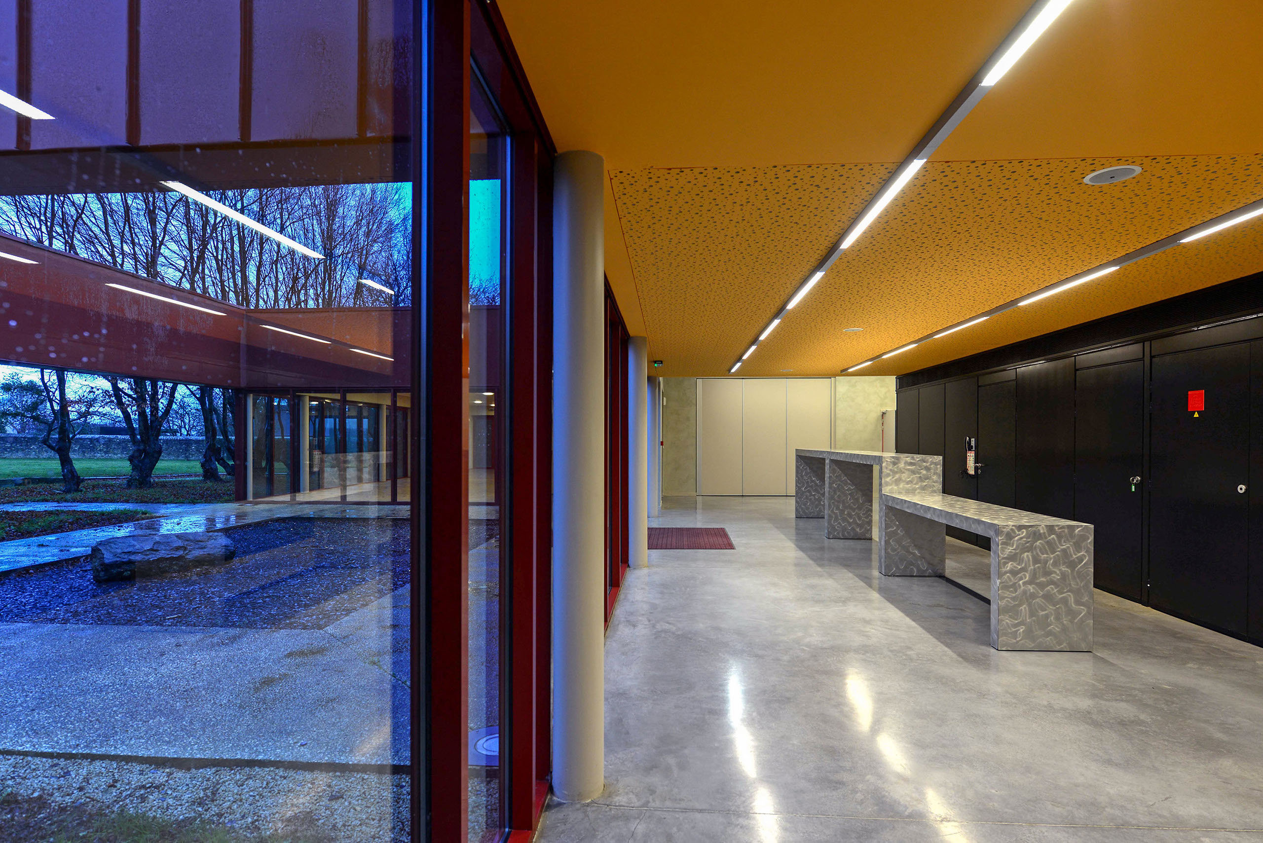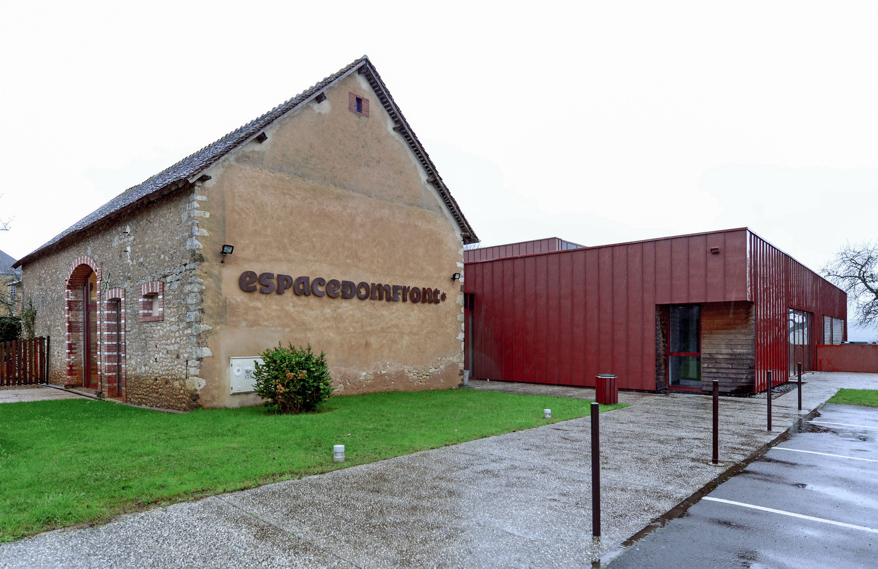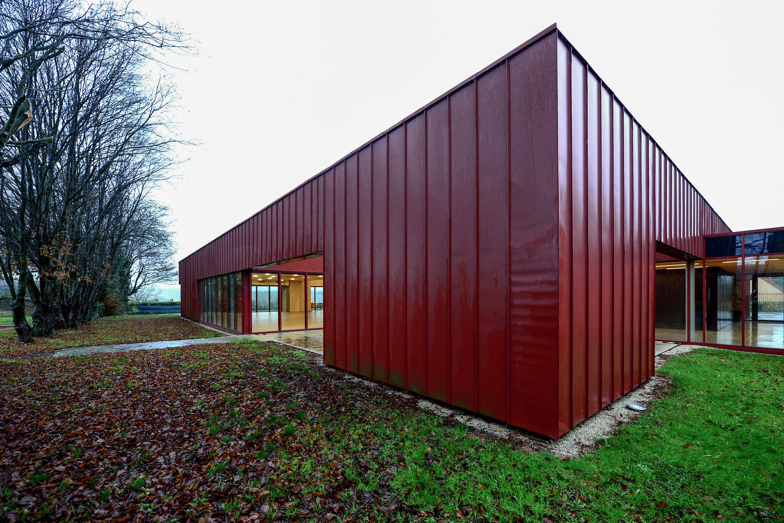 Dans cette ambiance où la couleur ocre rouge est très prégnante, ce projet se veut volontairement minimaliste, parce qu’il s’accroche à la grange d’une part mais aussi parce qu’il participe de l’aménagement des espaces existants dans le parc de la mairie (ancien presbytère).