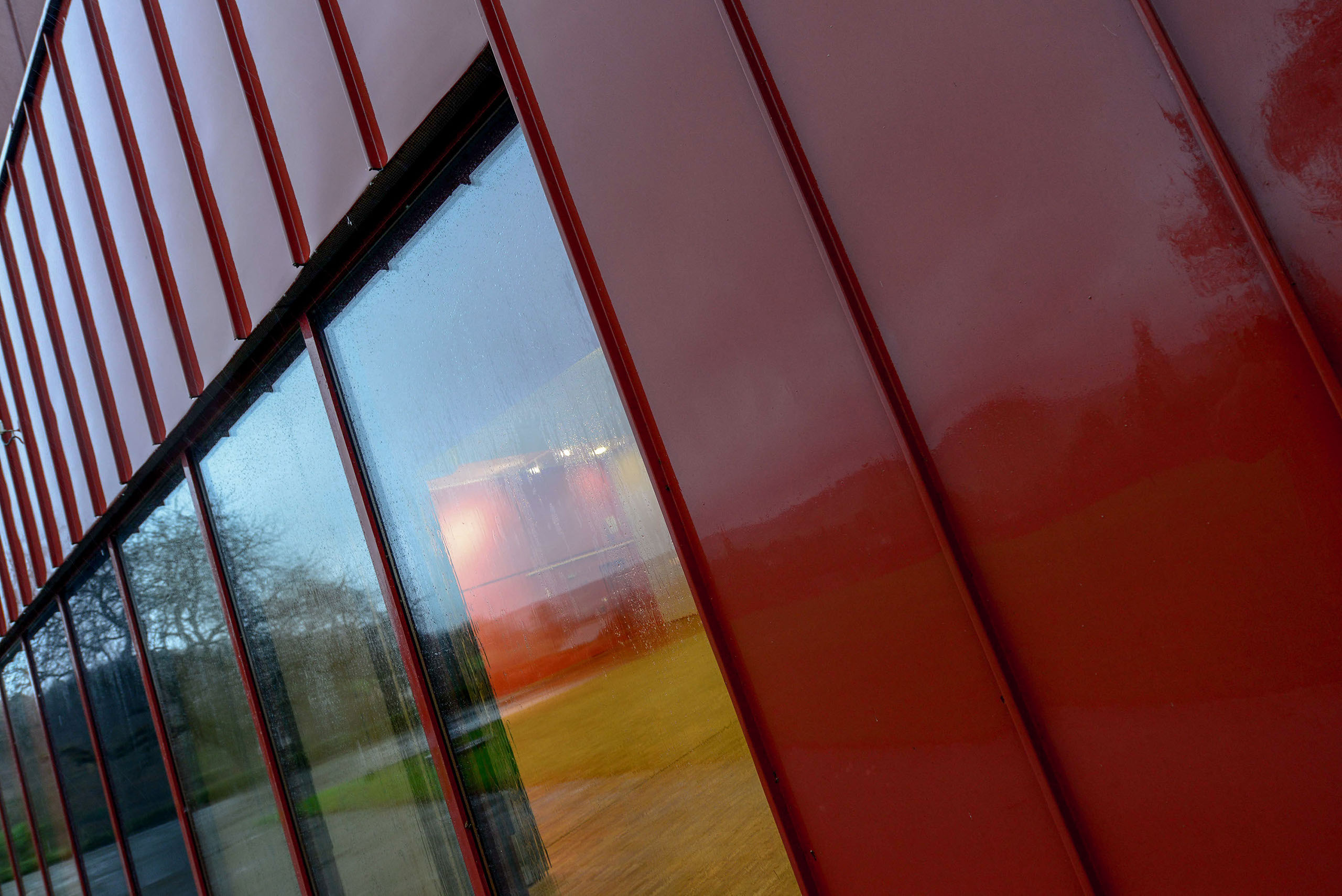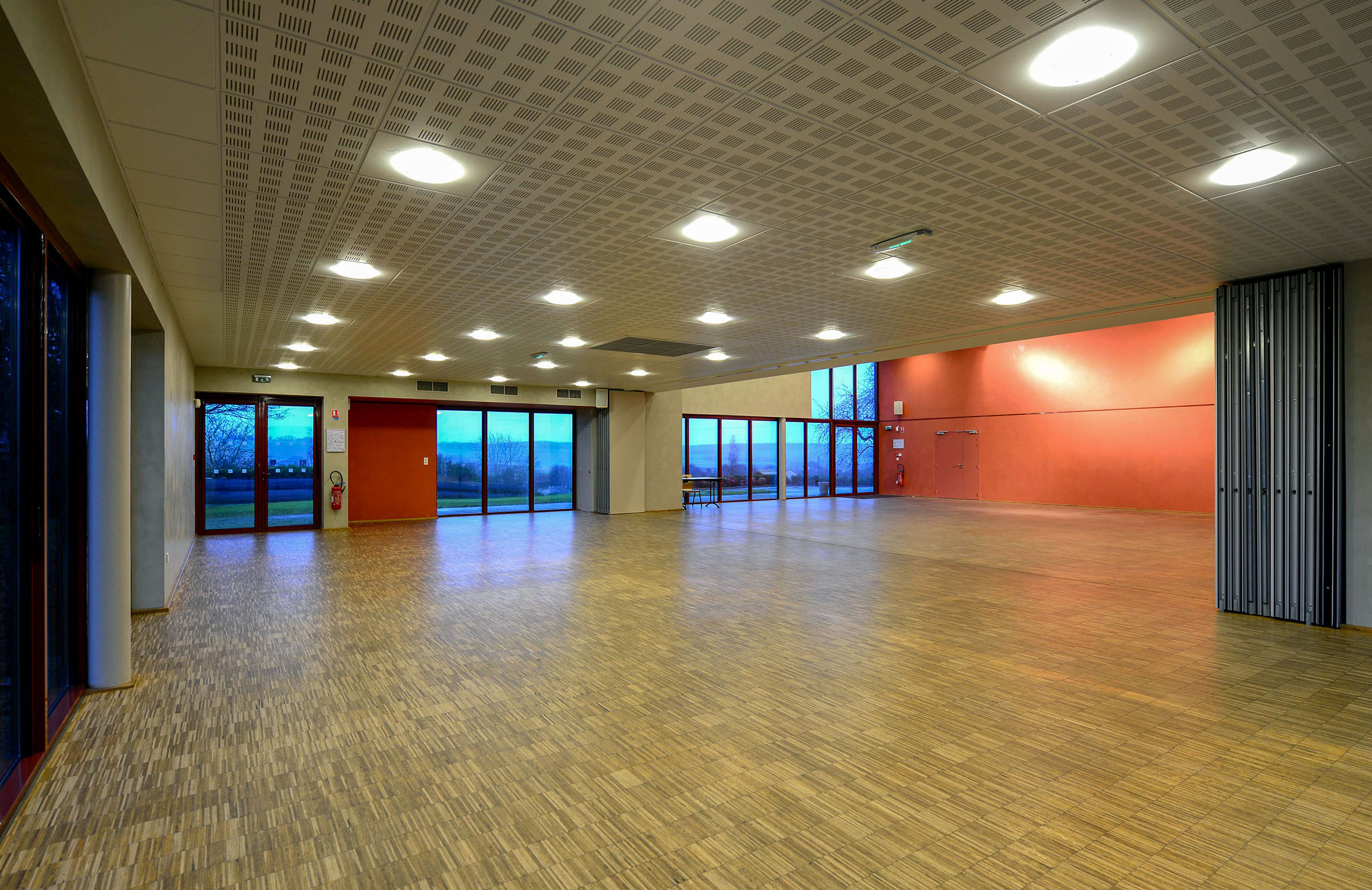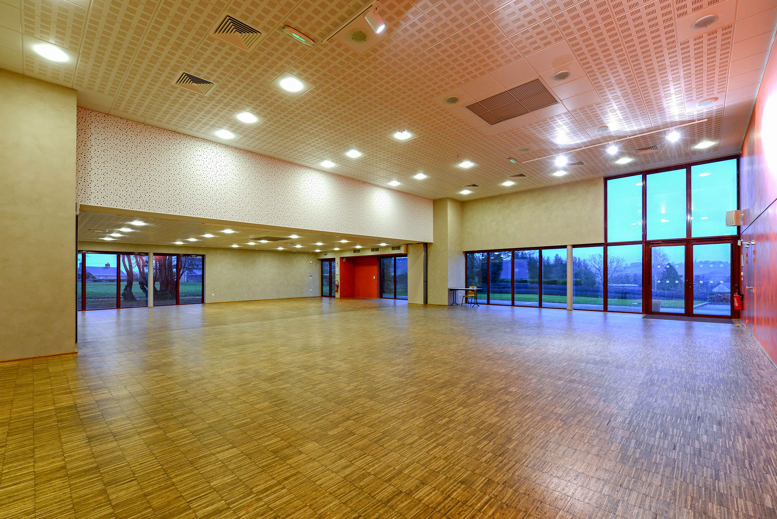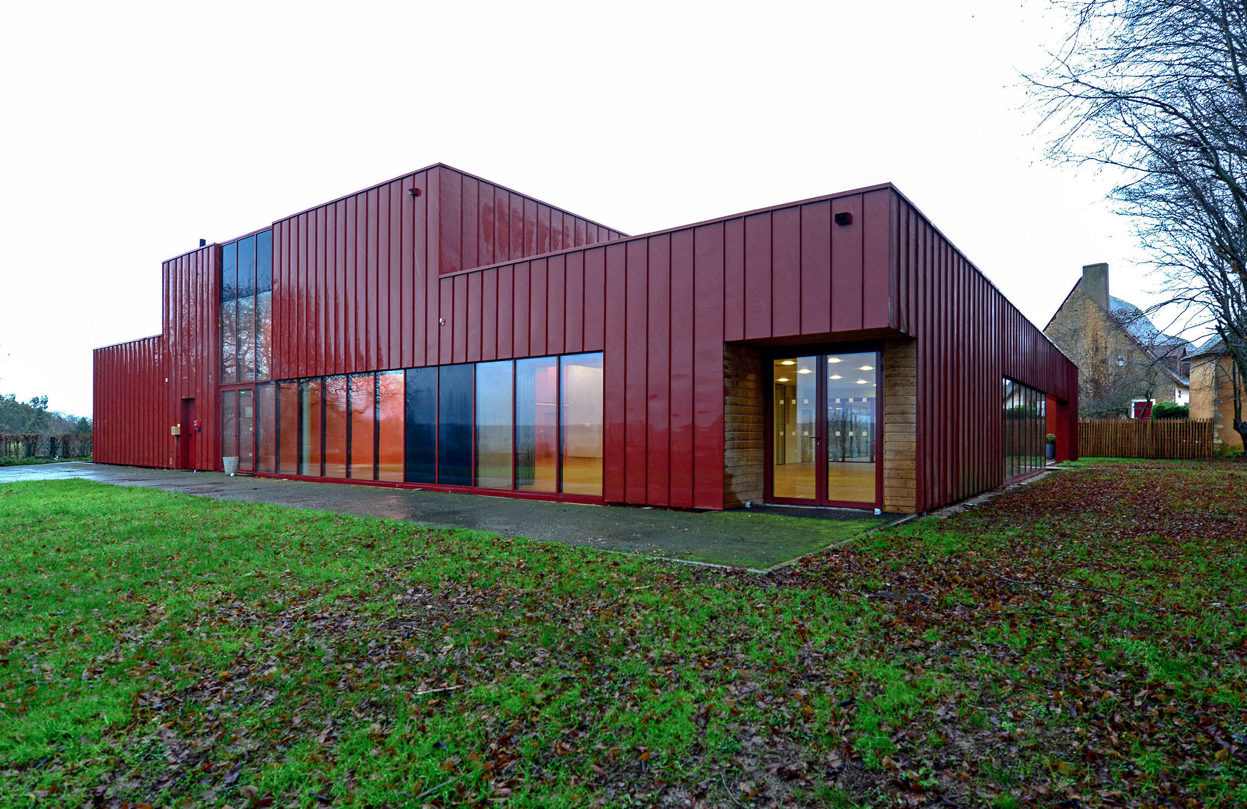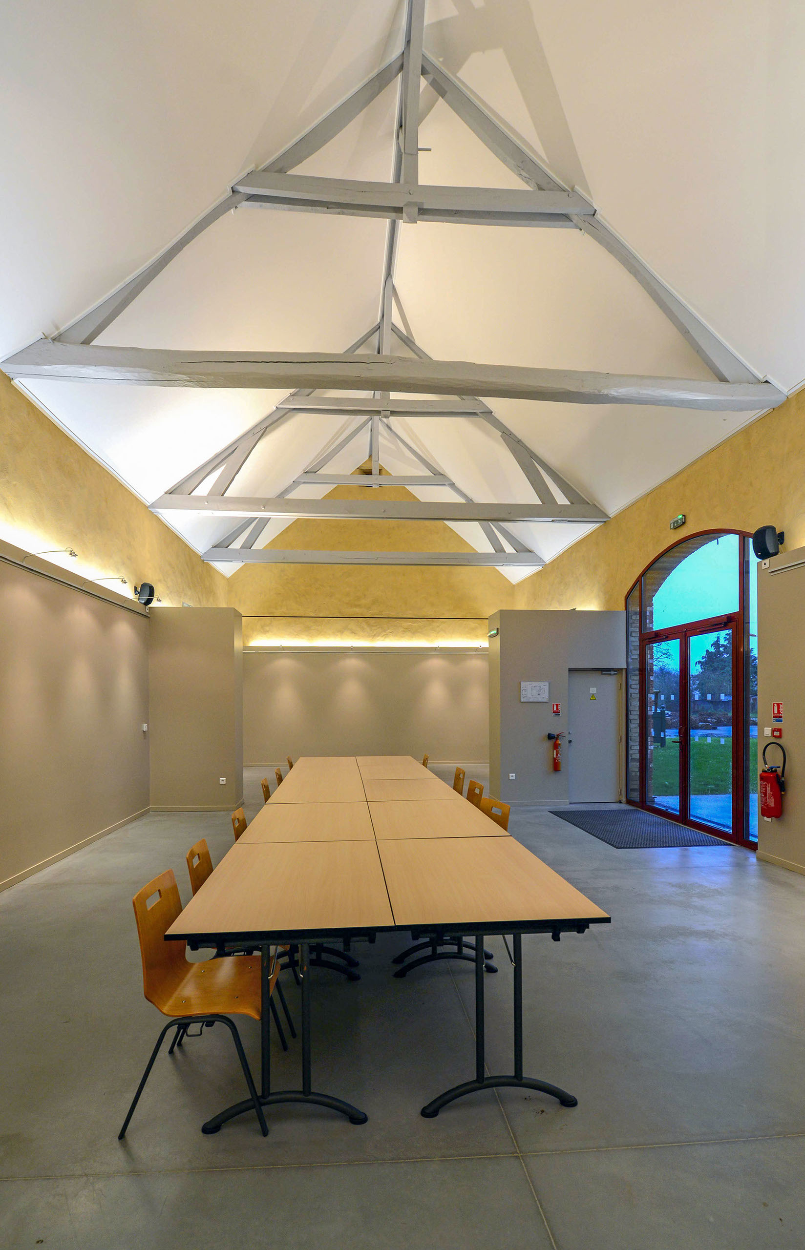 Sur ce terrain d’aspect très rural, sur lequel nous conservons la vieille grange, l’implantation d’une salle socio-culturelle se devait d’éviter un marquage spatial proéminent afin de respecter le caractère de bourg de campagne existant fait de volumes simples s’imbriquant les uns dans les autres ou se répondant harmonieusement.