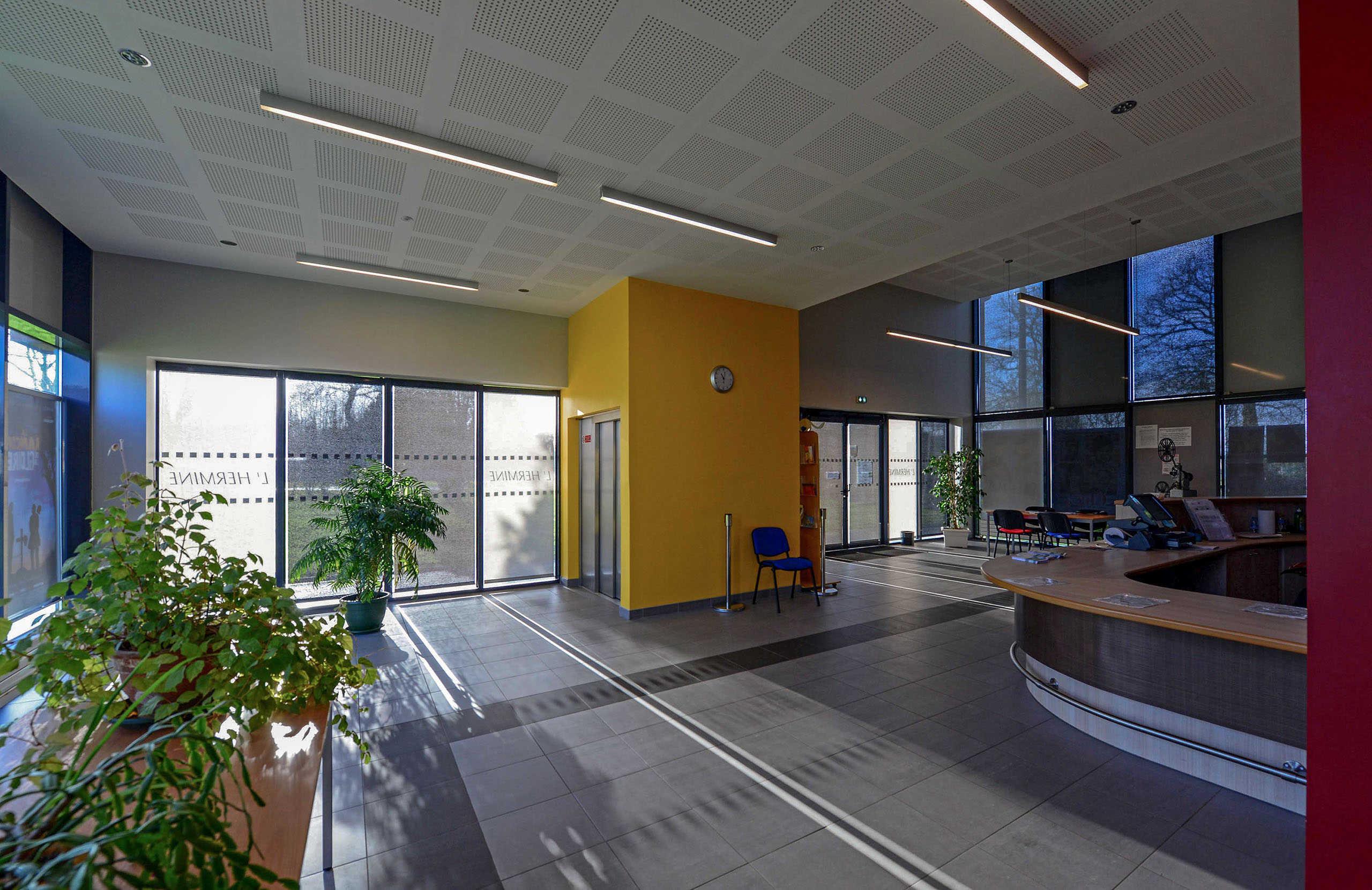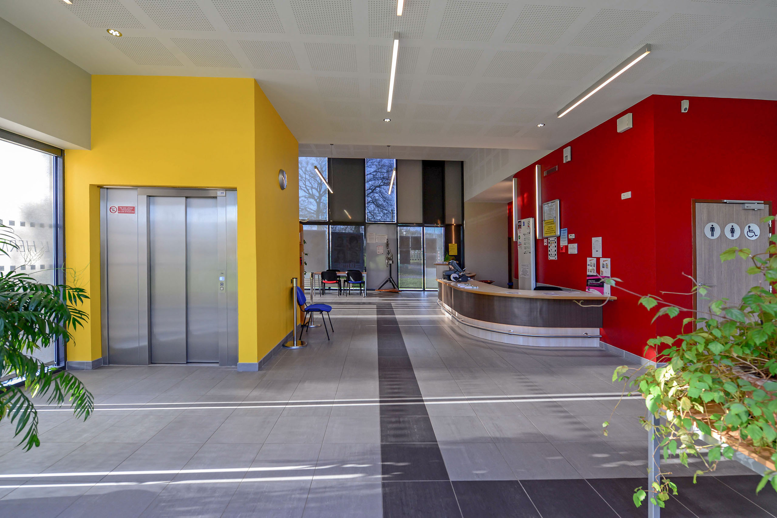 Le choix d’une modénature de bâtiment composé d’un soubassement bois, d’une partie supérieure en aluminium laqué couleur rouille ainsi que des grands murs rideaux toute hauteur, malgré sa forme compacte, fait apparaître un bâtiment plus léger et plus petit qui donne à l’ensemble une cohérence intéressante et une meilleure intégration dans un tissu urbain pavillonnaire.