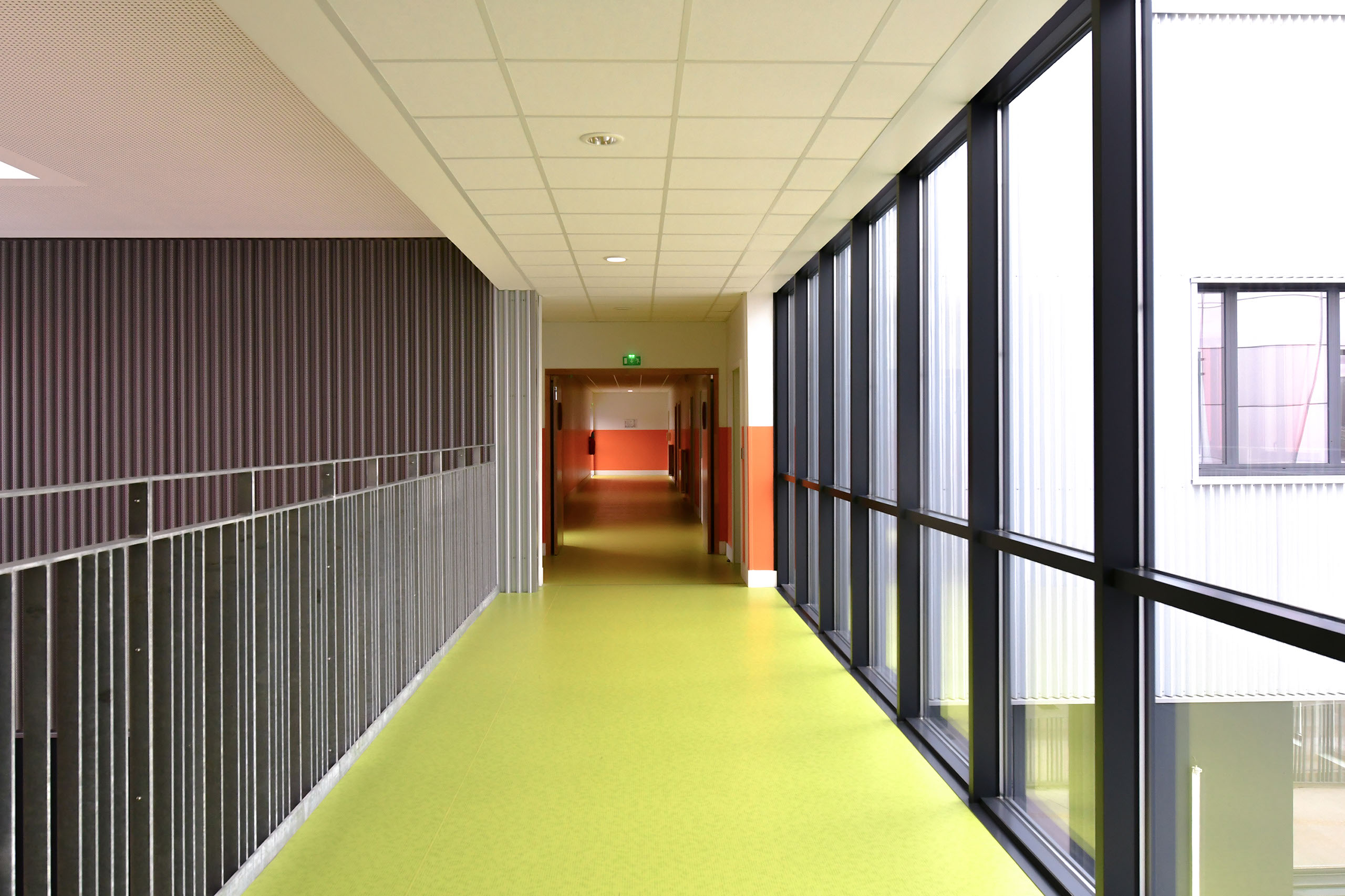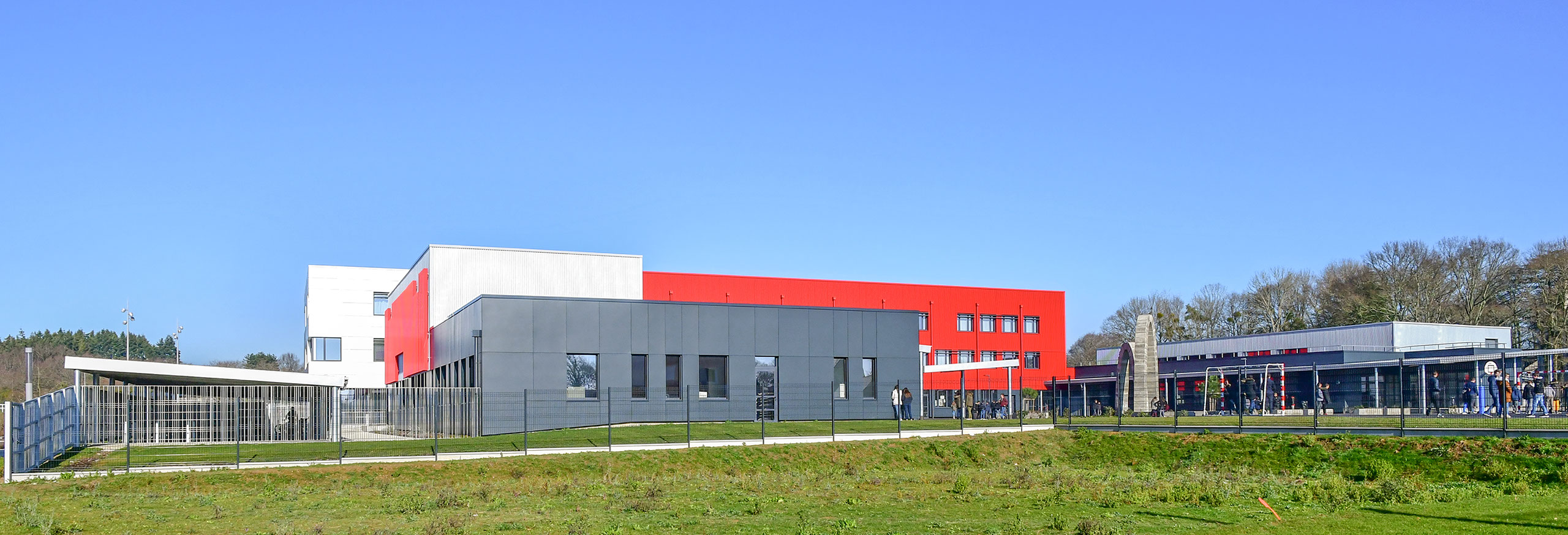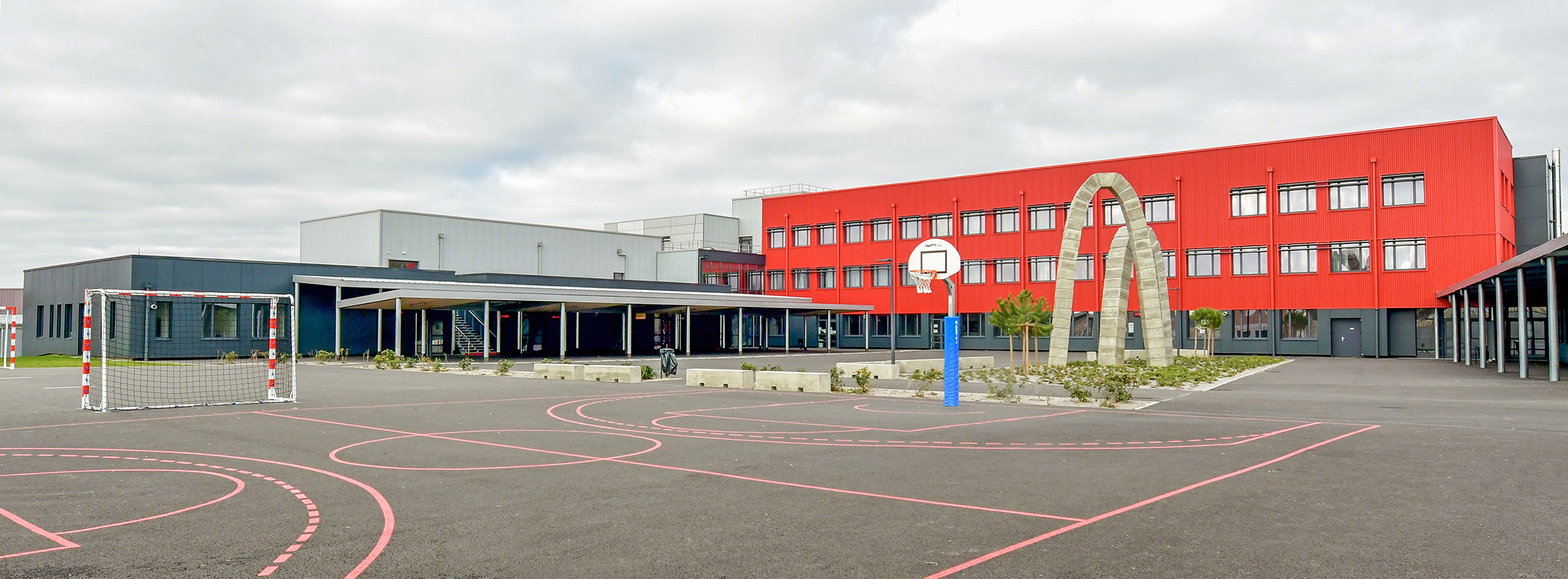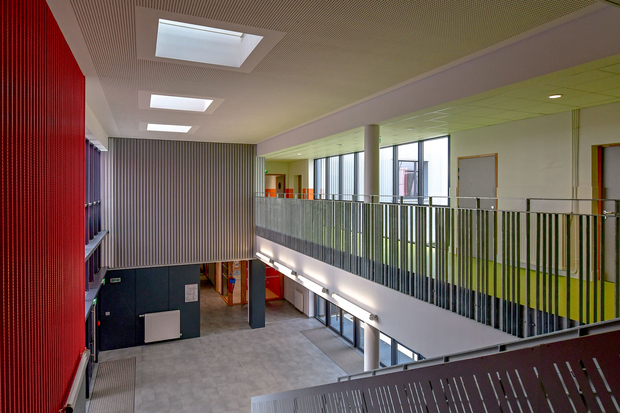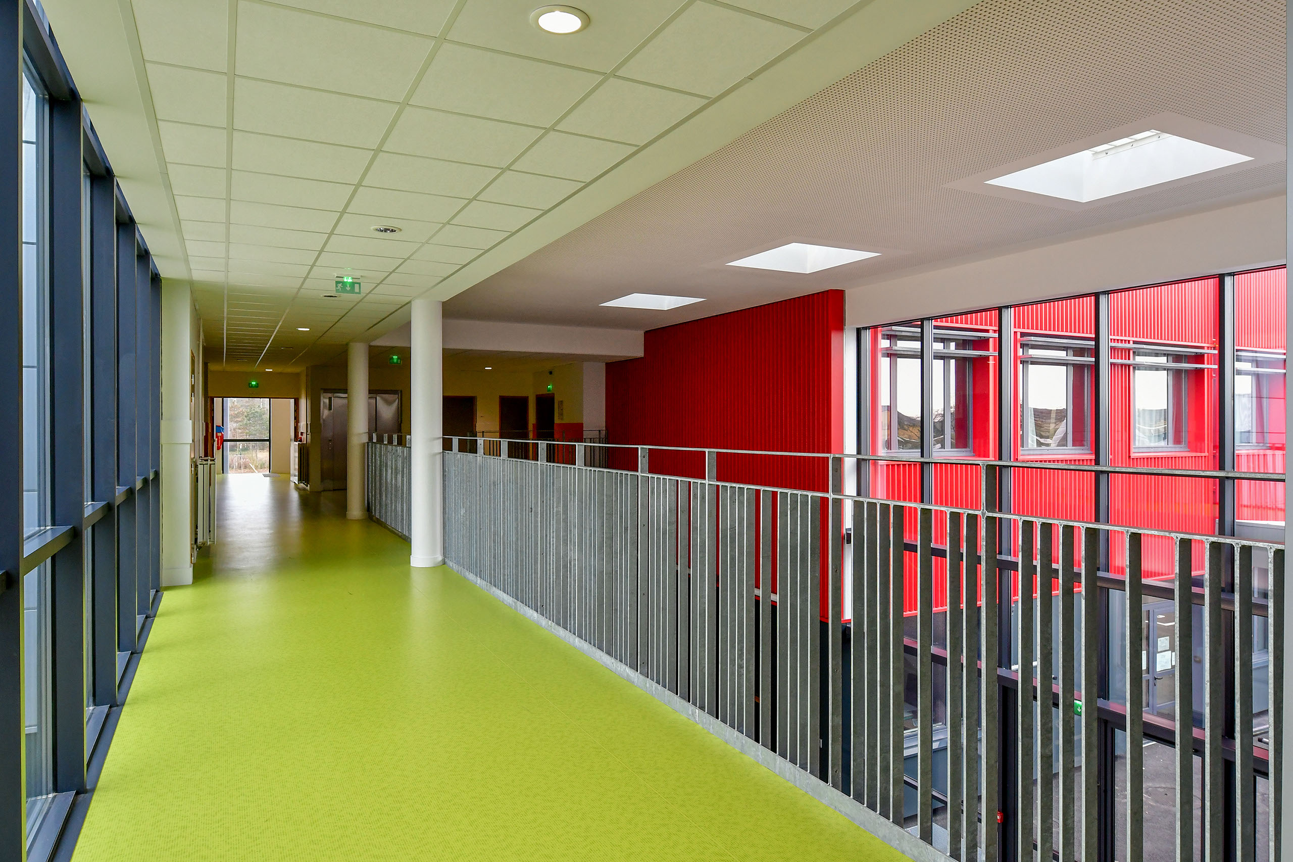 L’ordonnancement du collège repose sur le bâtiment d’enseignement en R+2 situé au centre du site, sur un axe est ouest qui constitue l’épine dorsale du collège, élément signal, qui fédère dans sa continuité les éléments fondamentaux du projet :