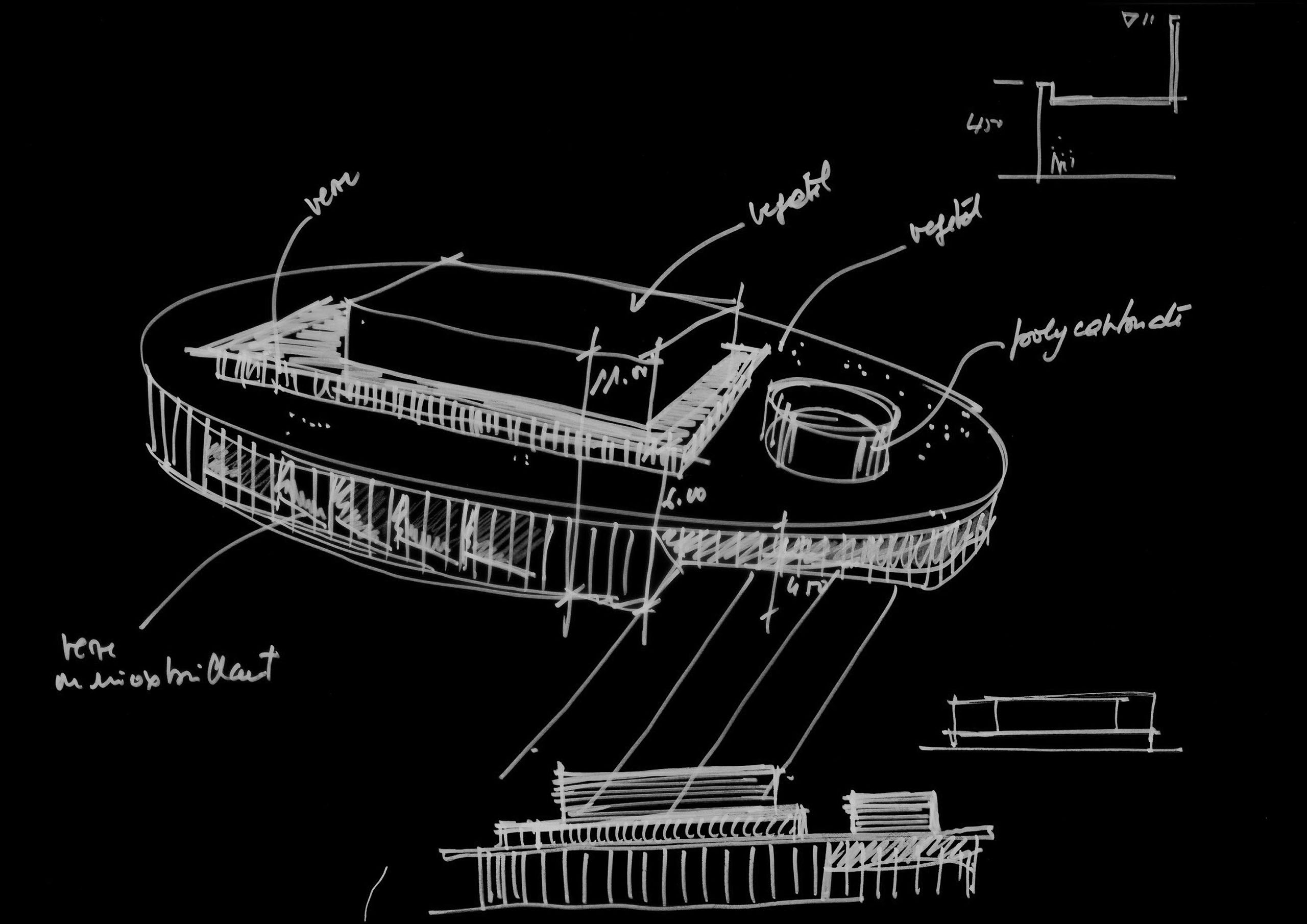 Nous avons signifié notre architecture par un vaste ovoïde regroupant et enserrant la totalité des activités dans un volume unique, très facilement identifiable et à la forme symbolique perceptible par les utilisateurs.