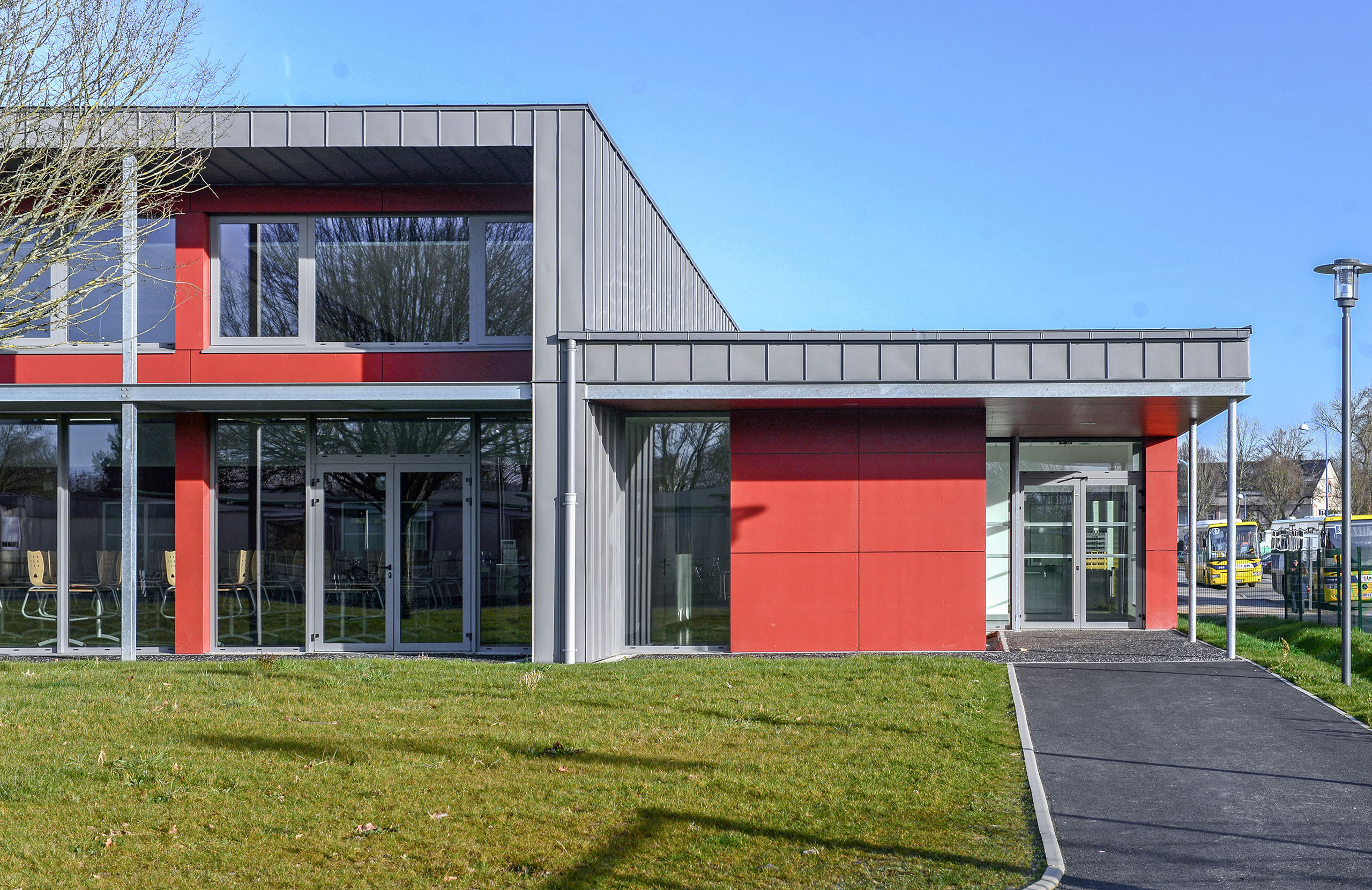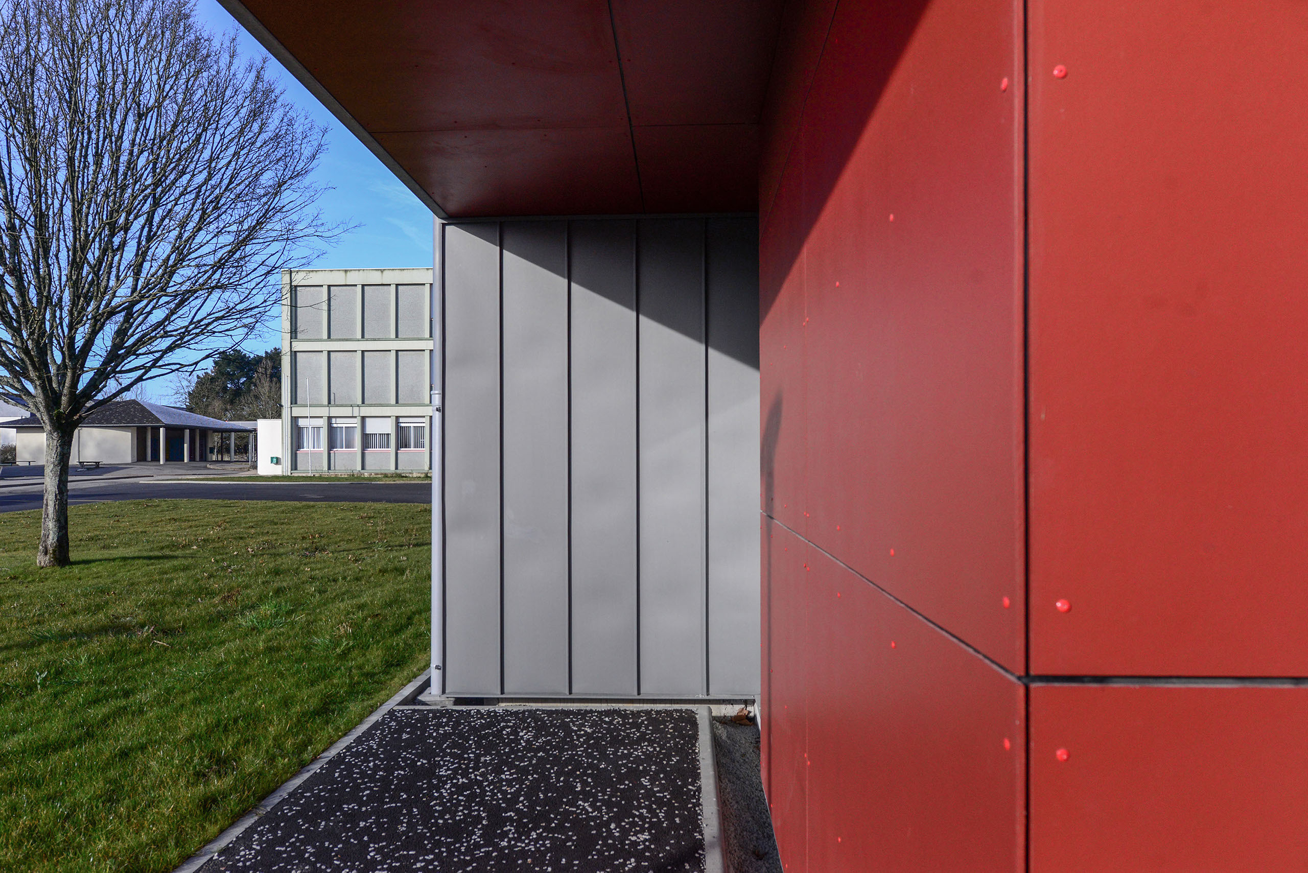 Un jeu de toitures aux pentes contrariées en zinc symbolise les accès et sorties abrités sous des bas de pentes alors que le volume principal de la salle de restaurant s’ouvre largement au sud par une toiture inverse.