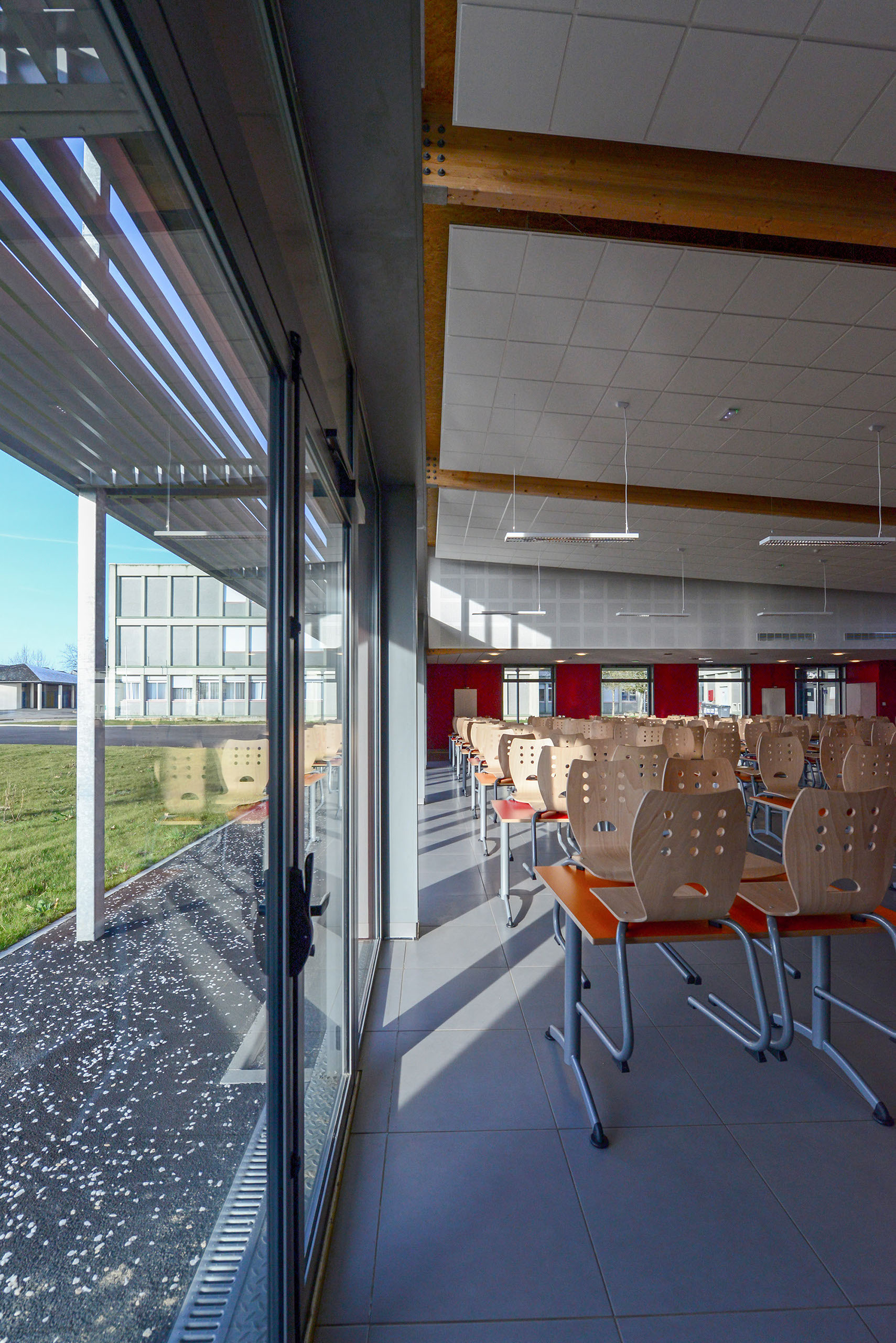 Les salles de restaurant sont largement ouvertes au sud avec de grandes baies à l’ensoleillement maîtrisé par des brise-soleil, et des débords de toiture.