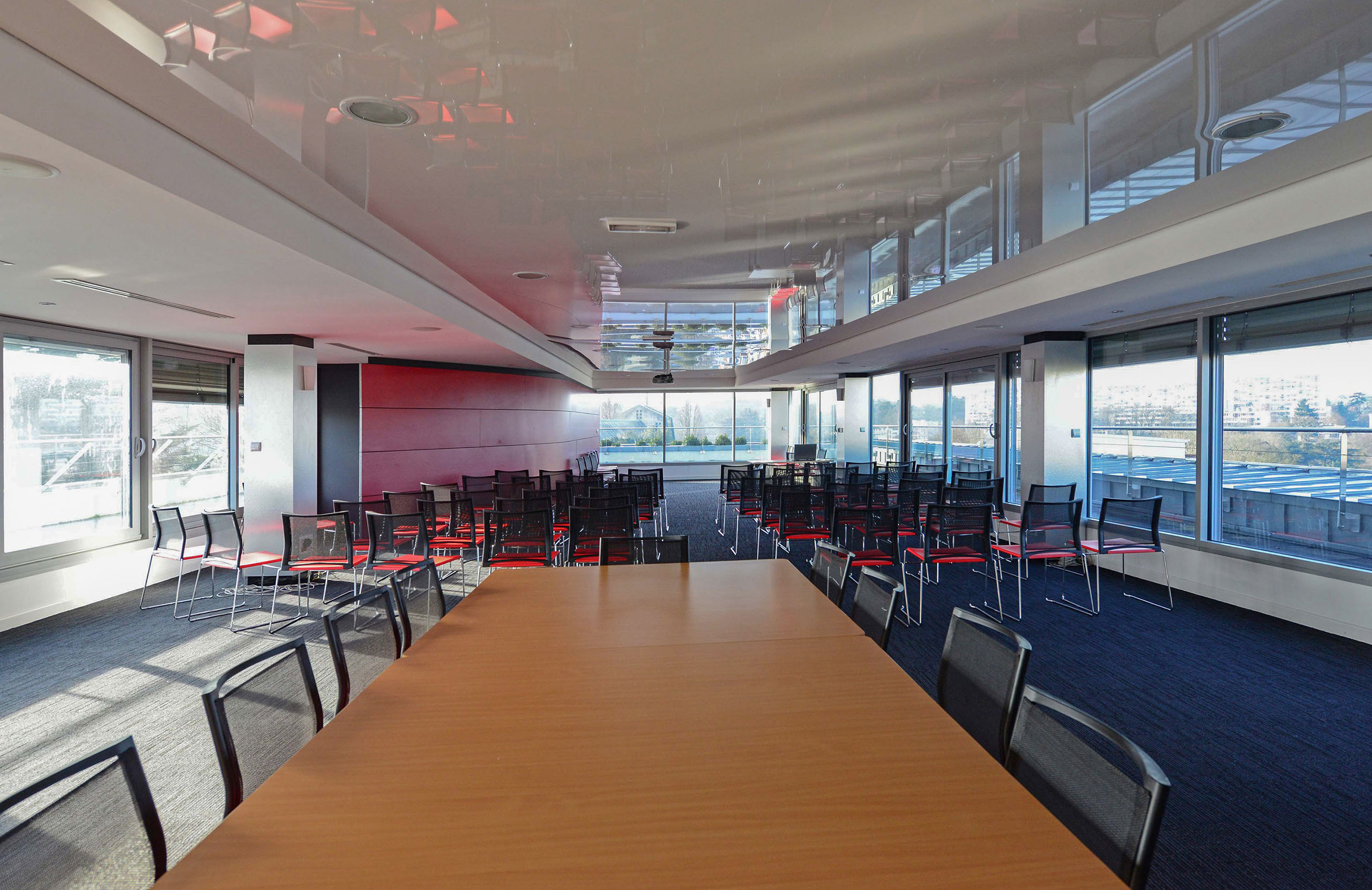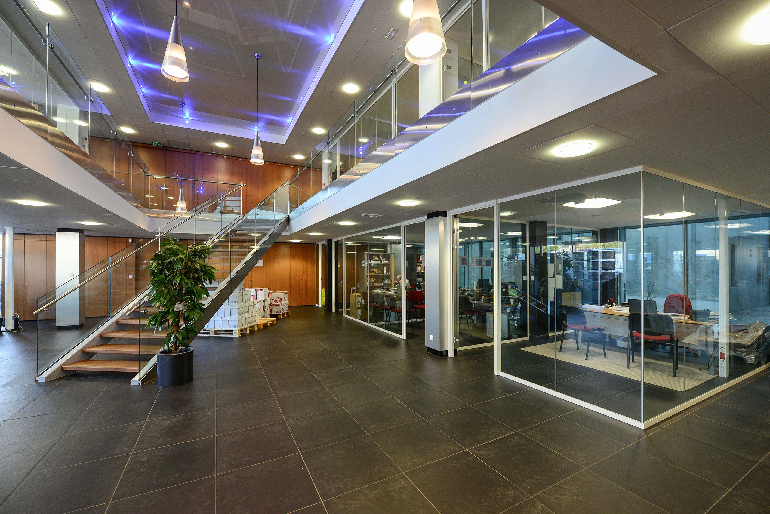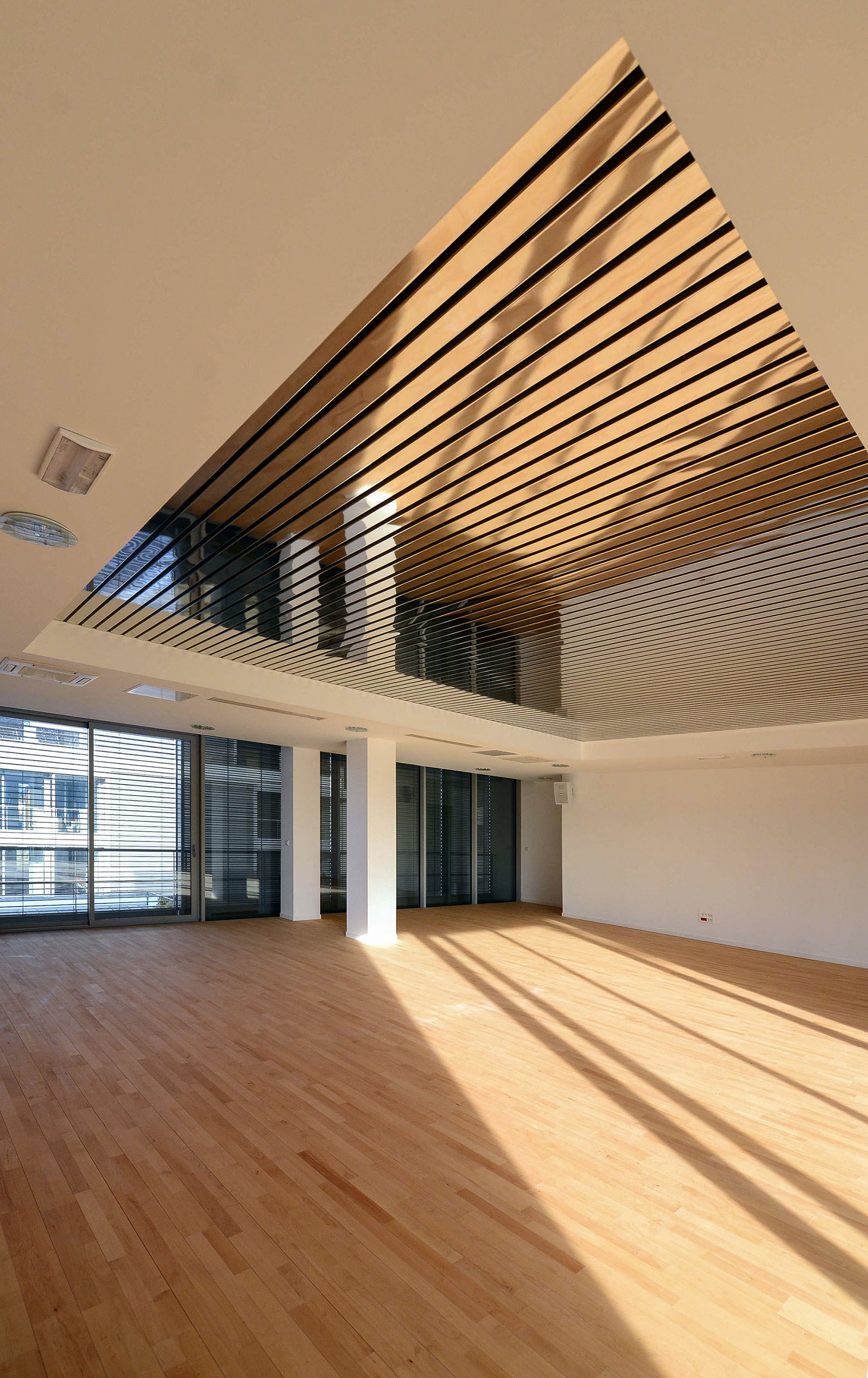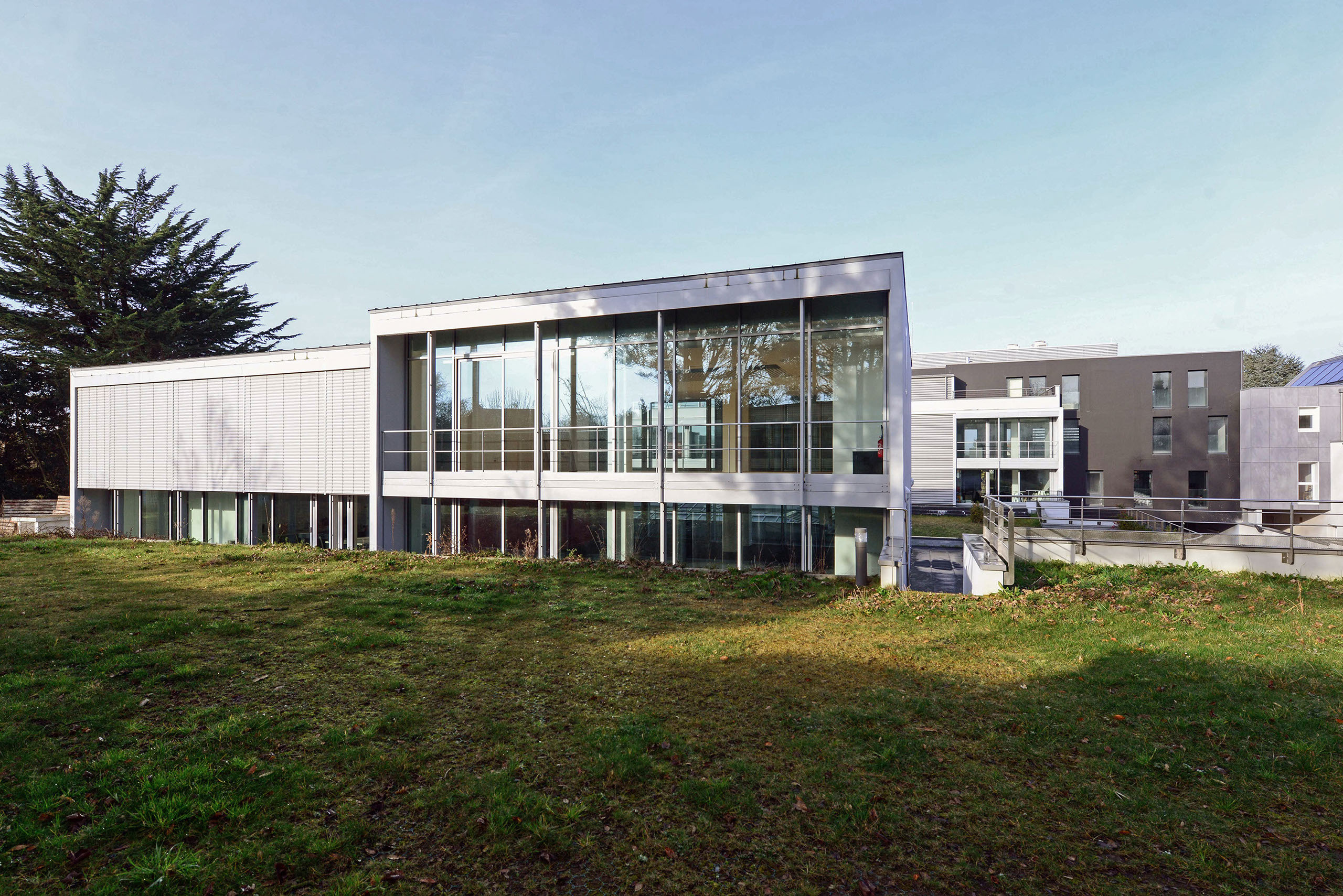 Le deuxième bâtiment situé en retrait est traité plus sobrement et tout en légèreté sous forme d’un grand volume totalement transparent.
