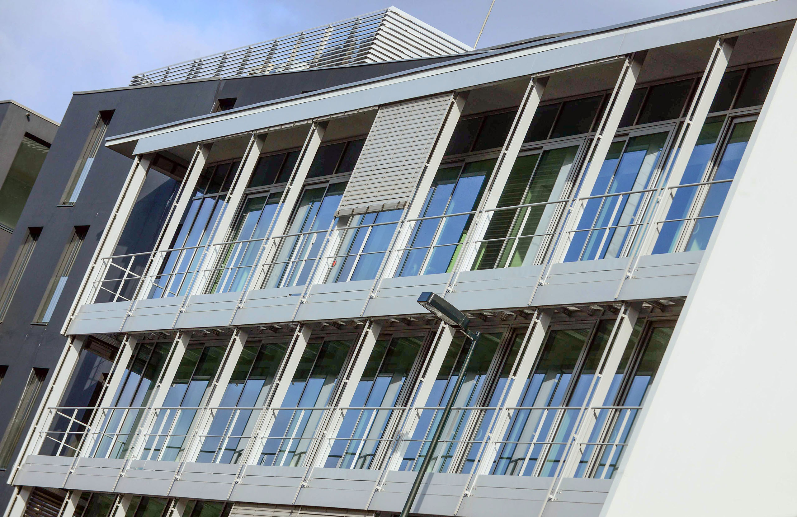 Le bâtiment se compose ainsi de deux volumes distincts reposant sur un même socle et venant s’emboîter l’un dans l’autre. Ces deux volumes traités en opposition plein/vide crée une dynamique et confère à l’ensemble une dimension moins imposante.