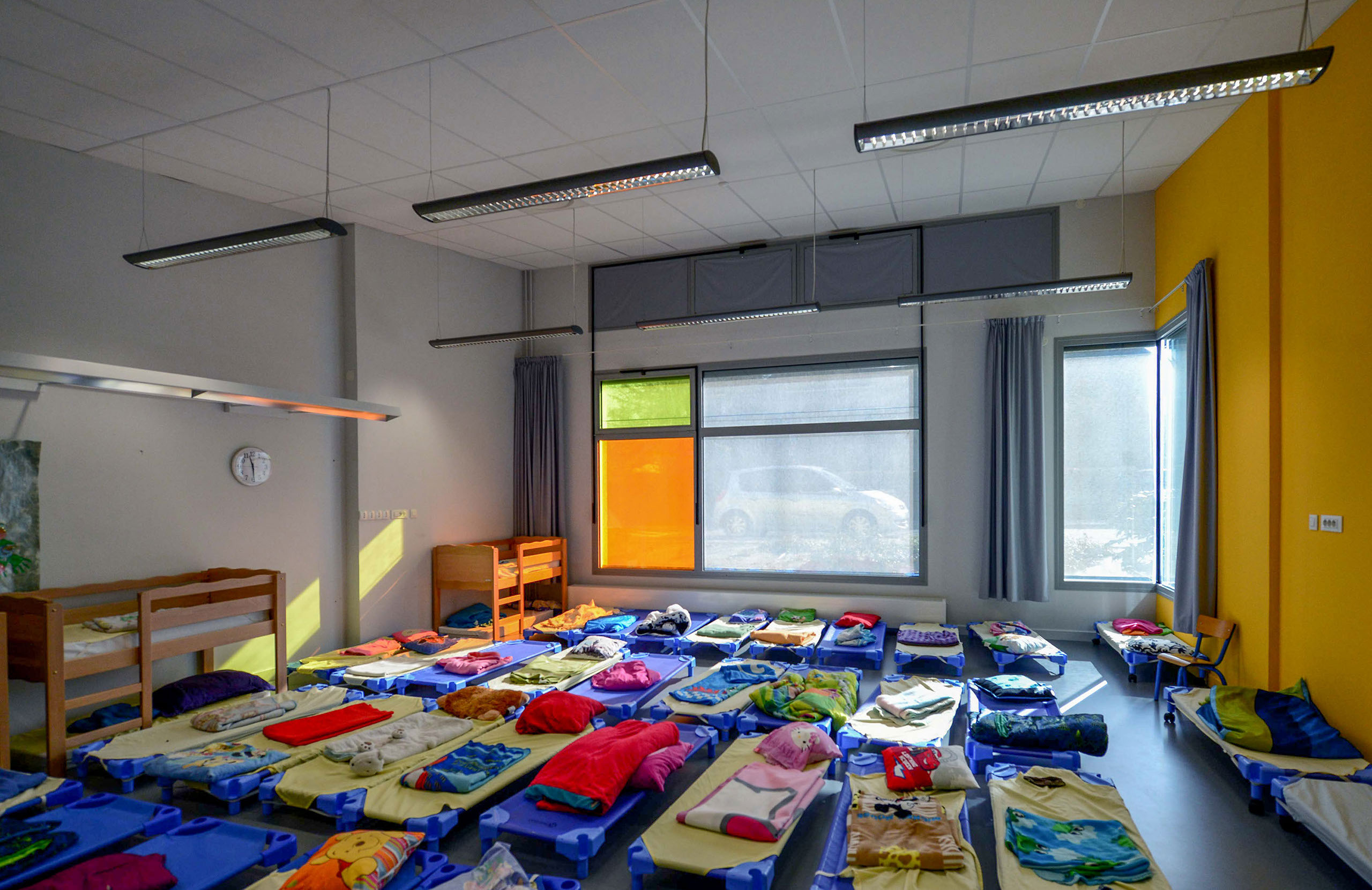 Couvert par une toiture terrasse d’où émerge en figure de proue le volume des salles de motricité, signal et clin d’oeil en même temps, enrobé dans le cylindre rassurant qui sert d’étrave à l’ensemble.