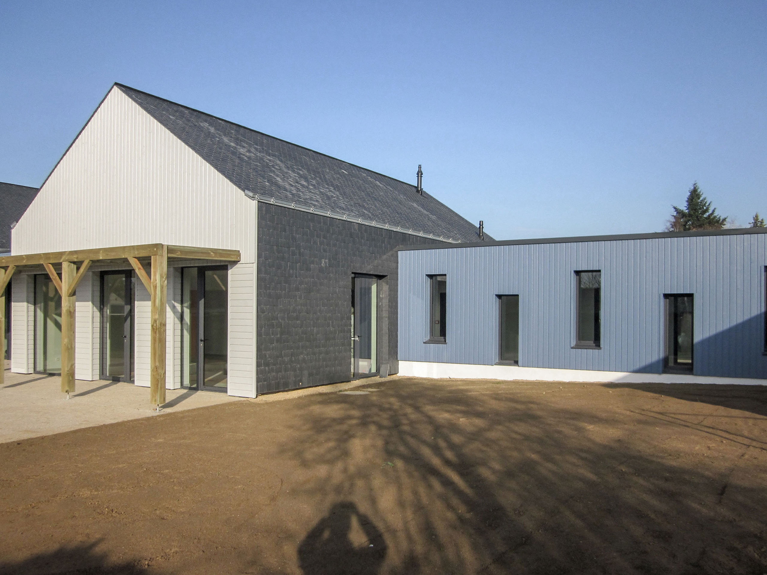 Le bâtiment, à simple rez-de-chaussée est constitué de 3 « maisons » : volumes simples aux toiture à 2 pentes orientées est et ouest évoquant les habitations environnantes, reliées par des volumes plus bas à toiture terrasse en retrait.