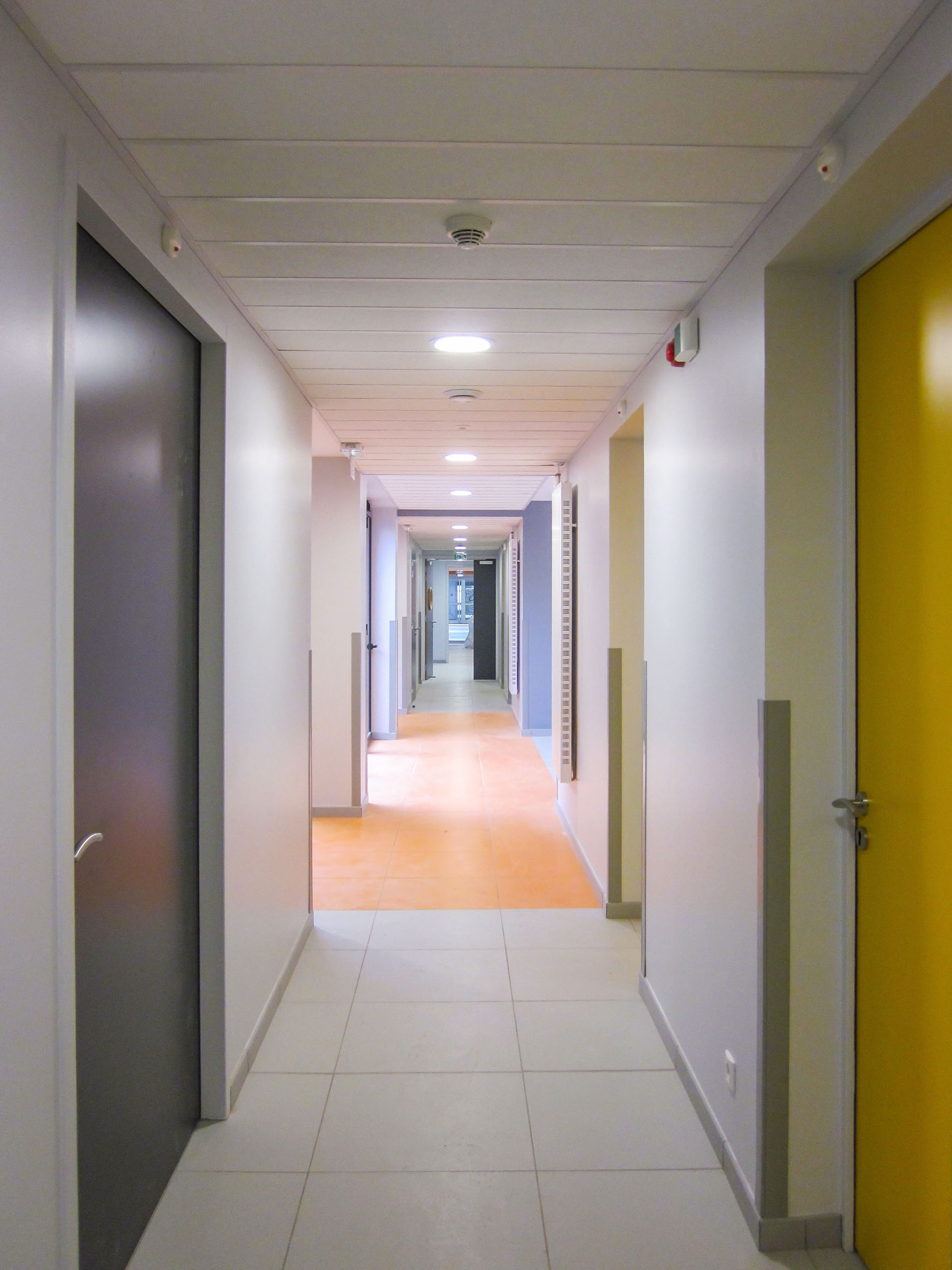 Un patio s’ouvre au centre permettant des apports de lumière naturelle dans les circulations.