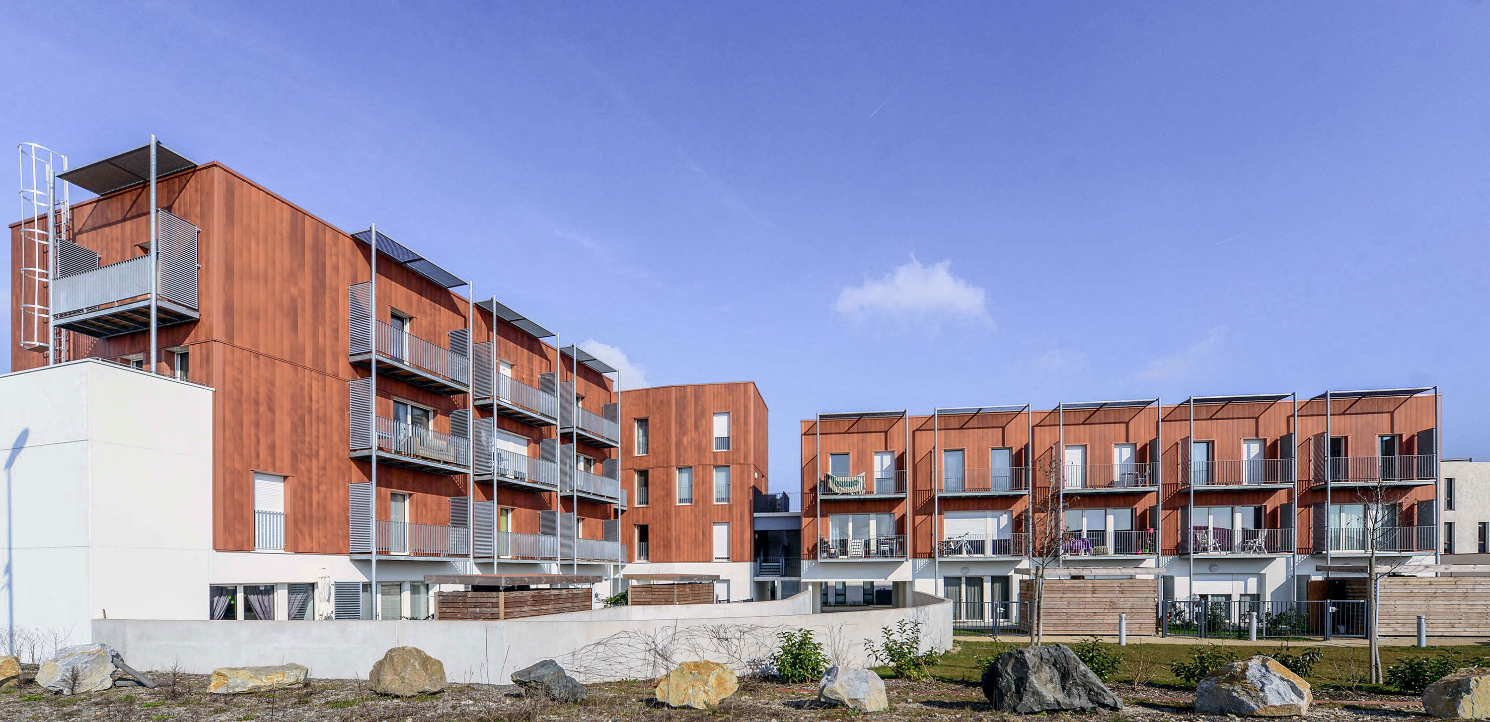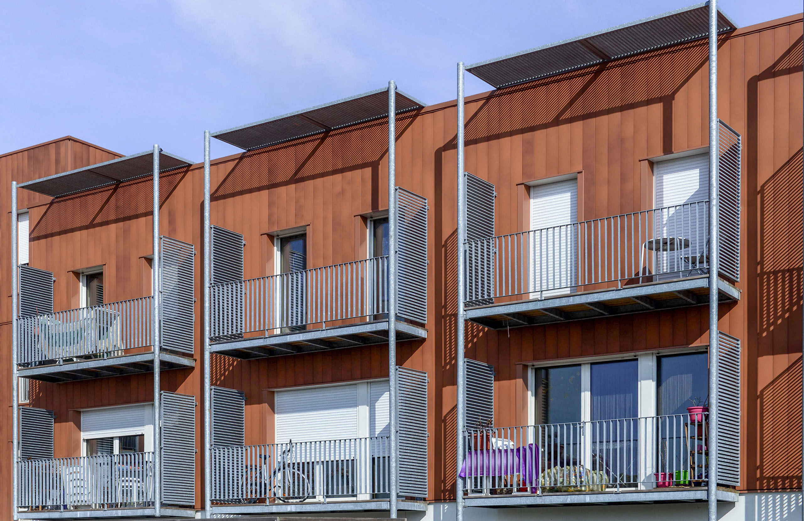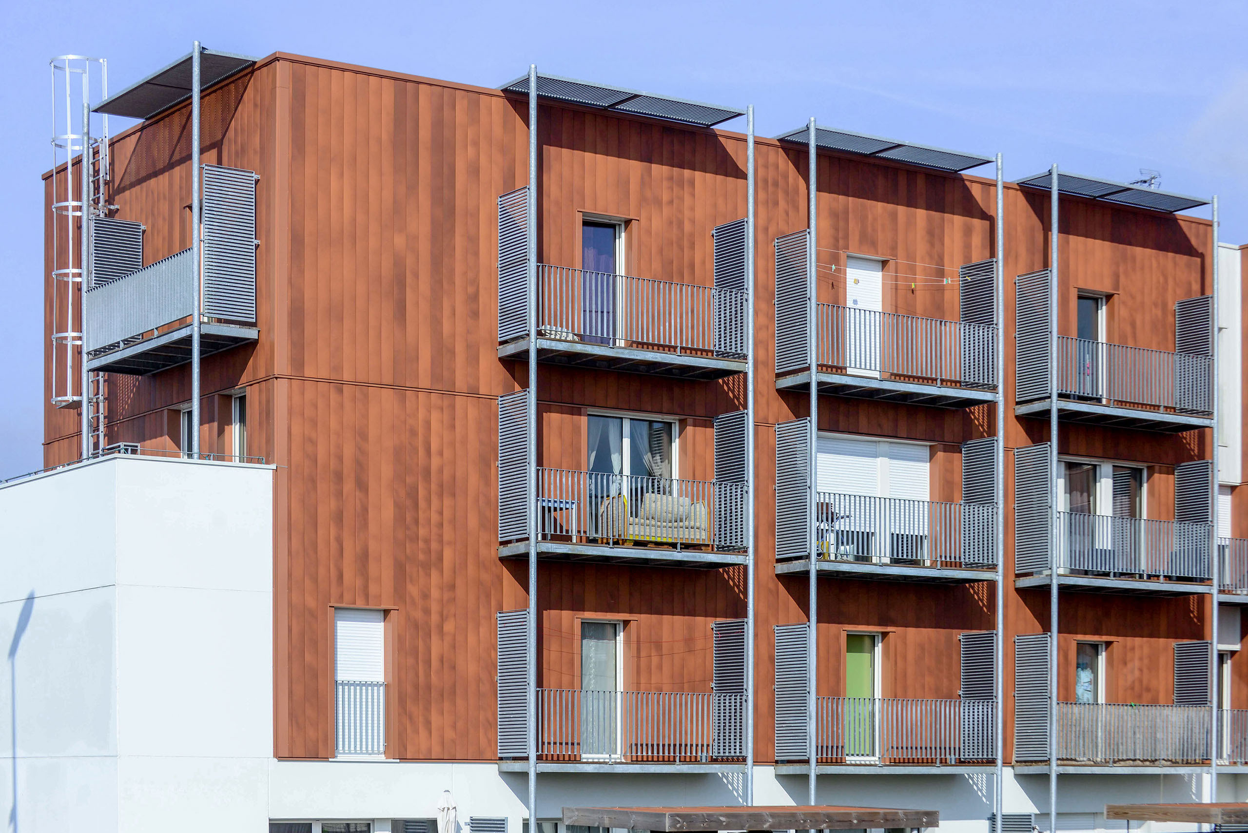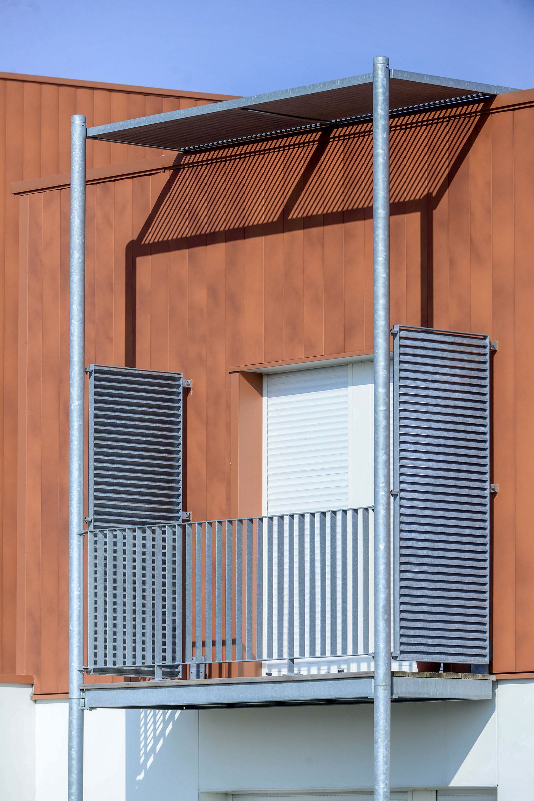 La coursive vient ainsi scindé le bâtiment en deux parties constitué par un socle traité en voile béton peint surmonté par le corps du bâtiment traité par un bardage métal. Cette césure en deux se généralise à l’ensemble des bâtiments assurant ainsi une unité architecturale à l’opération tout en offrant une dynamique urbaine par la déclinaison des volumes et la dualité du traitement des façades.