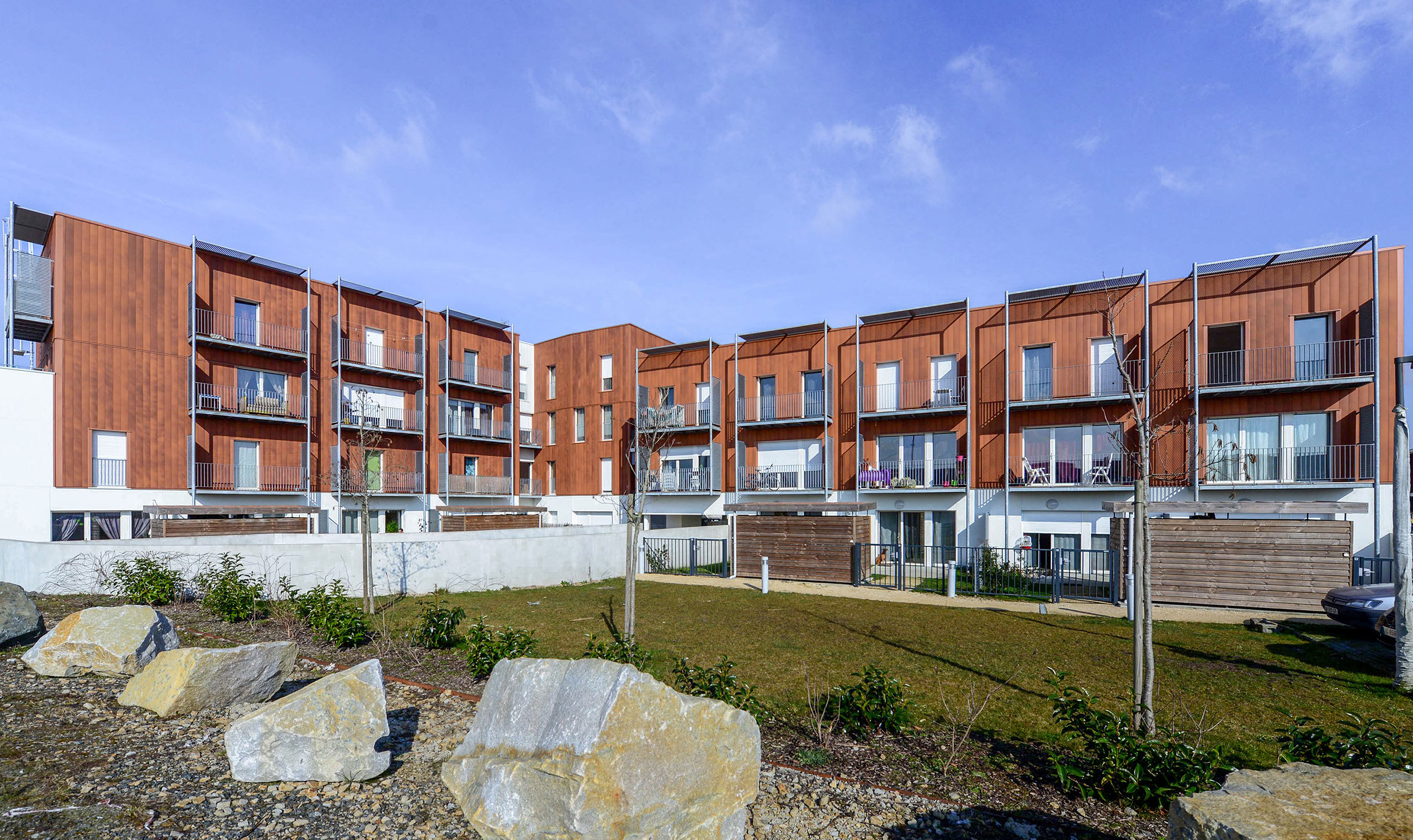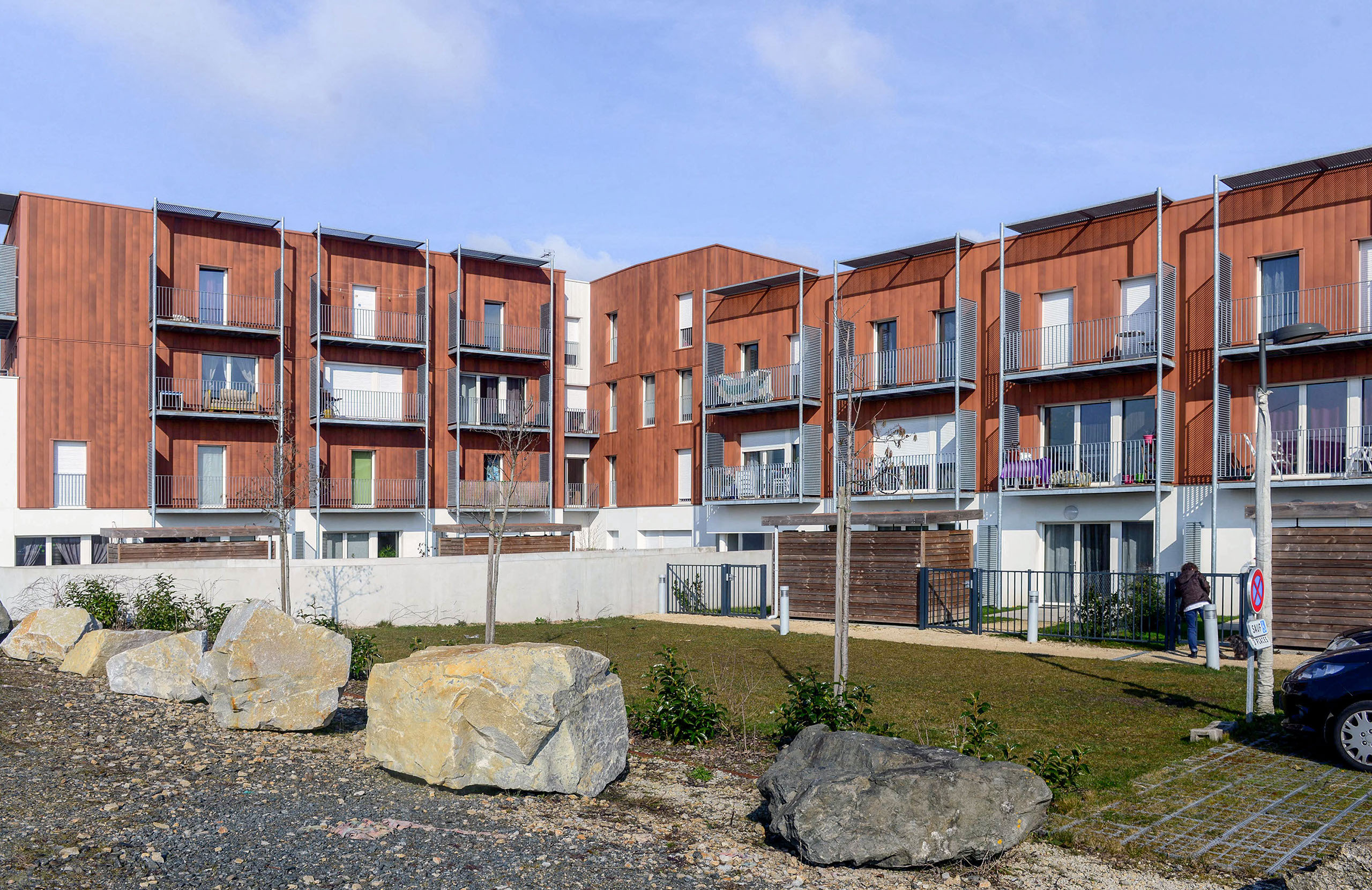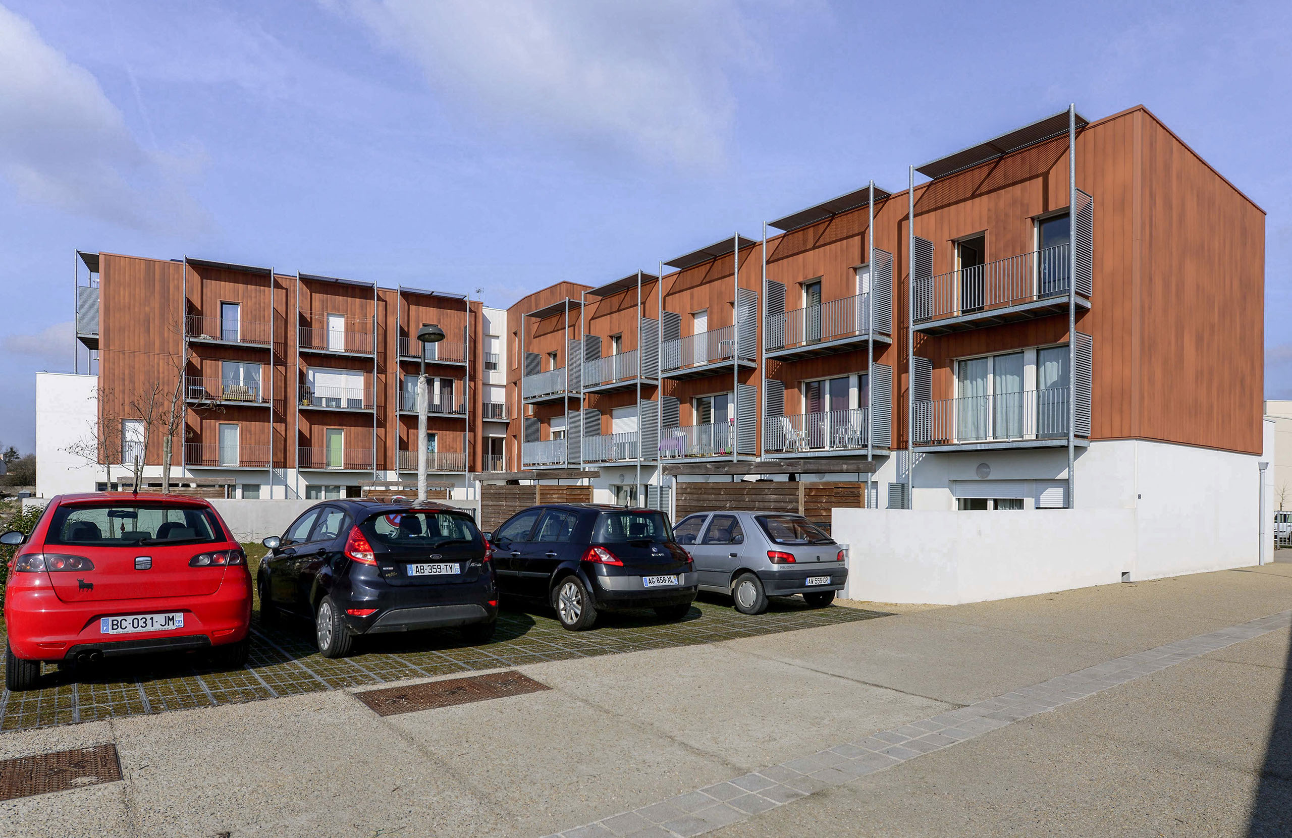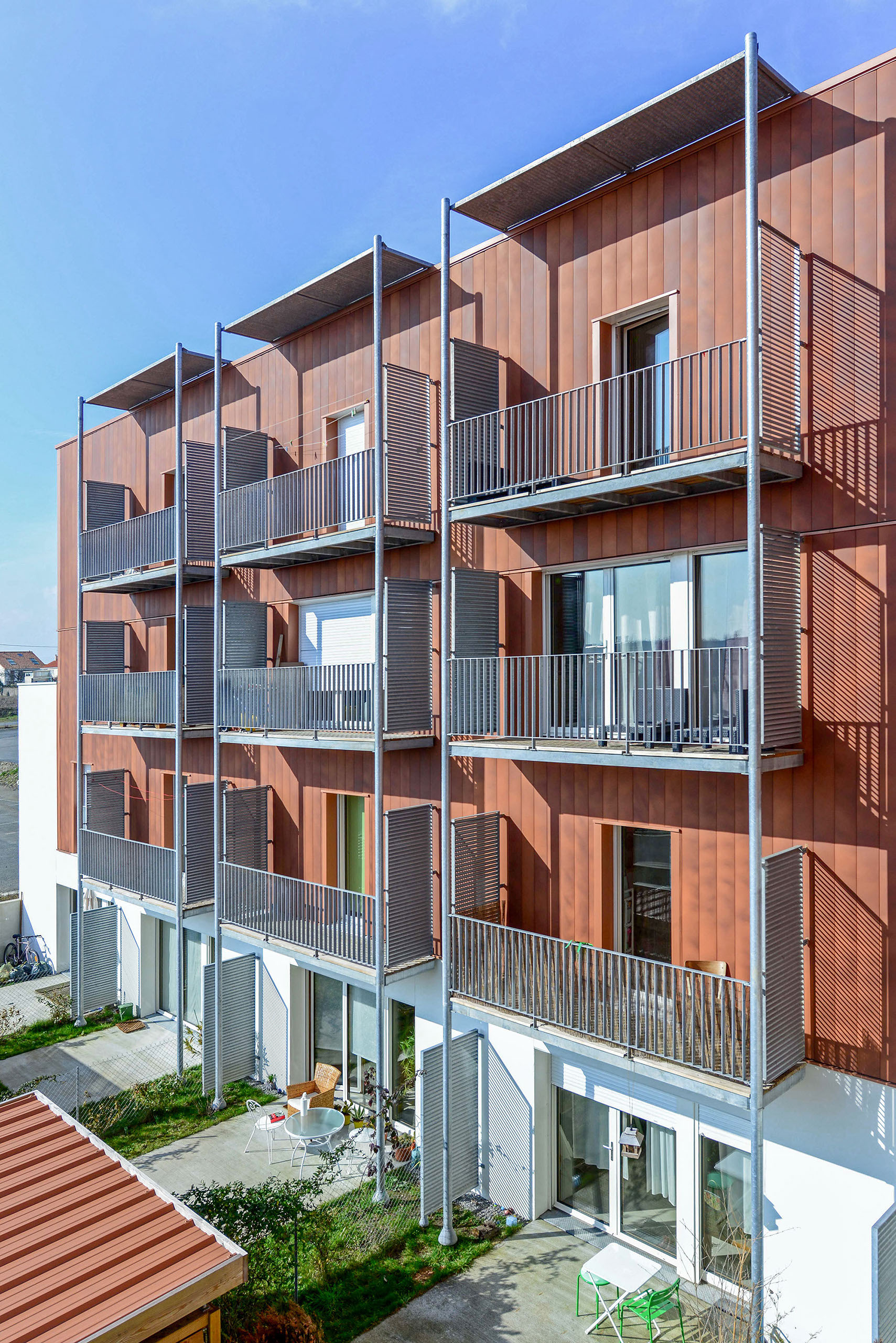 Le principe des logements repose principalement sur des logements duplex avec une coursive extérieure de distribution situé au niveau 1 et accessible par un escalier situé à l’entrée principale traversante laissant transparaitre le cœur de l’îlot tout en permettant sa traversée piétonne.