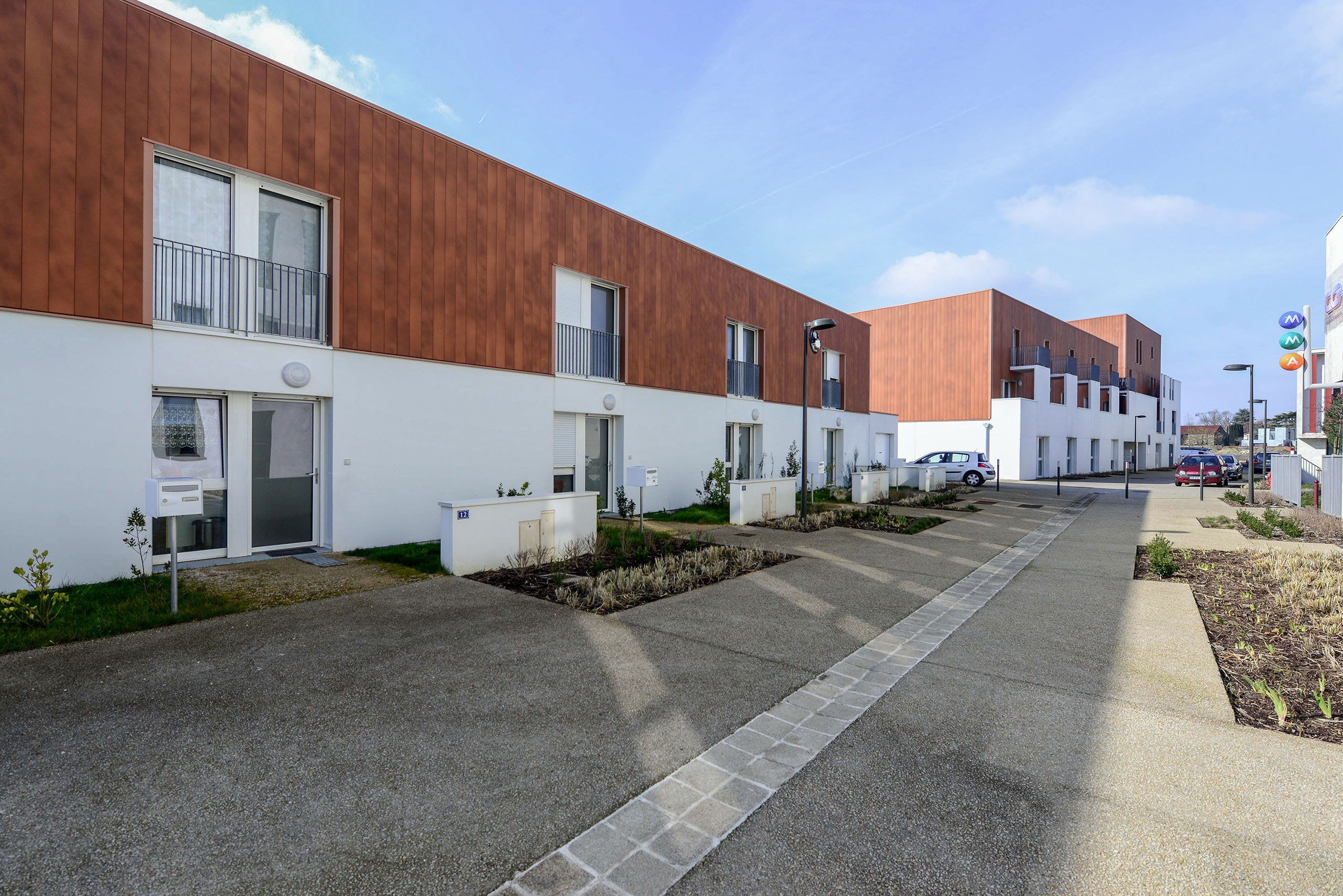 Les deux bâtiments collectifs sont en alignement sur voie avec une entrée principale centrale en jonction des deux bâtiments et jouxtant l’accès des véhicules au parking enterré.