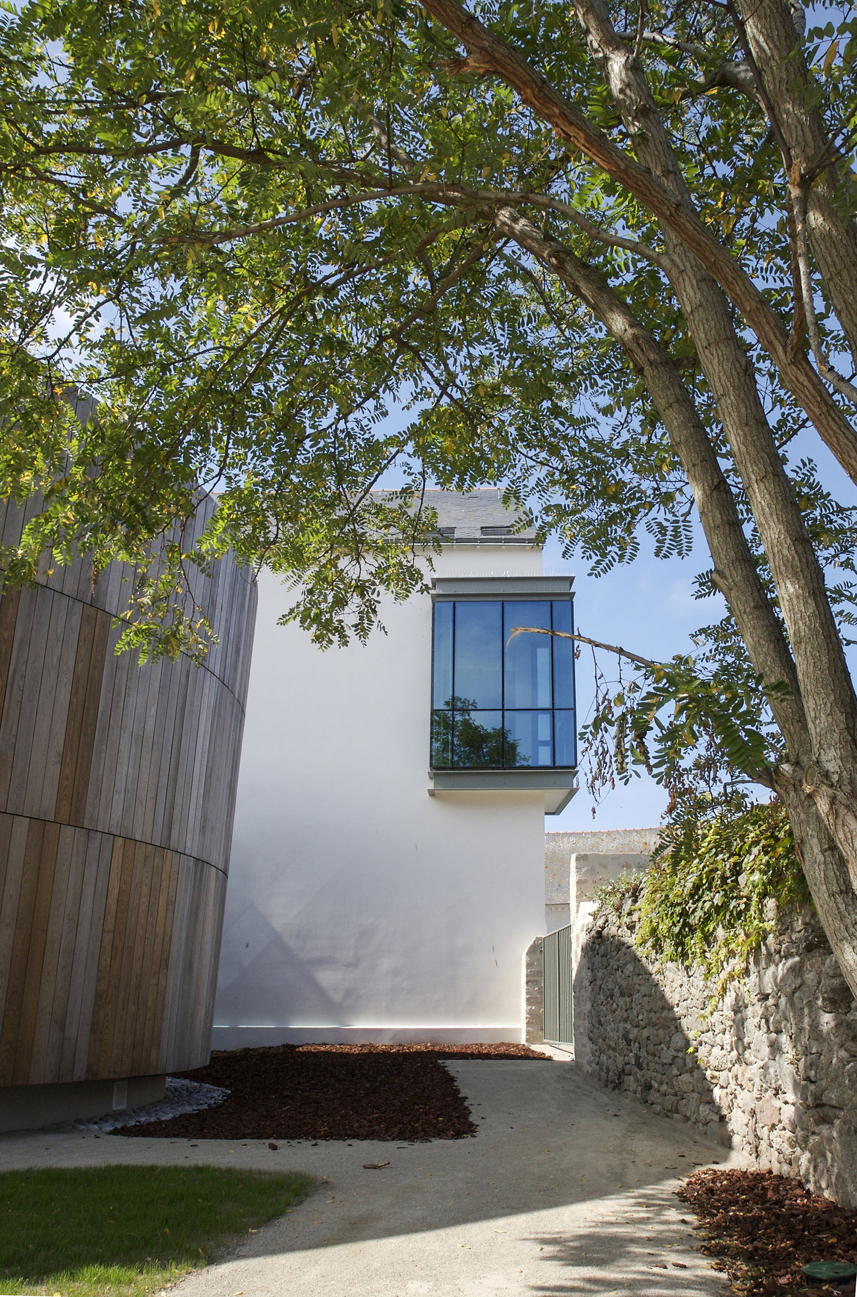 Côté jardin une architecture de forme ovoïde plus organique accueille la salle du conseil tout en faisant écho au jardin minimaliste.