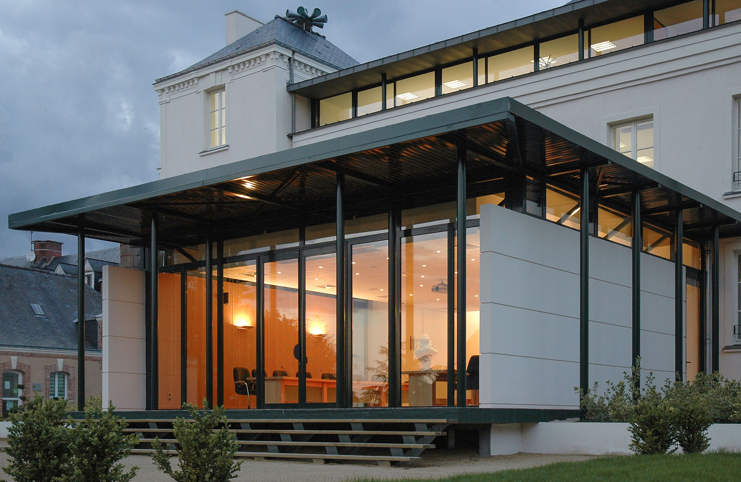 Sur l'arrière, la salle des mariages (qui est aussi celle du conseil) s'avance en avant-corps, trait d'union contemporain entre l'institution municipale et l'usage public du parc.