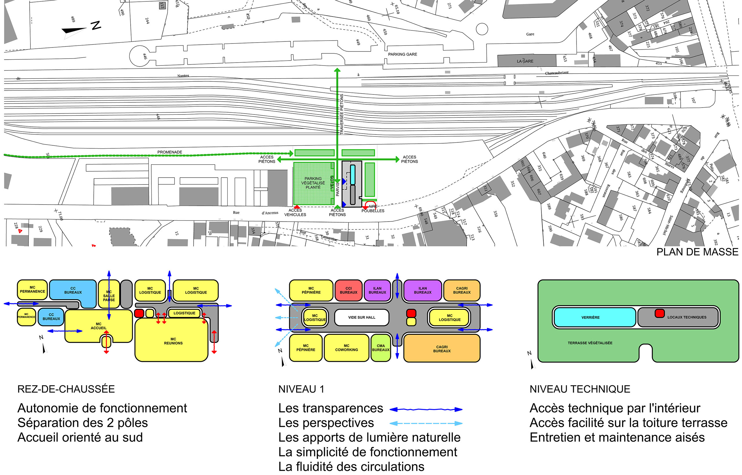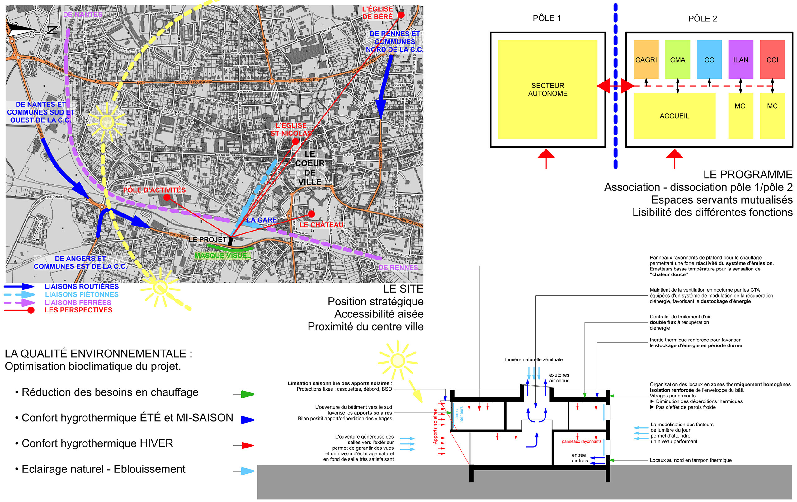 Le bâtiment se développe en longueur sur un axe est-ouest en recul important par rapport à la limite sud afin de bénéficier au maximum des apports solaires. Le pignon Est est aligné partiellement sur la rue d’Ancenis.