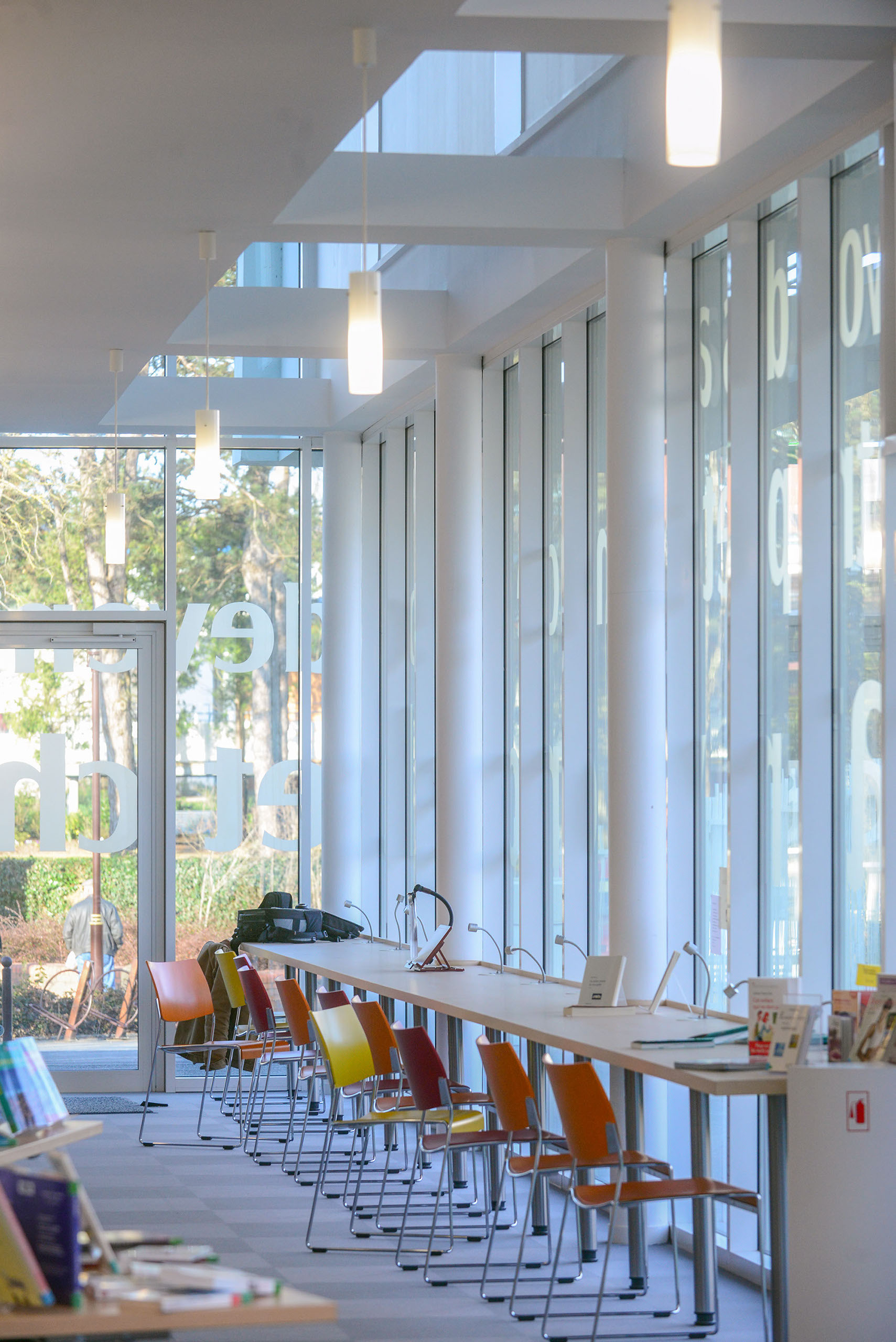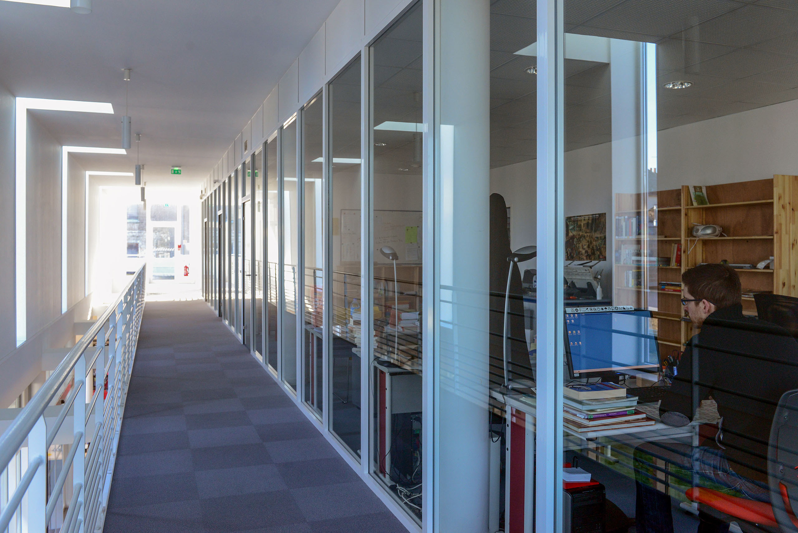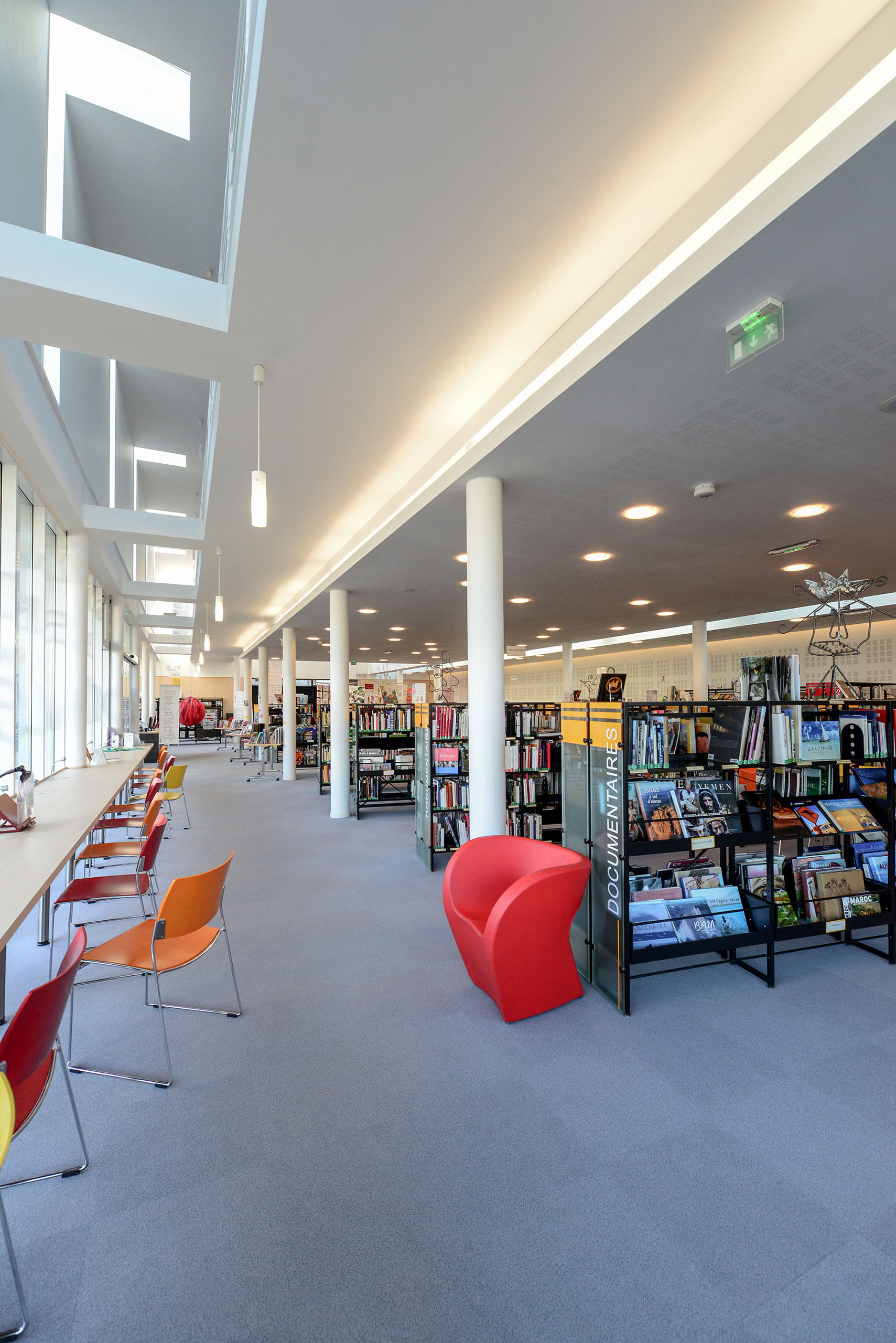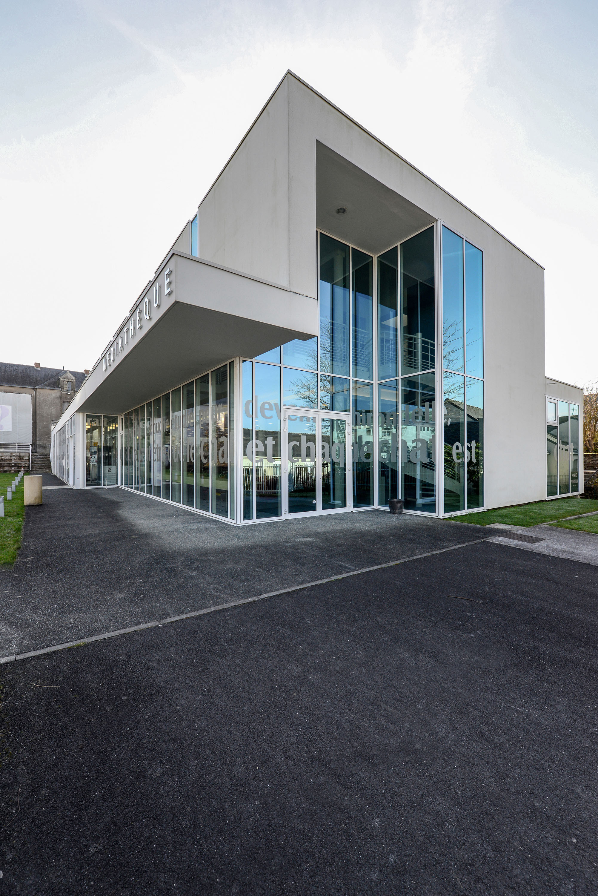 L’ensemble est traité en volumes simples et structuré de percements rythmés, très amples en RDC et comme des meurtrières à l’étage.