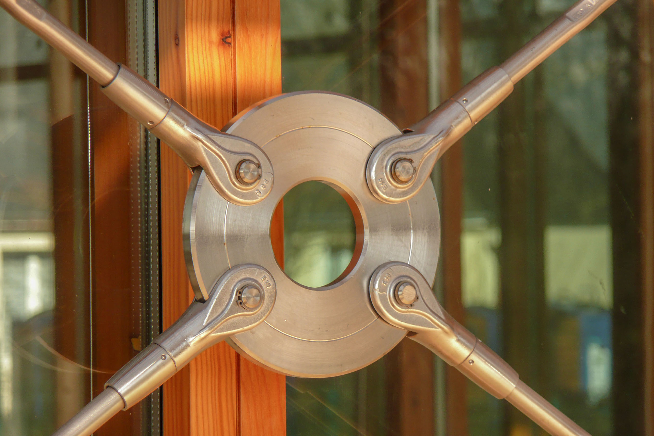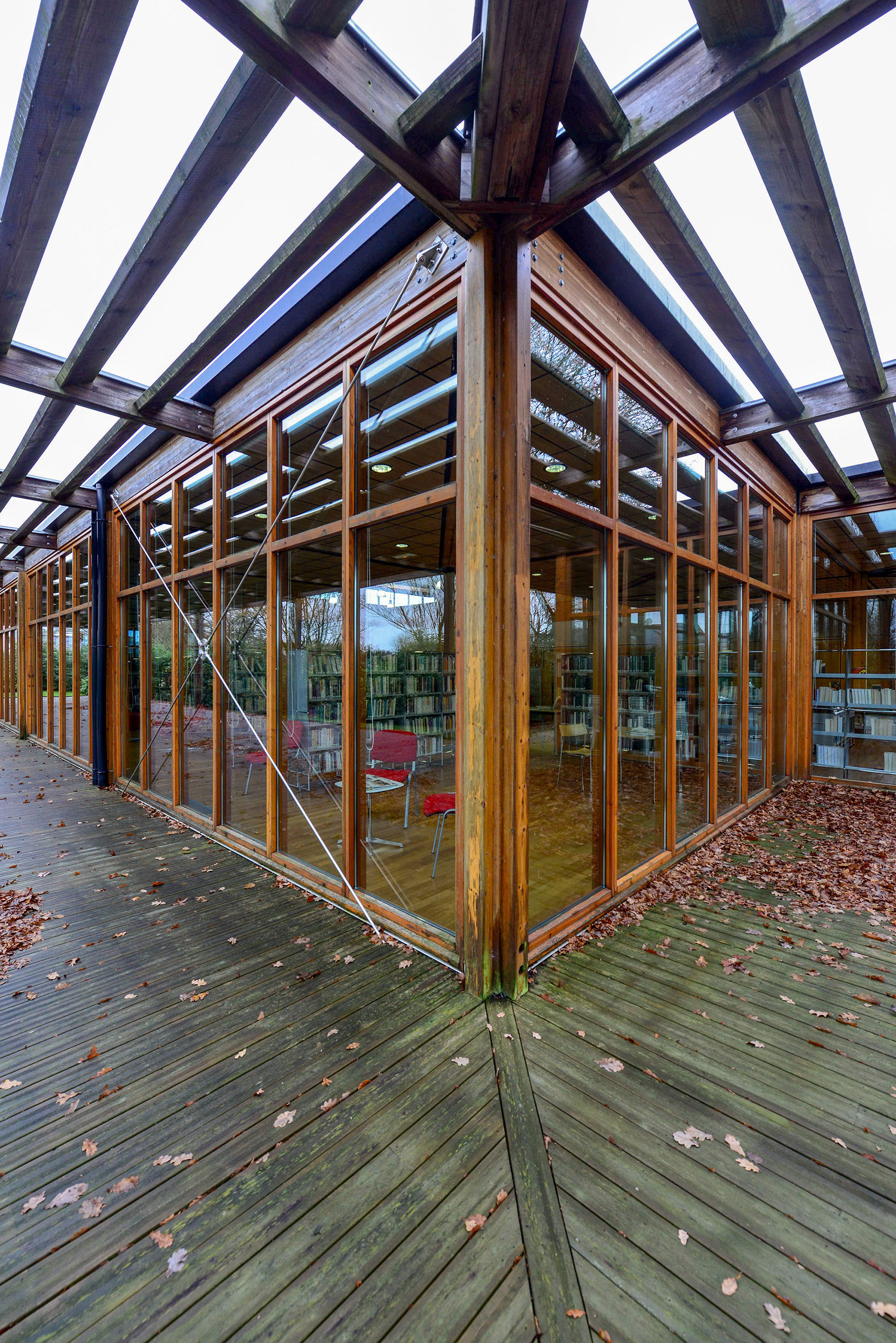 Ce kiosque, légèrement surélevé, par rapport au terrain naturel est réalisé entièrement en ossature bois avec des panneaux de bois tramés et de larges ouvertures scandées par un rythme de montants verticaux.
