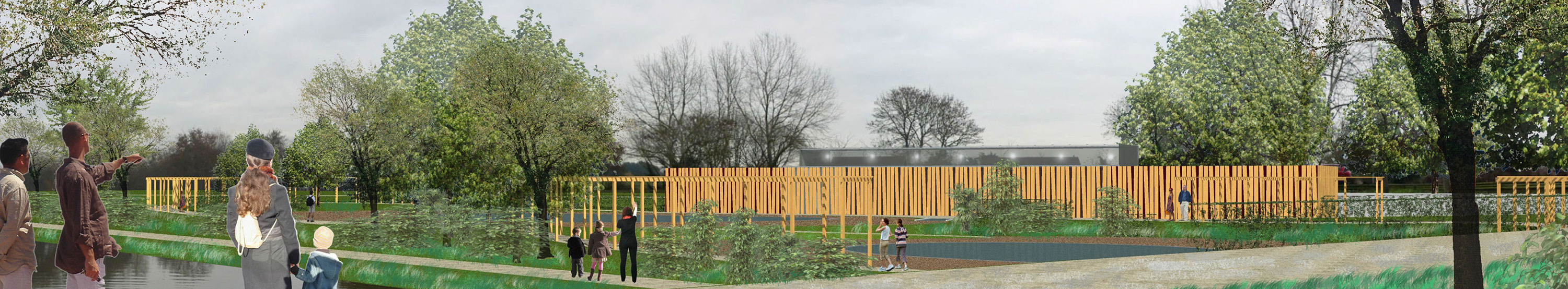 Son traitement avec du bardage bois, sa position qui profite de la différence de niveau, permet de mieux intégrer le bâtiment sur un site entièrement paysager en créant pratiquement une continuité visuelle entre l'étang et le cheminement existant à l'est.