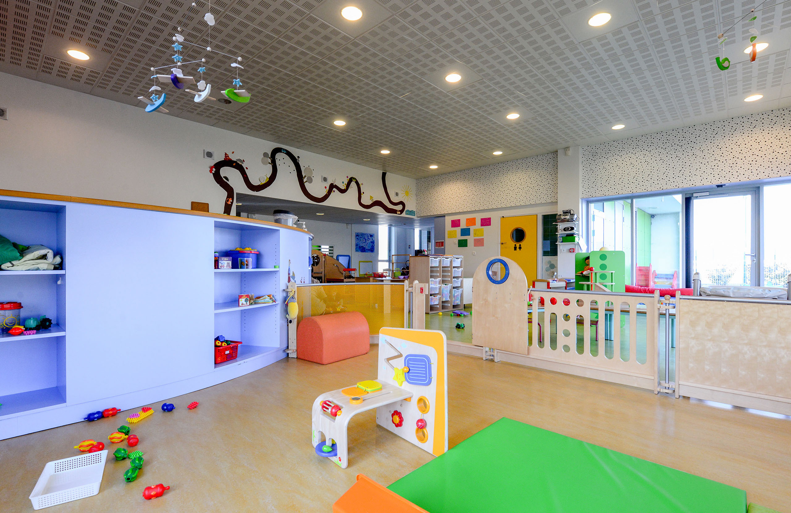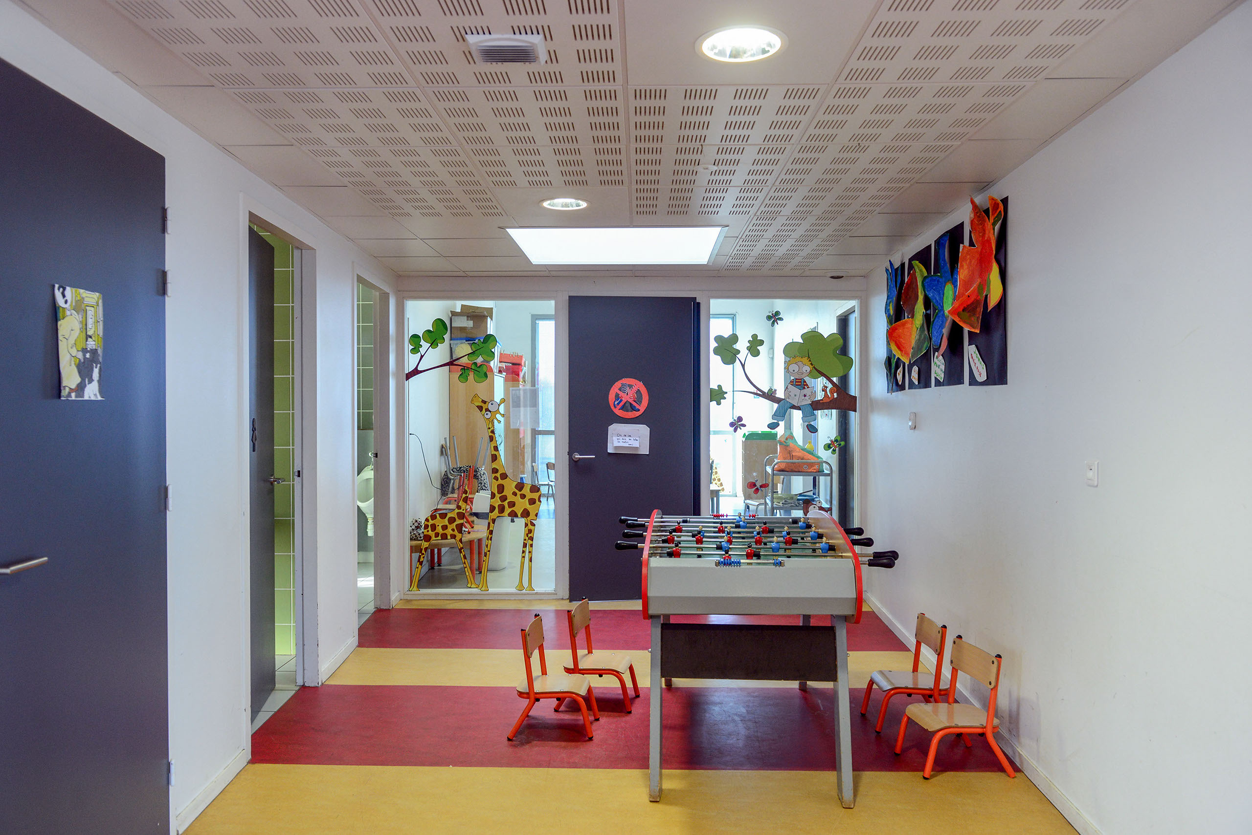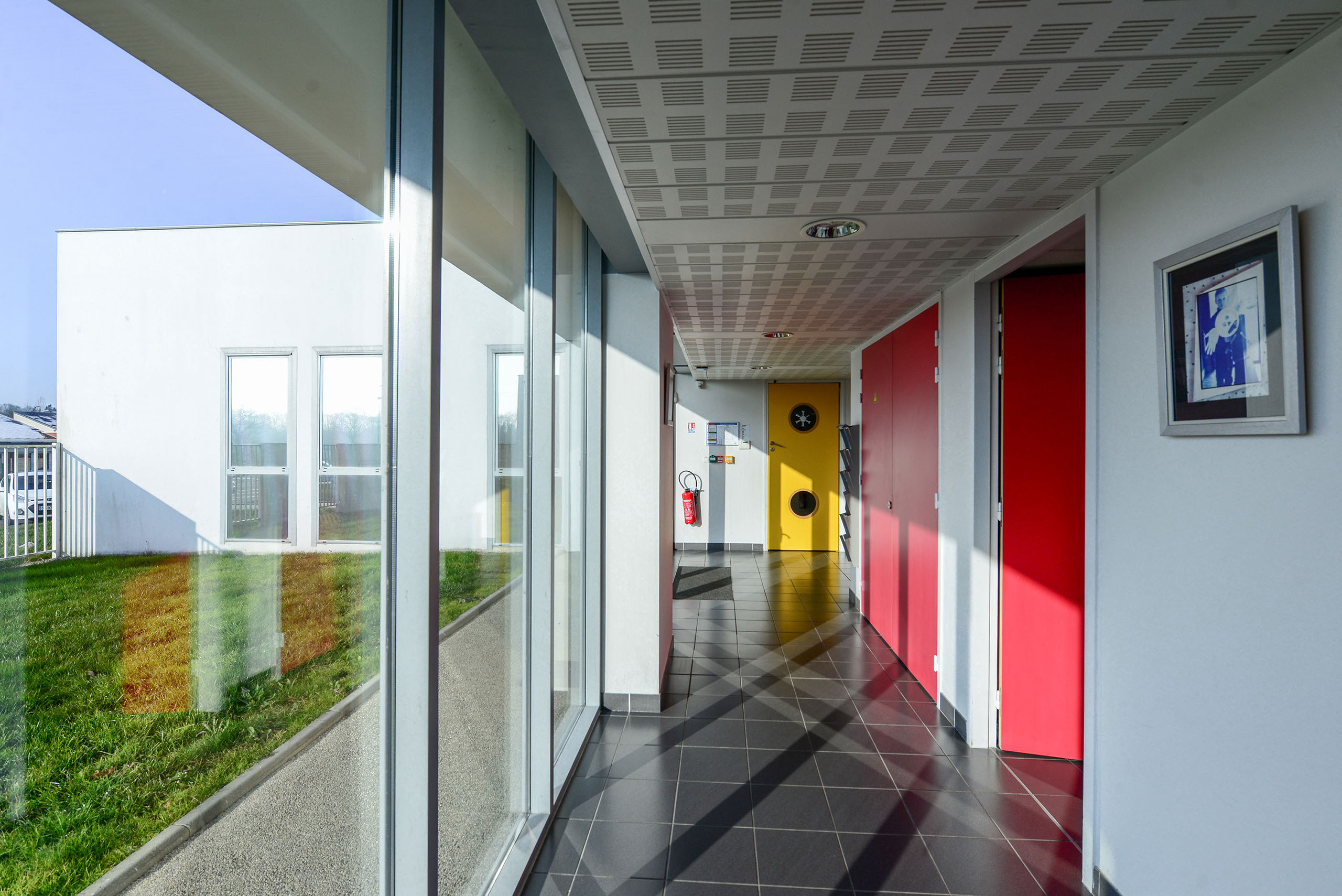 Des volumes hauts ressortent et émergent au-dessus de ces parois pour indiquer les espaces d’activités plus importants et assurer la verticalité.