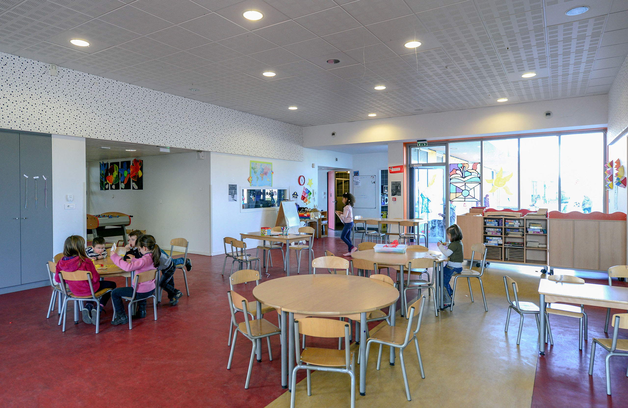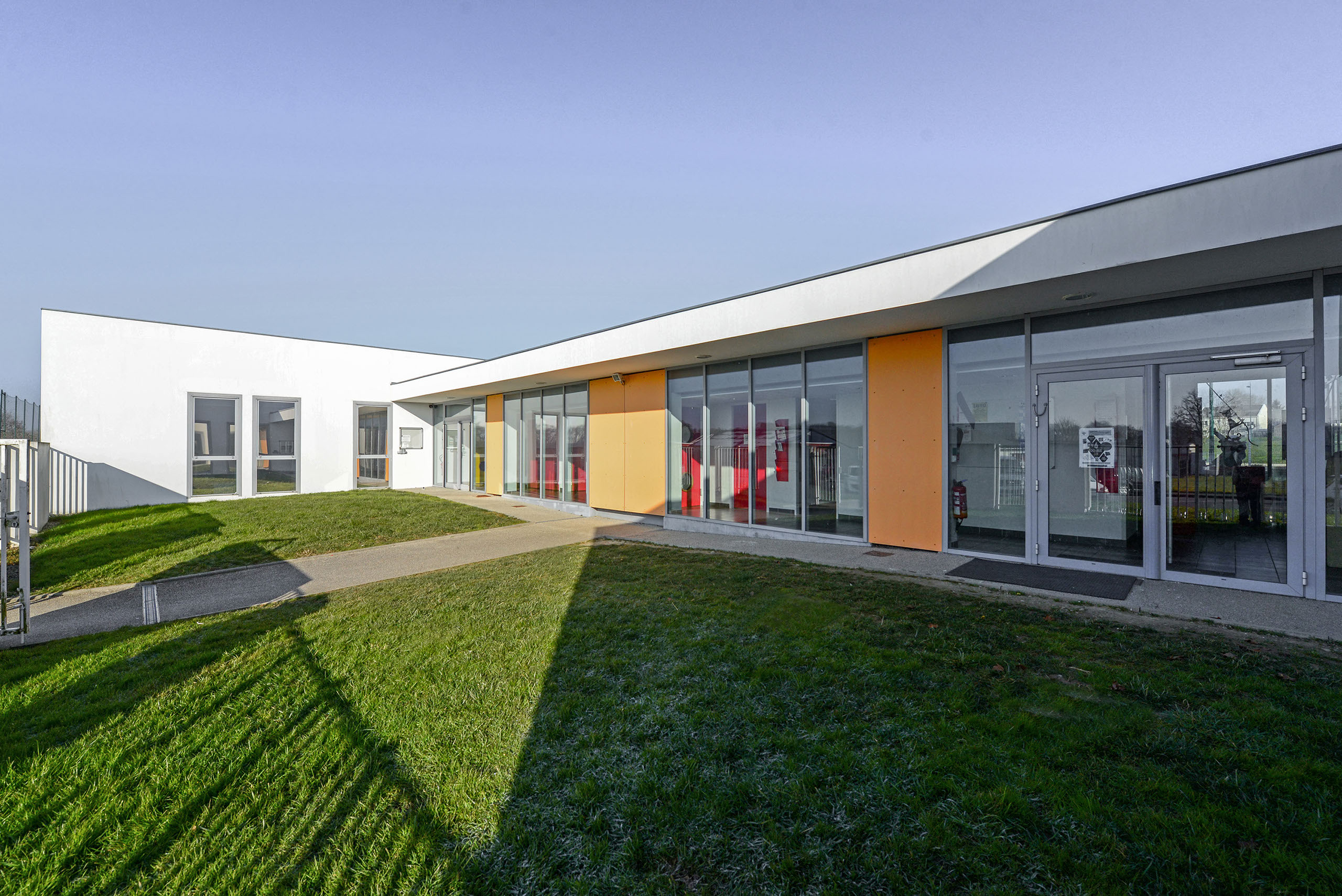 Sur ce terrain d’aspect très rural, en bordure du terrain de football et en face de l’école publique, nous prenons le parti architectural de créer un front bâti sur rue pour donner à cette dernière une consistance plus urbaine.