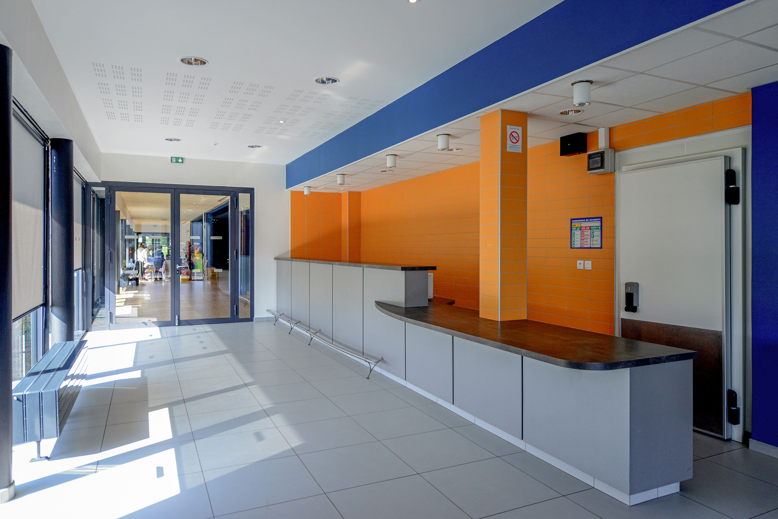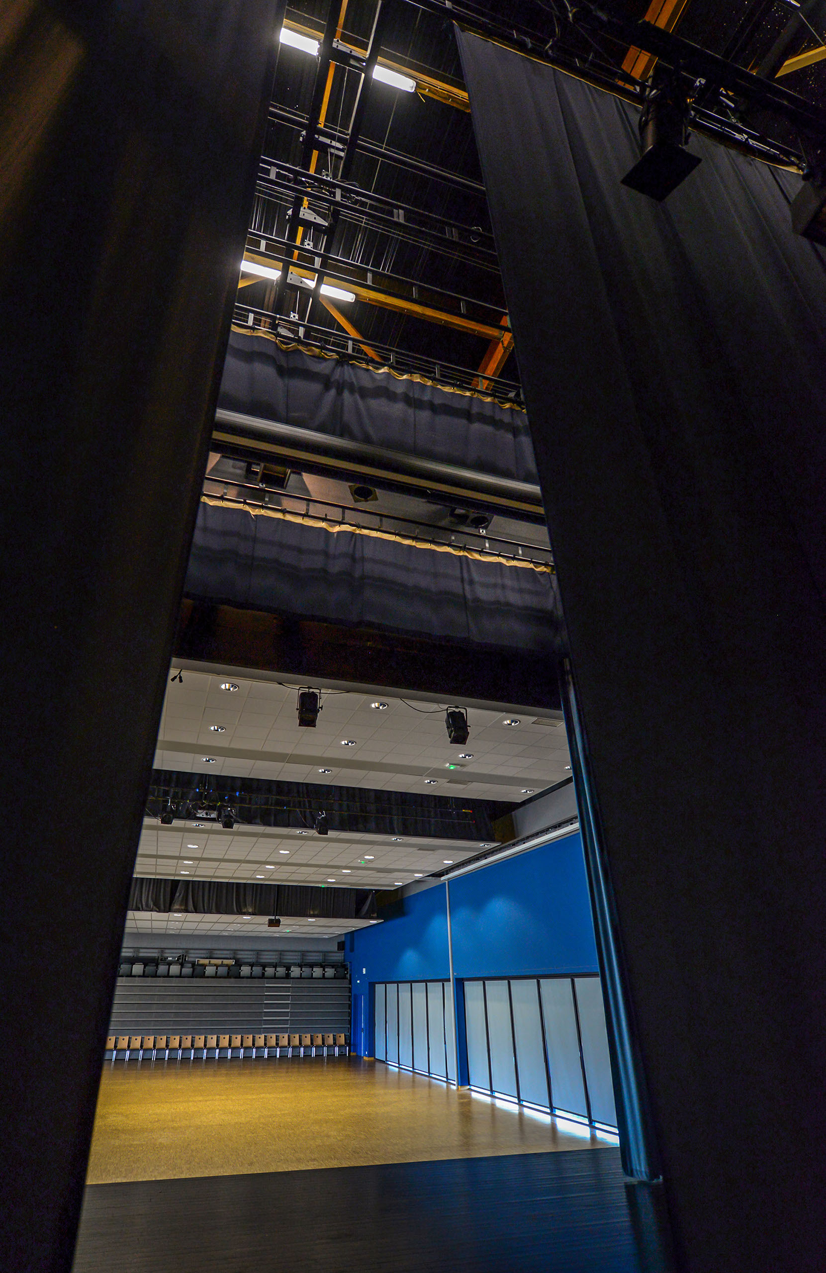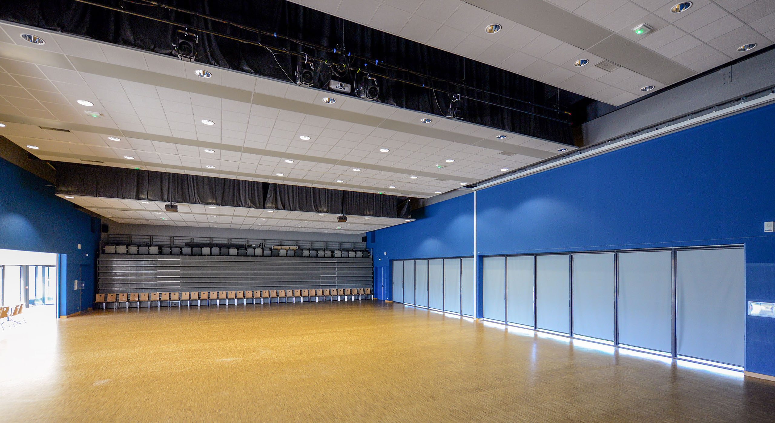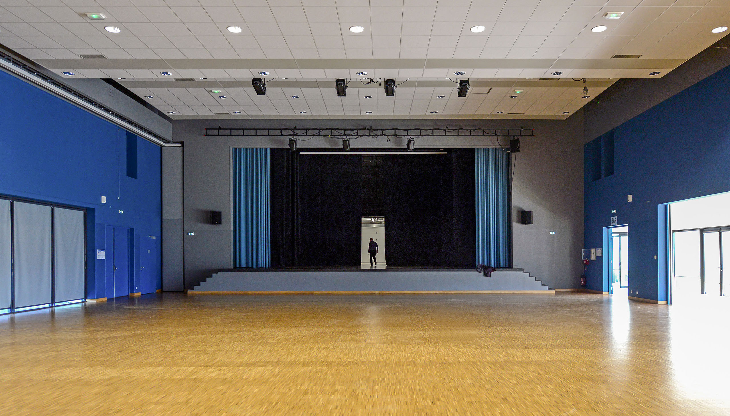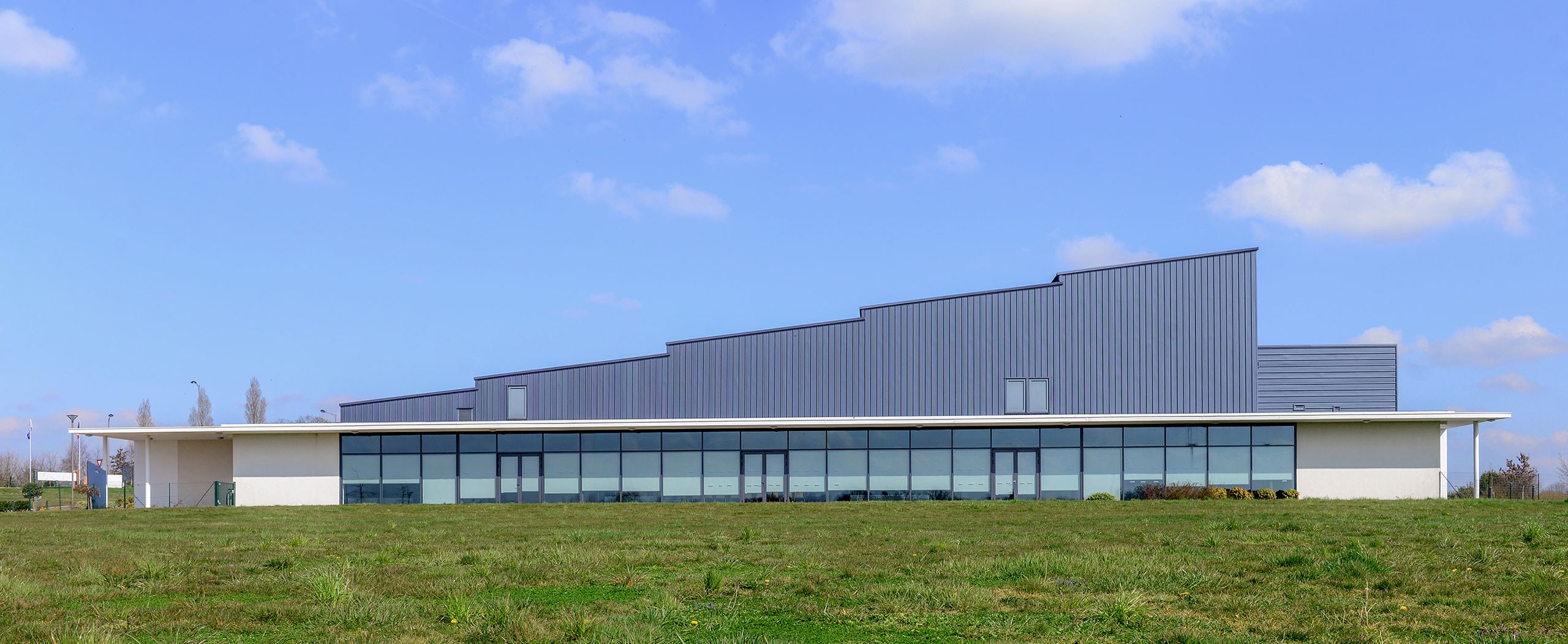 Les exigences da la salle avec sa cage de scène impose un volume haut. Pour en réduire l’impact sur l’environnement, la toiture est traitée par une toiture monopente pour en adoucir l’enveloppe. Son traitement en zinc ou tôle thermolaqué à l’identique des parois verticales de la salle assure une homogénéité et une sobriété du volume qui n’en devient que plus transparent.
