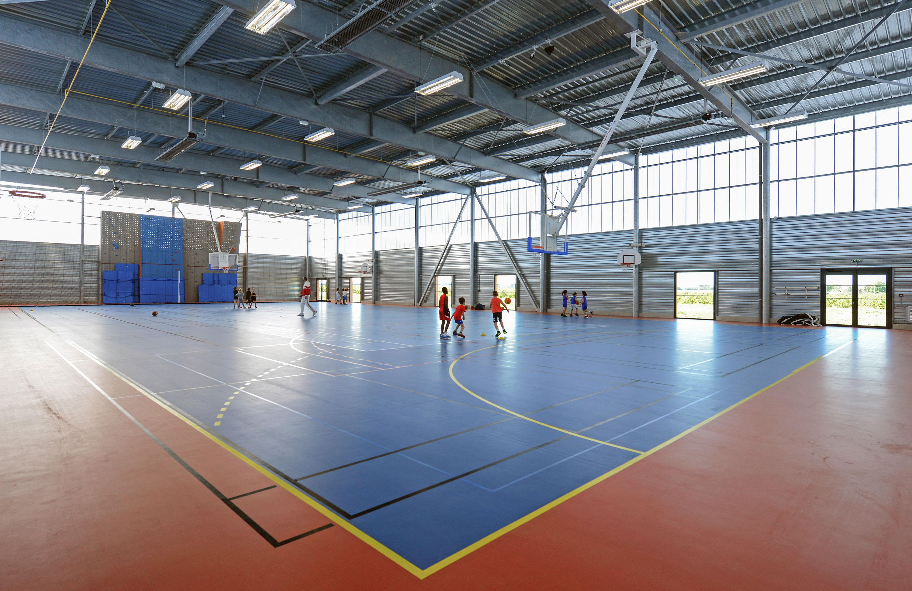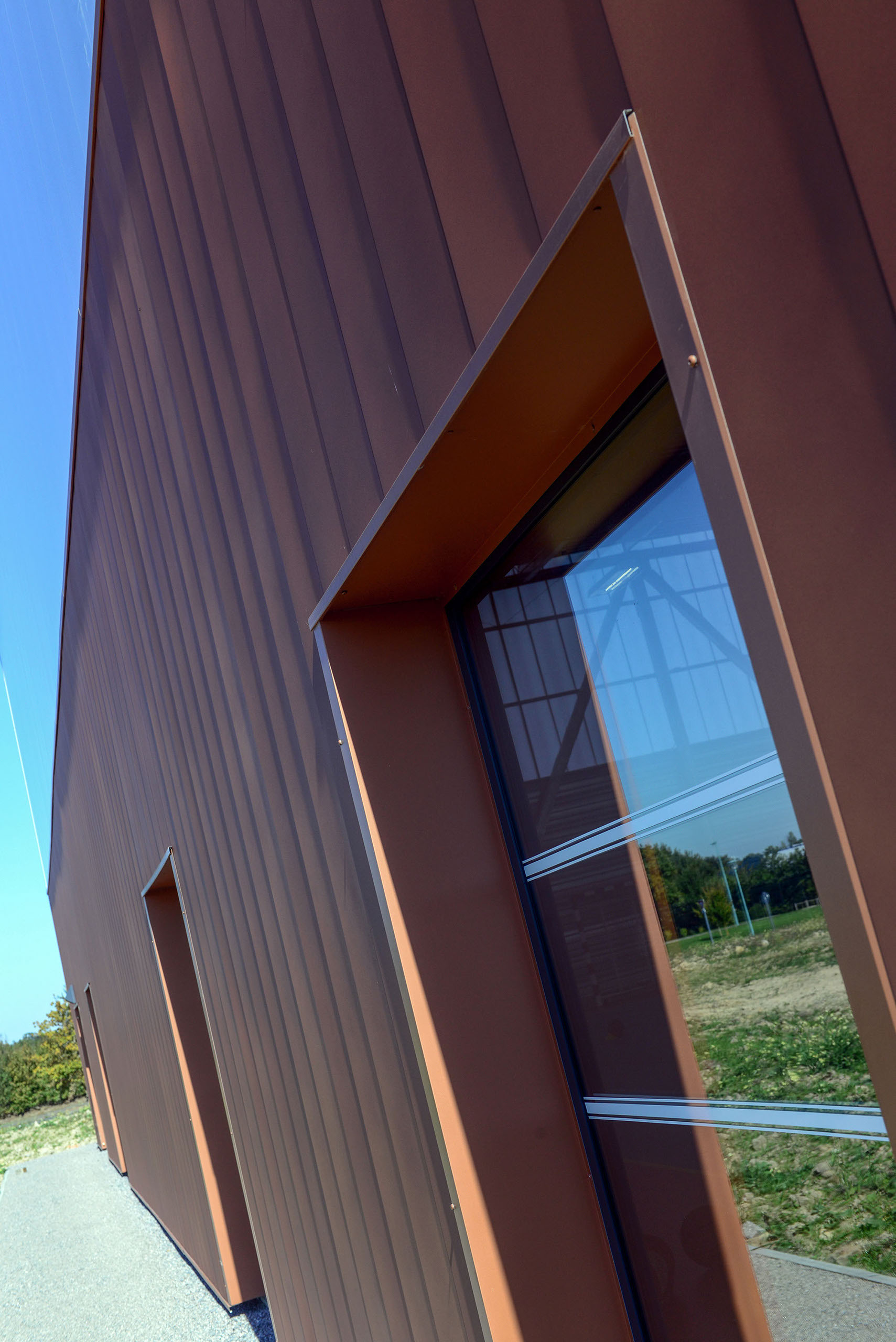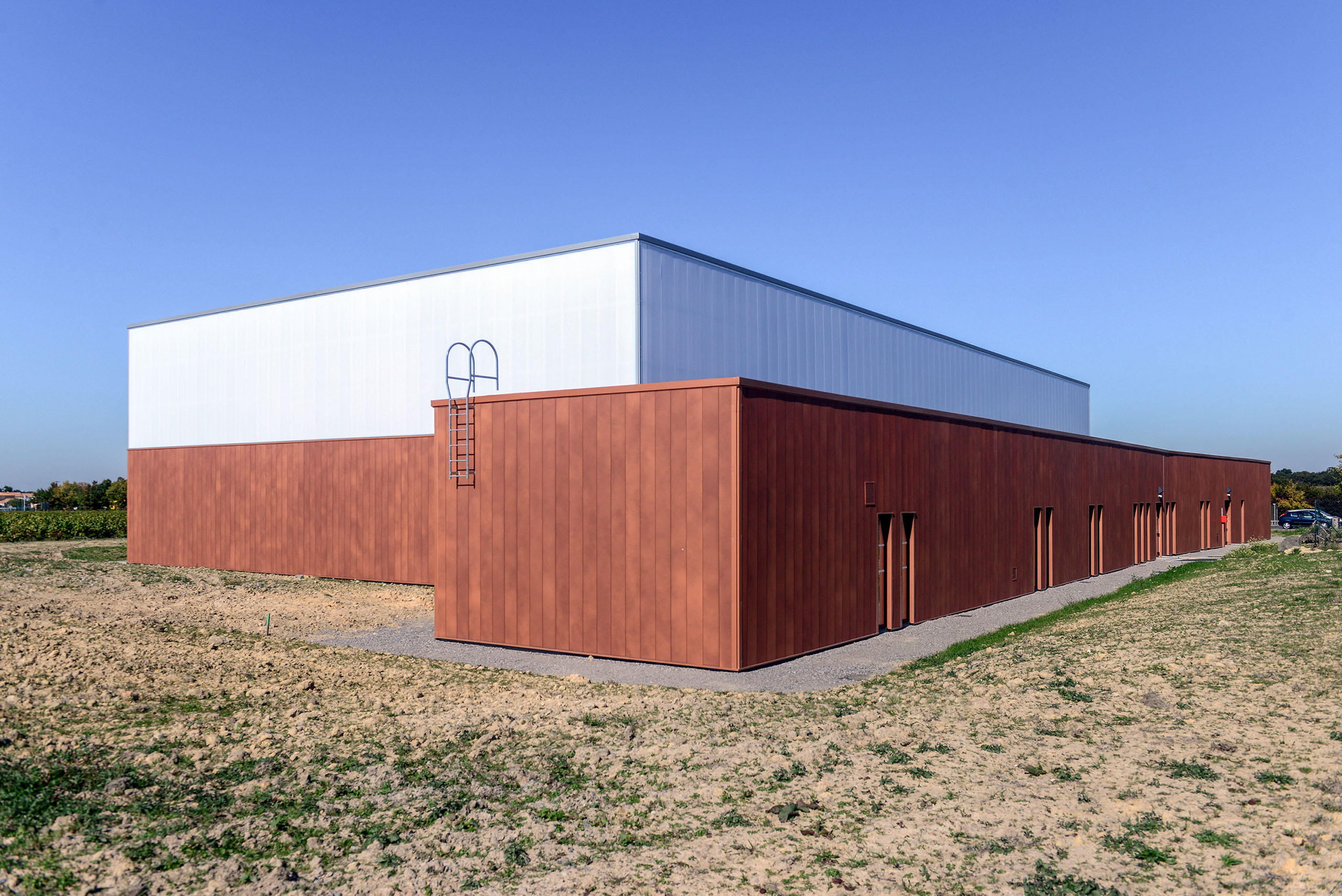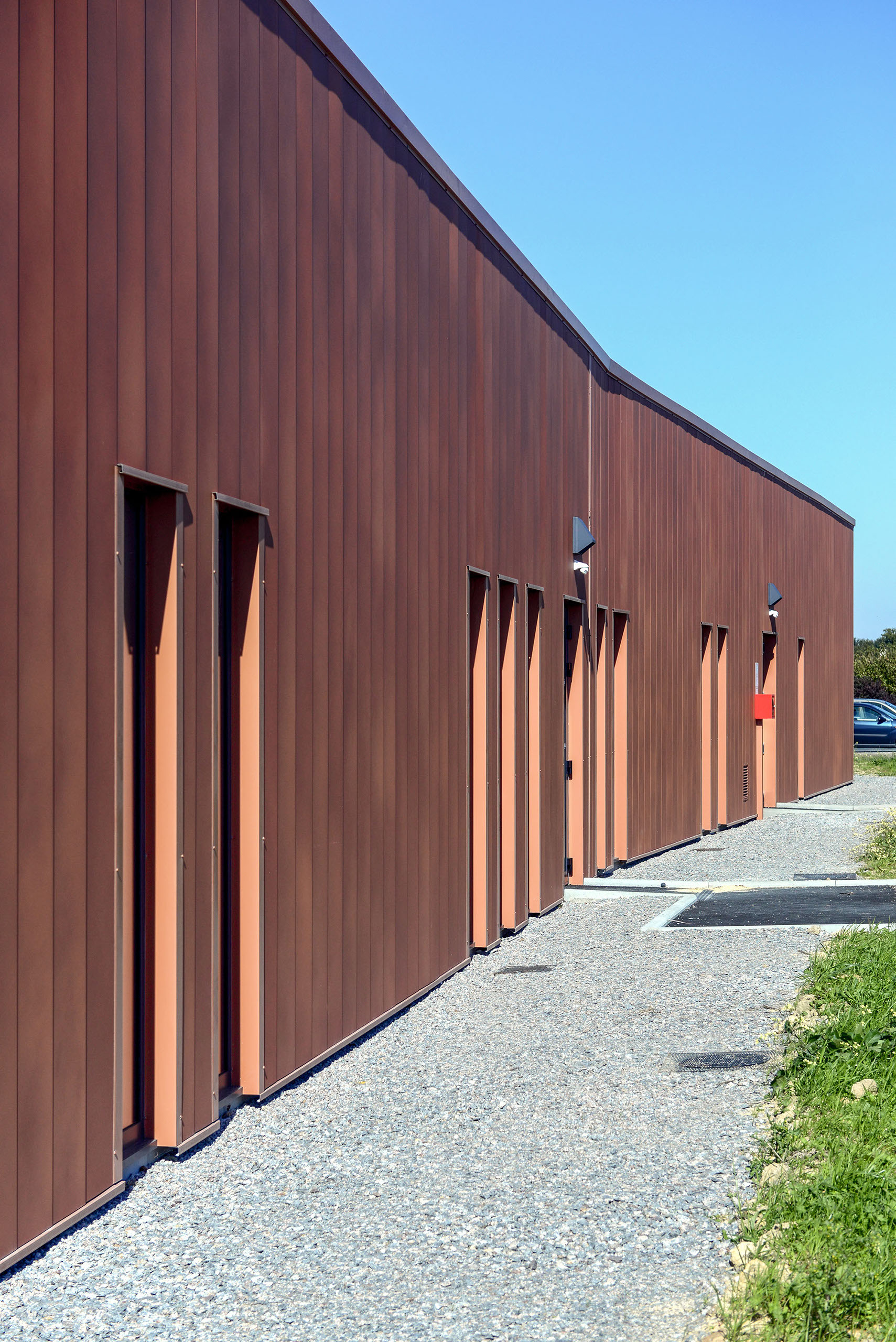 Le volume principal est un parallélépipède rectangle, composé d’une partie basse en bardage métal de teinte rouille rappelant le bois et d’une partie haute en bardage polycarbonate alvéolaire, apportant une lumière naturelle tamisée.