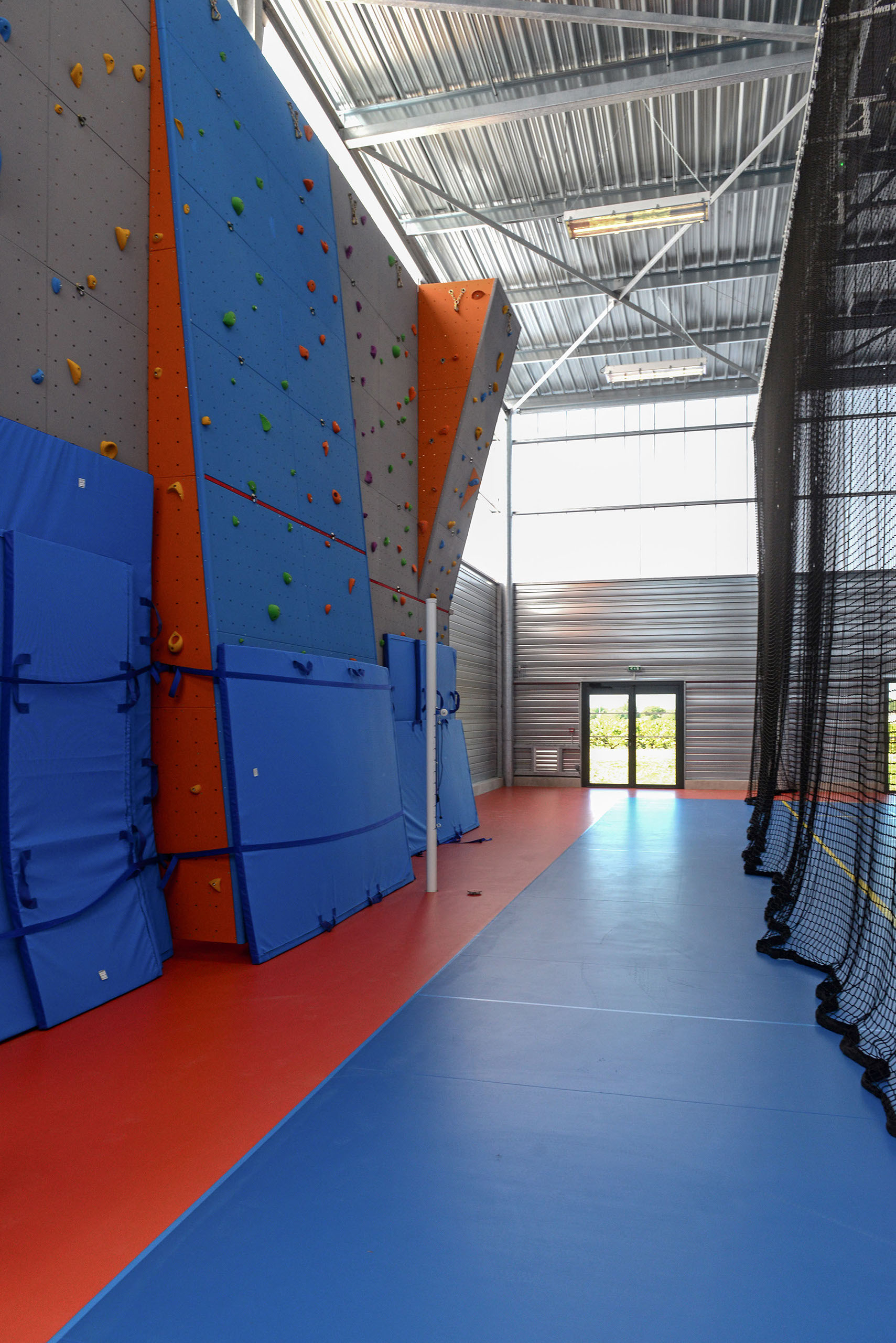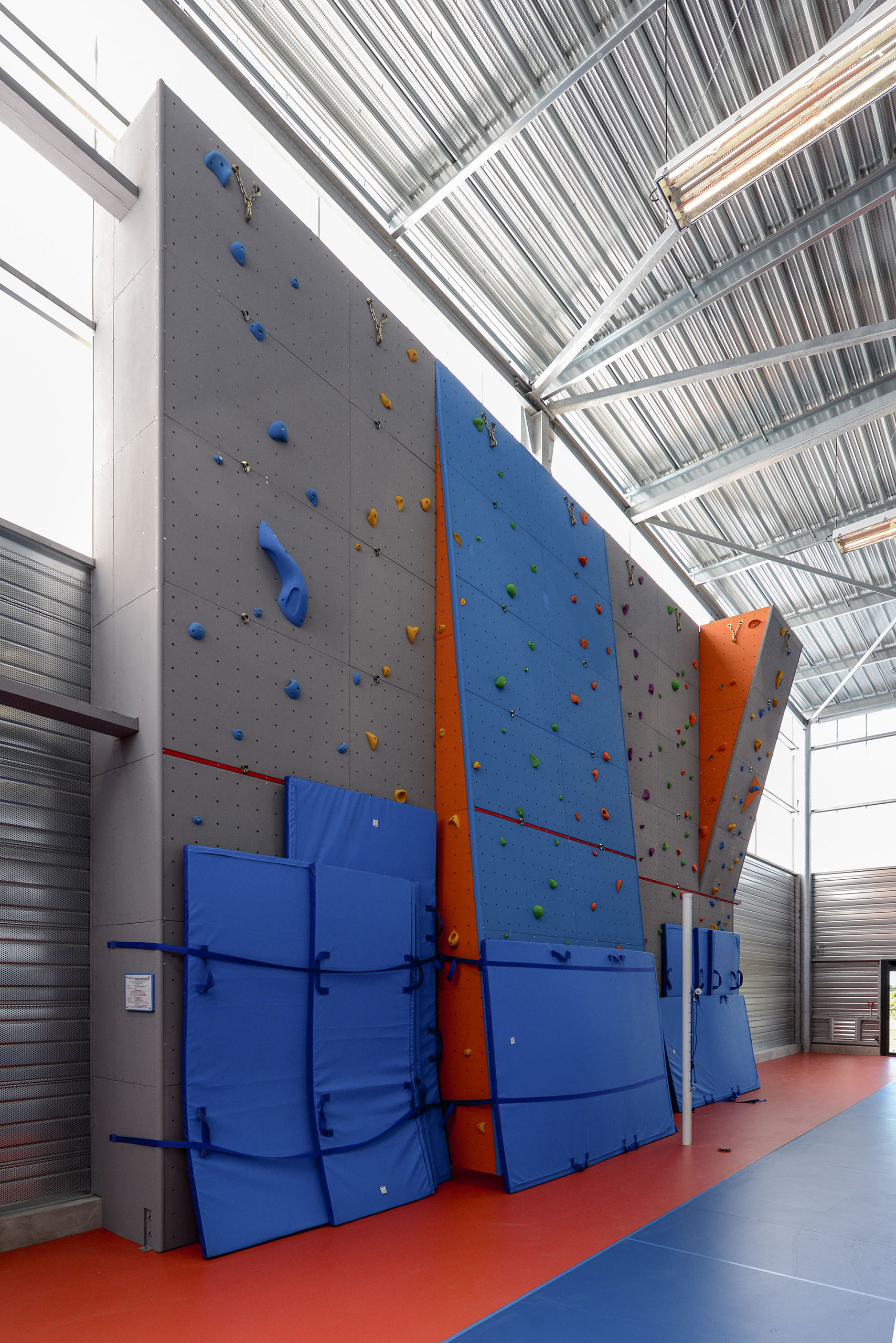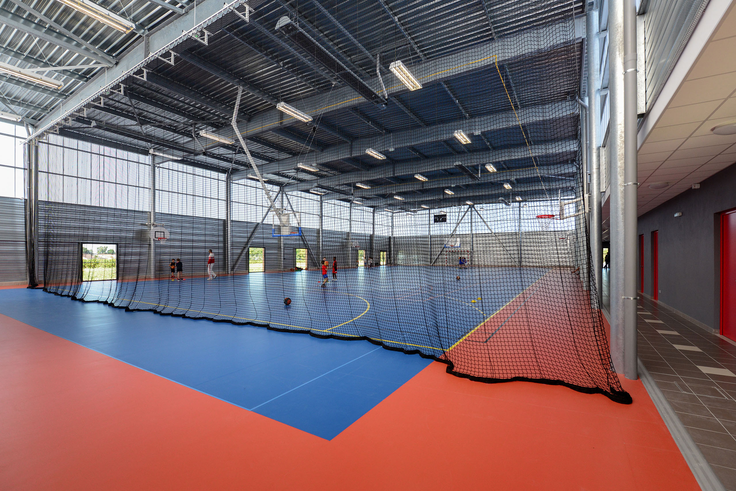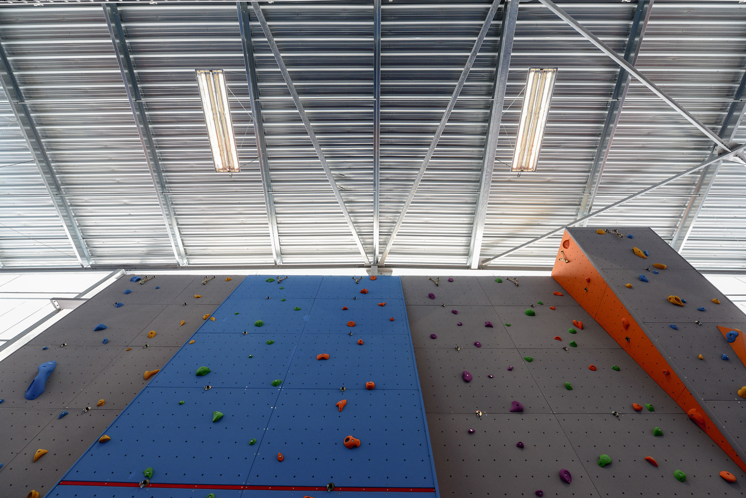 Le volume principal est un parallélépipède rectangle, composé d’une partie basse en bardage métal de teinte rouille rappelant le bois et d’une partie haute en bardage polycarbonate alvéolaire, apportant une lumière naturelle tamisée.