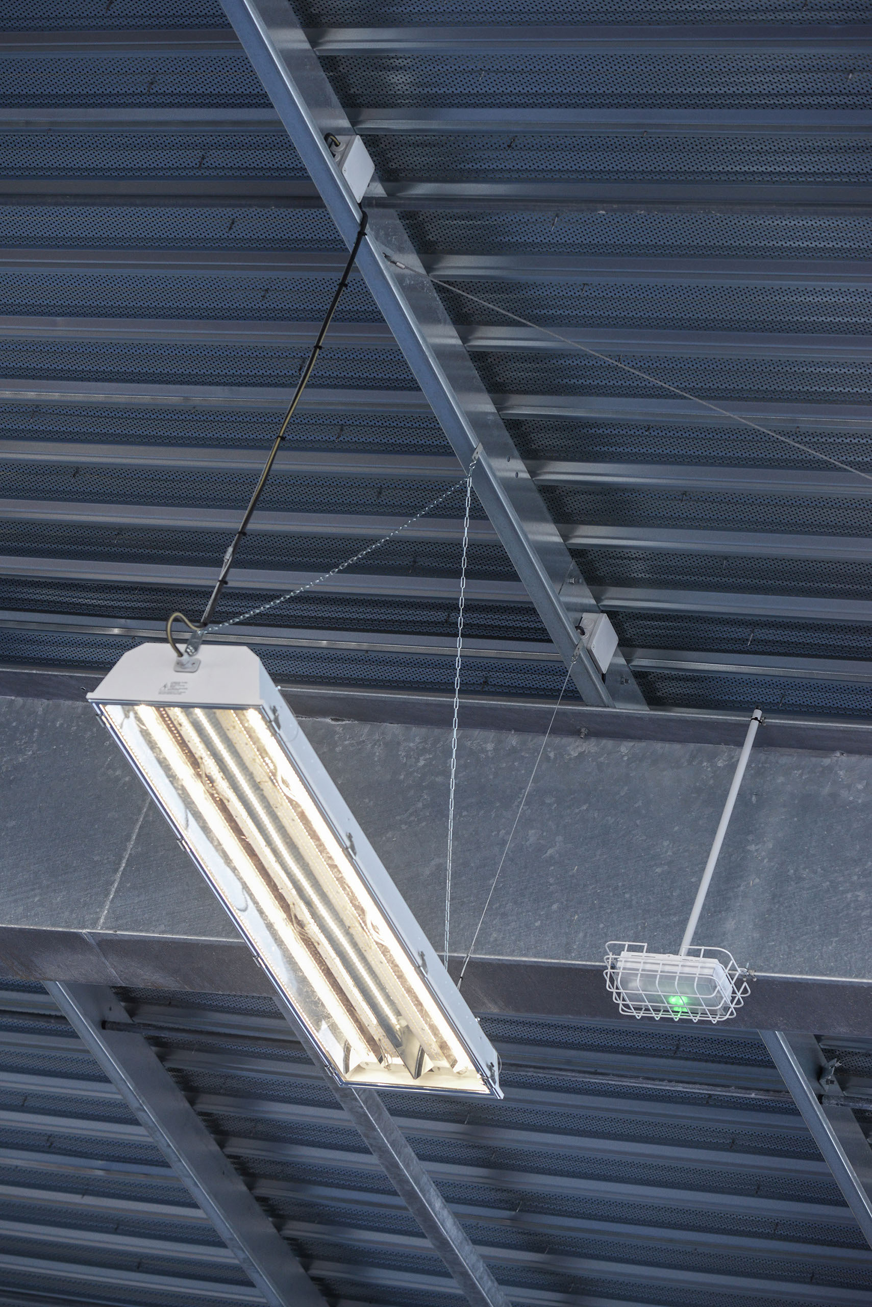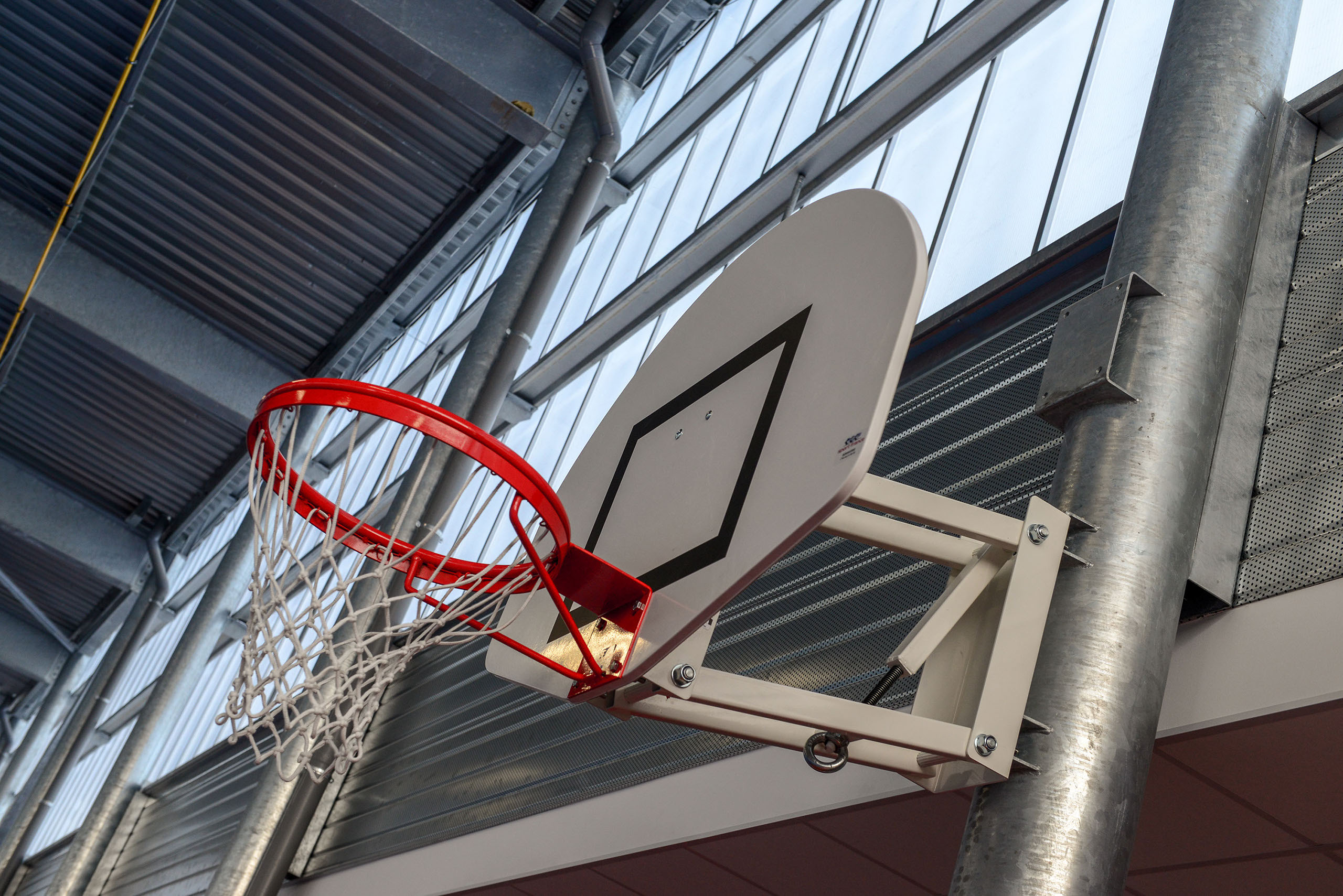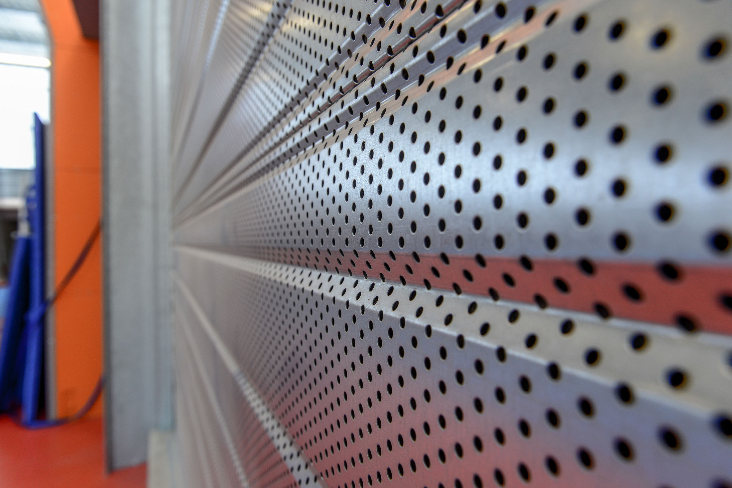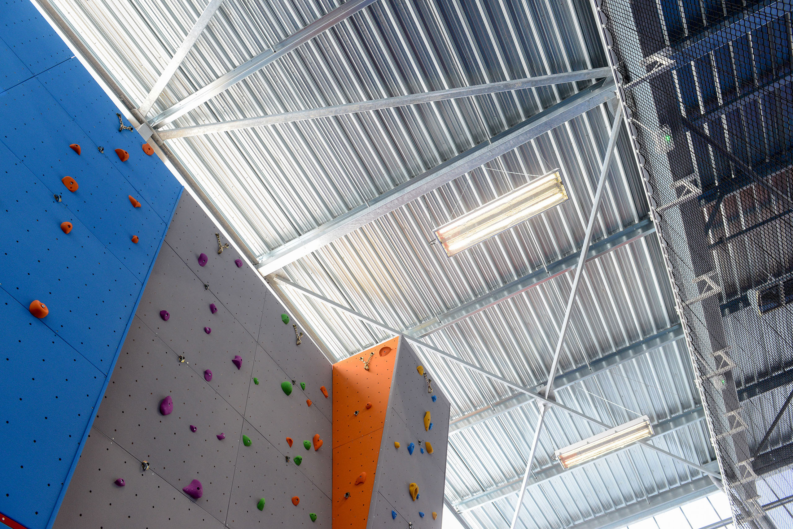 Le volume principal est un parallélépipède rectangle, composé d’une partie basse en bardage métal de teinte rouille rappelant le bois et d’une partie haute en bardage polycarbonate alvéolaire, apportant une lumière naturelle tamisée.