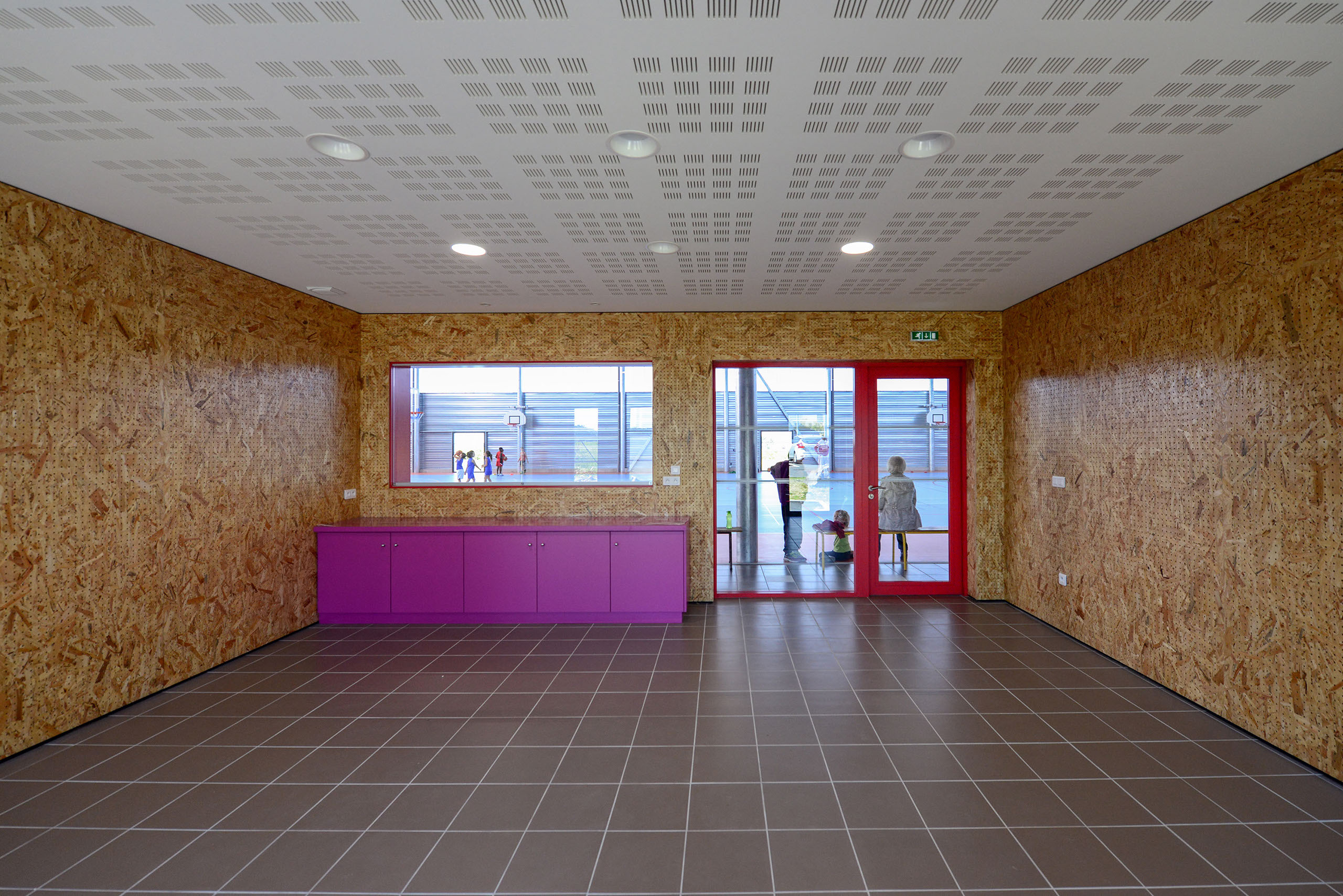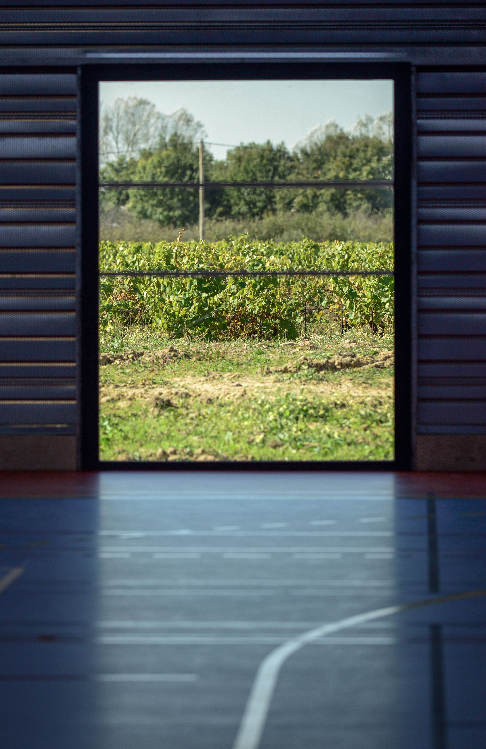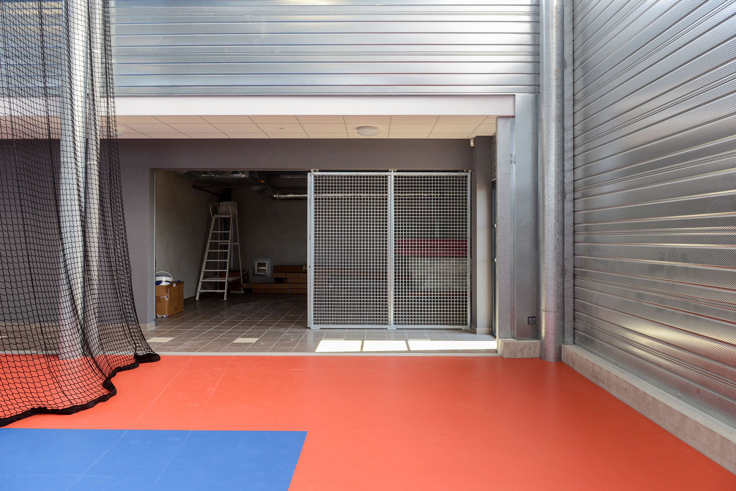 Le volume des vestiaires, s’aligne en hauteur sur cette césure. Il est percé de fenêtres étroites.