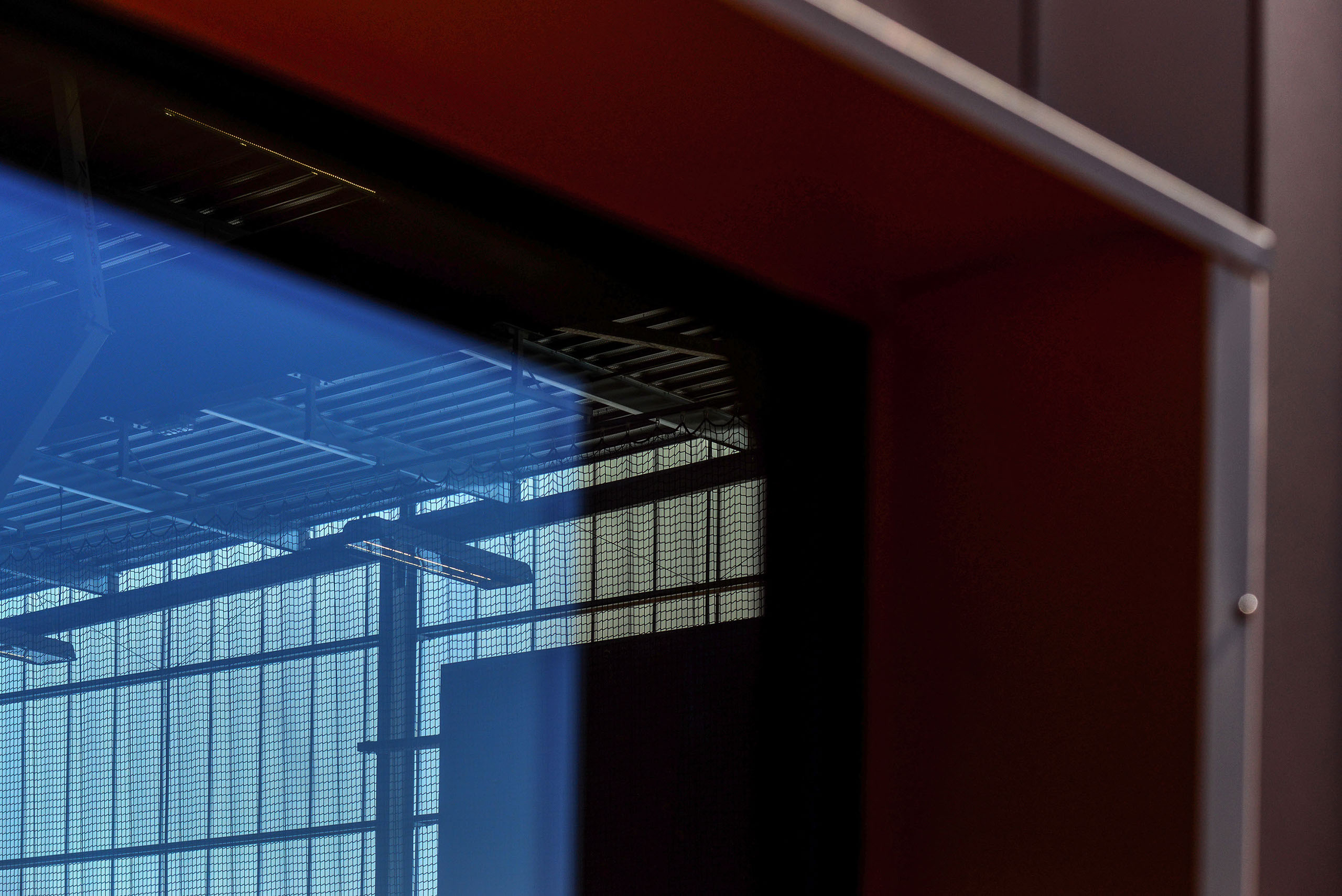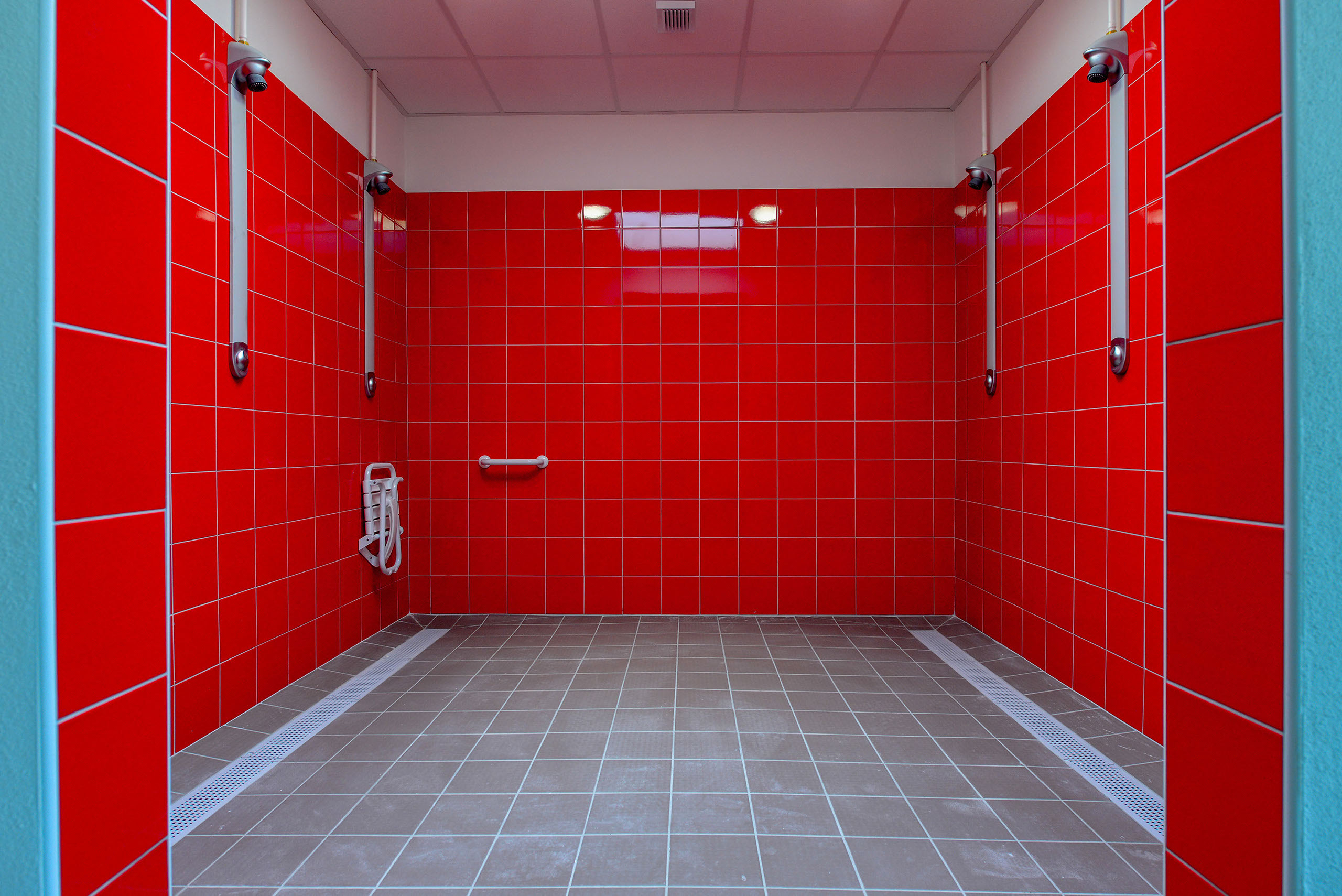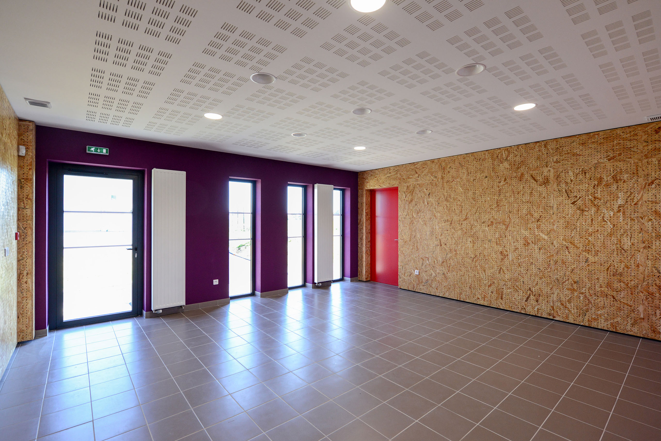 Le volume des vestiaires, s’aligne en hauteur sur cette césure. Il est percé de fenêtres étroites.