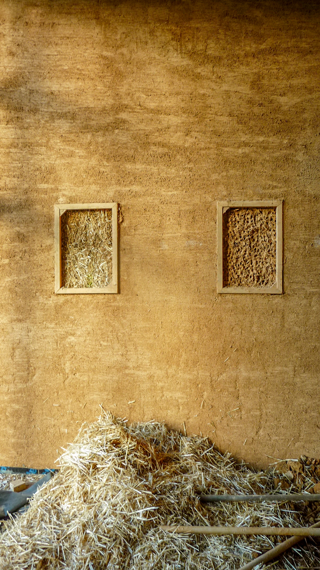 • Des matériaux écologiques : ossature bois isolée en paille ou en ouate de cellulose selon les murs, bardage bois ou enduits de terre, mur central en béton avec murs de terre en parement construits selon 3 techniques de terre : briques de terre crue, bauge et pisé.