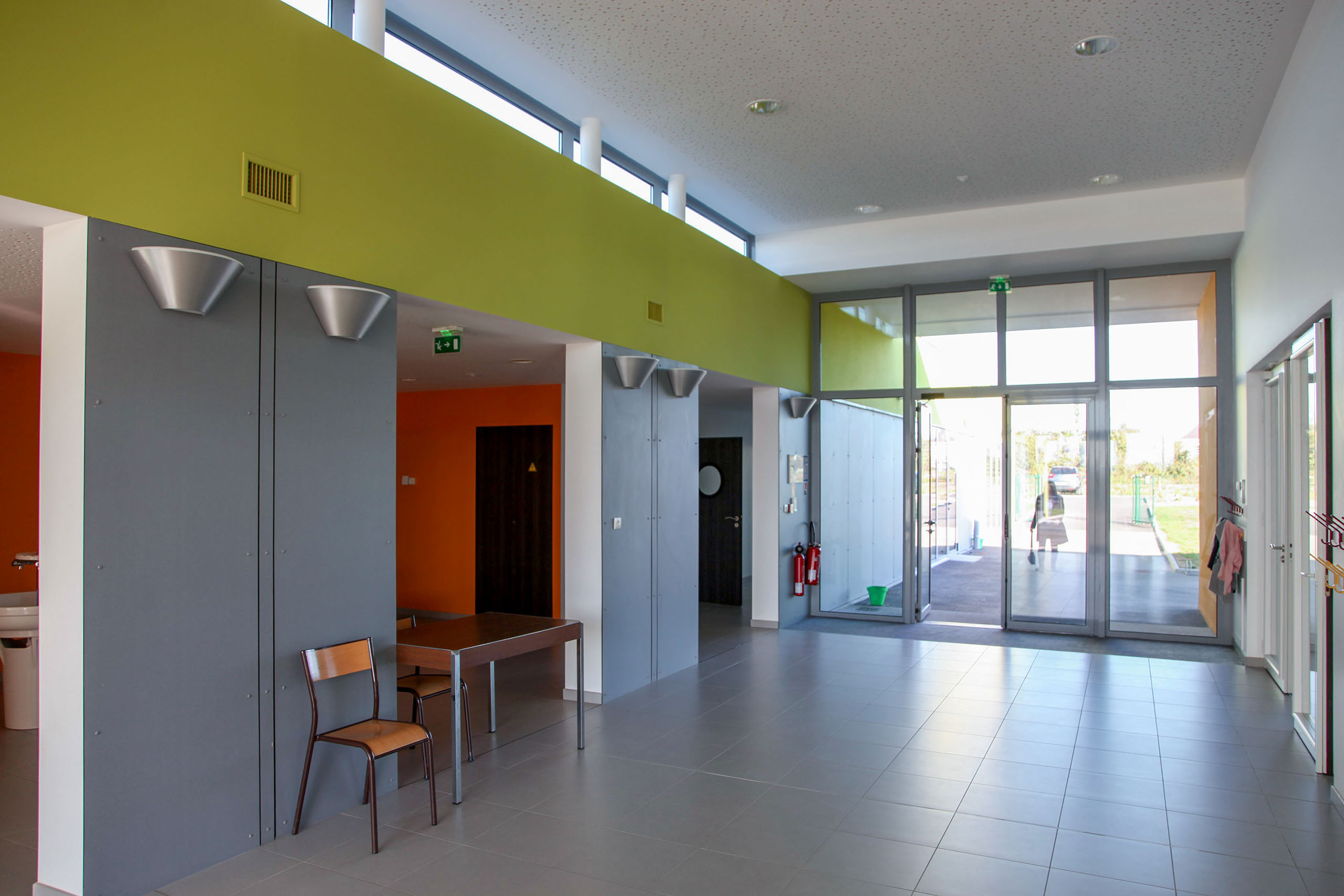 Un deuxième volume plus haut, très éclairé, traversant et en position centrale joue le rôle à la fois d’espace d’accueil et d’espace de desserte pour le restaurant scolaire et l’accueil périscolaire.