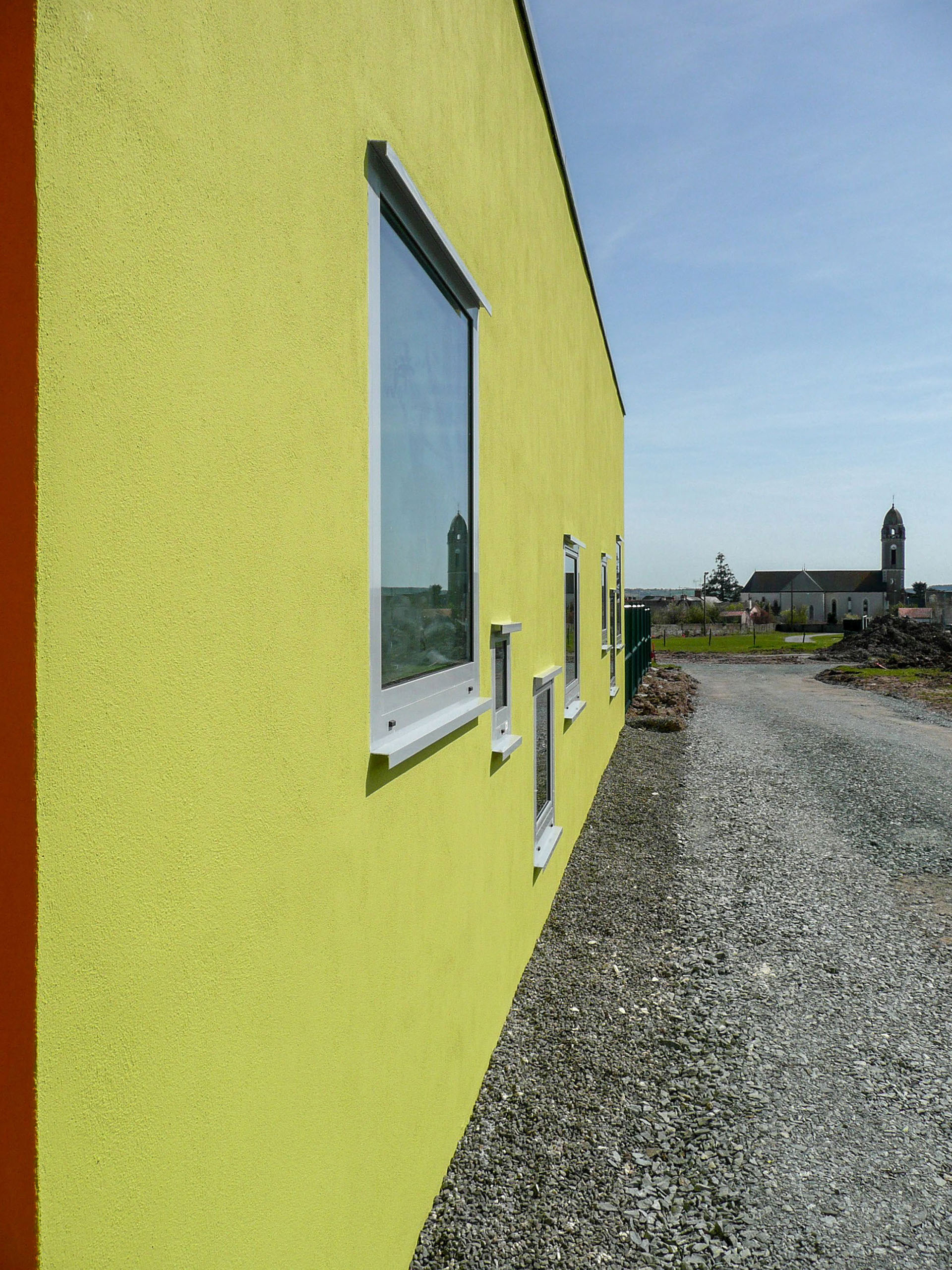 Le premier volume en effet, tout en longueur du nord vers le sud, regroupe à la fois la partie associations et accueil périscolaire côté ouest créant ainsi une frontière bâtie protégeant des vents et pluies dominants les cours.