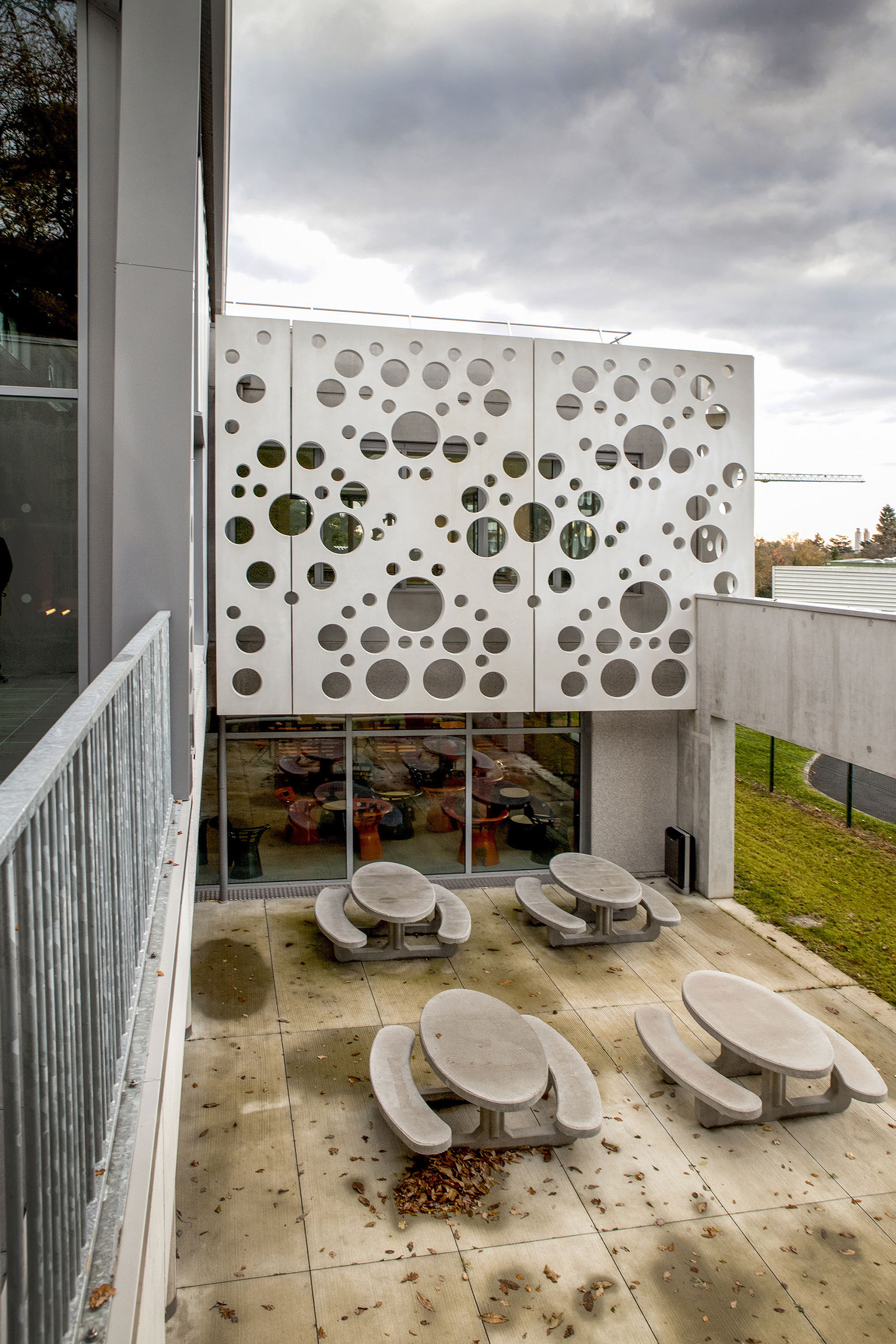 Car nous avons conçu ce projet avec une ventilation naturelle pour les salles de cours associant ce double mur nord à des cheminées créant des émergences significatives en toiture.