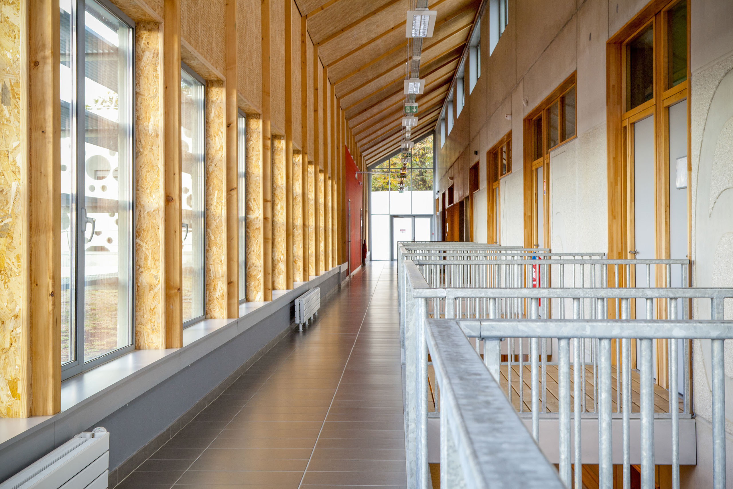 Il se lit aisément et affirme son caractère technique -panneaux solaires, parois vitrées sud,double mur nord.