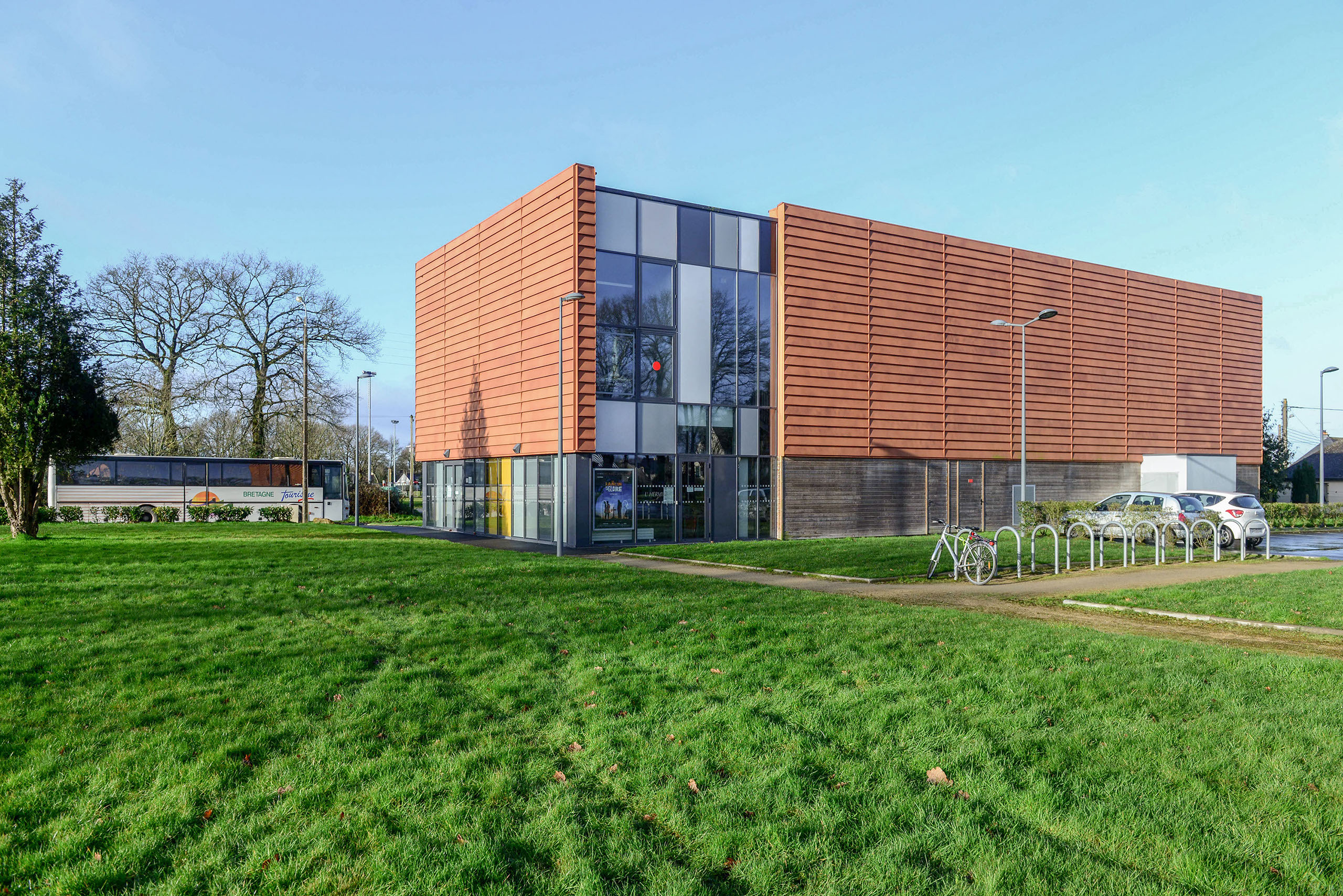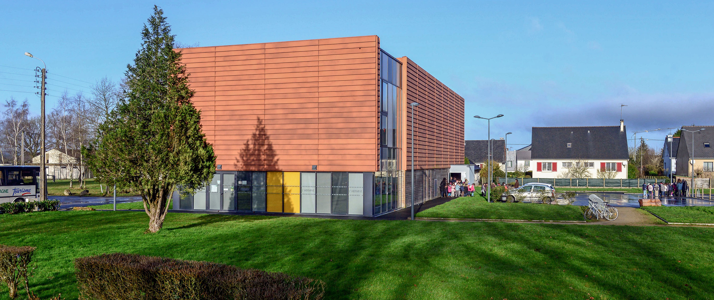 Le choix d’une modénature de bâtiment composé d’un soubassement bois, d’une partie supérieure en aluminium laqué couleur rouille ainsi que des grands murs rideaux toute hauteur, malgré sa forme compacte, fait apparaître un bâtiment plus léger et plus petit qui donne à l’ensemble une cohérence intéressante et une meilleure intégration dans un tissu urbain pavillonnaire.