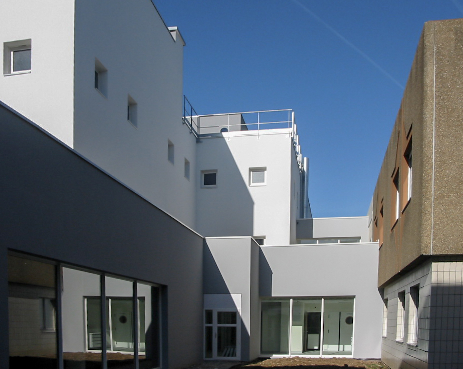 L’ensemble est relié à Hôpital par un volume de liaison bas à RDC au niveau de l’entrée principale et un volume vitré pour la cage d’escalier nord.