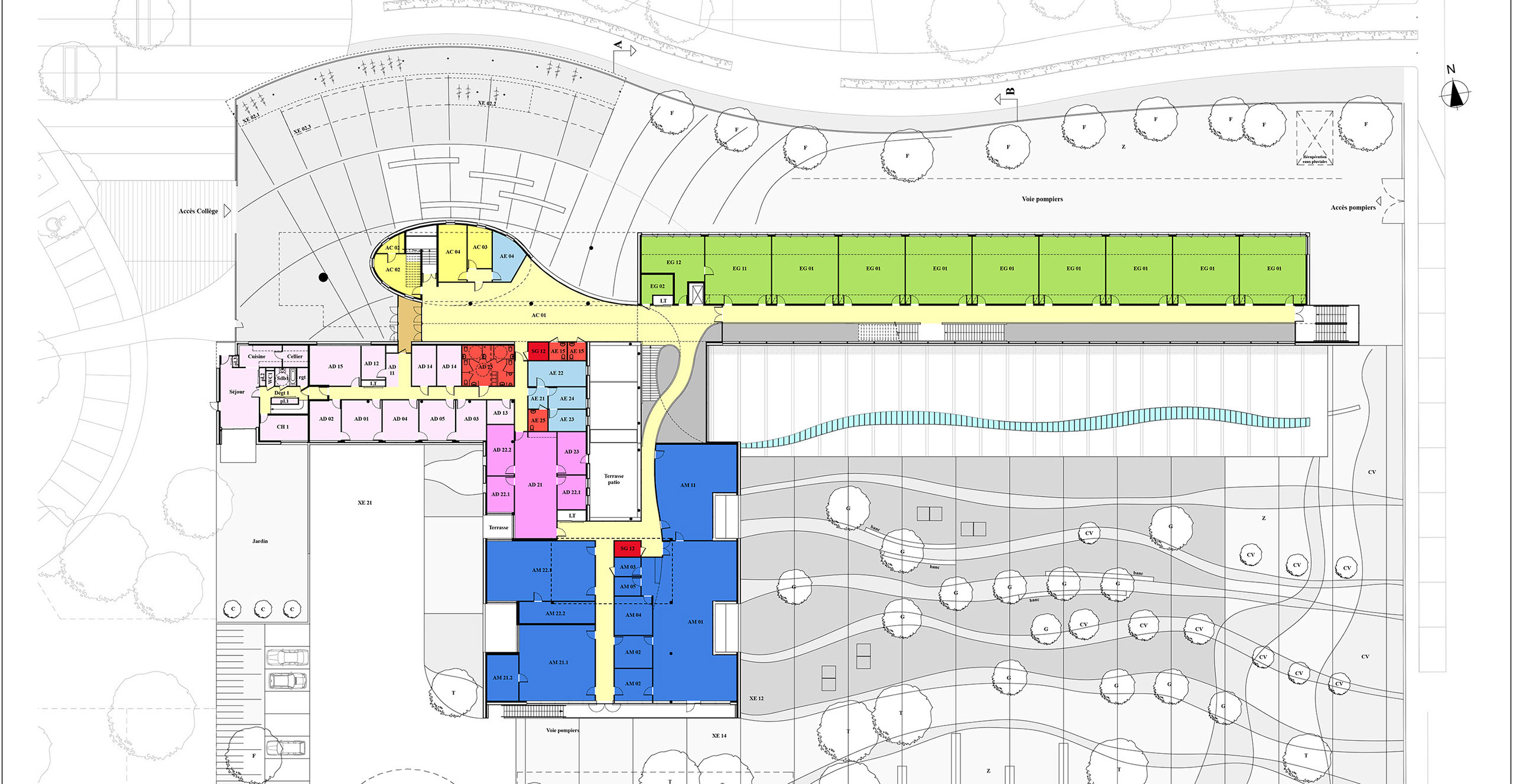 Il s’agit pour nous tout d’abord de créer un cadre, un environnement, une ambiance qui permettent de fondre dans un espace considéré comme un « campus » calme, serein, convivial toutes les activités, piscine, salle de sports, collège, terrain de sports.