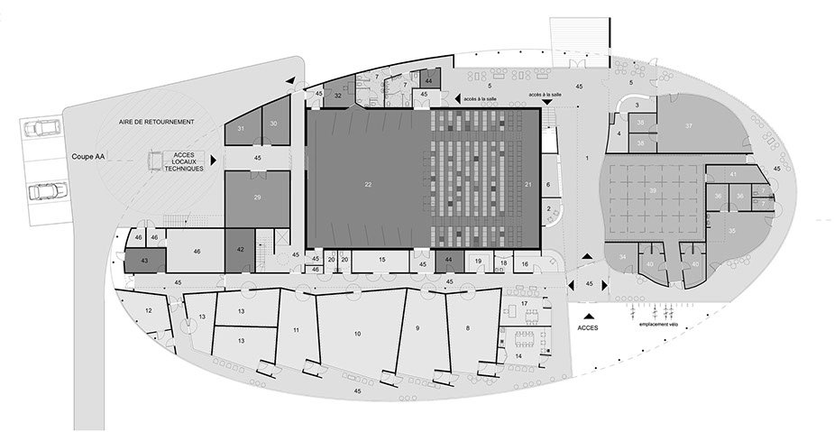 Espace unique sans devant ni derrière, qui invite à être exploré librement dans toutes les directions dans une subtile transparence entre intérieur et extérieur favorisant les reflets de la nature environnante, mais aussi vues transversales qui donnent à voir la profondeur de l’équipement et la diversité des activités.