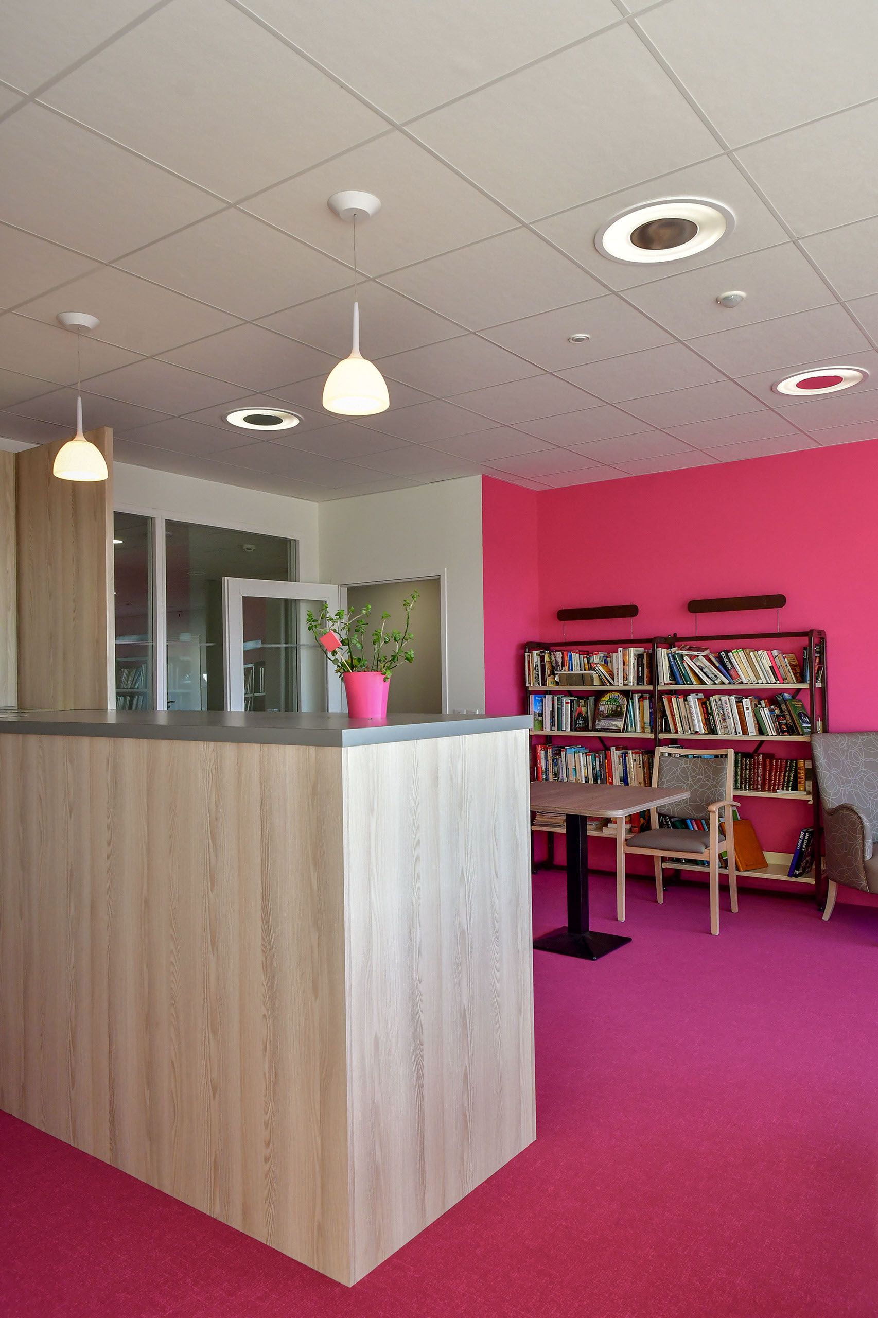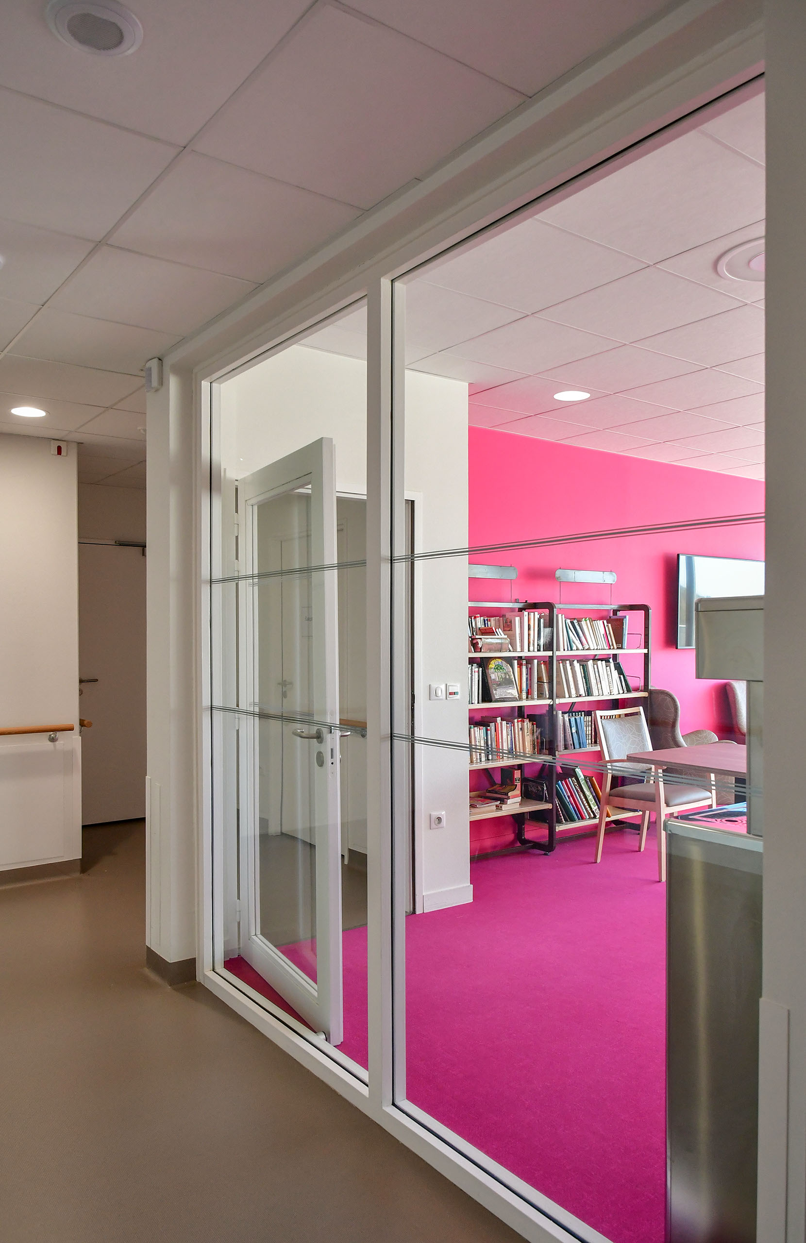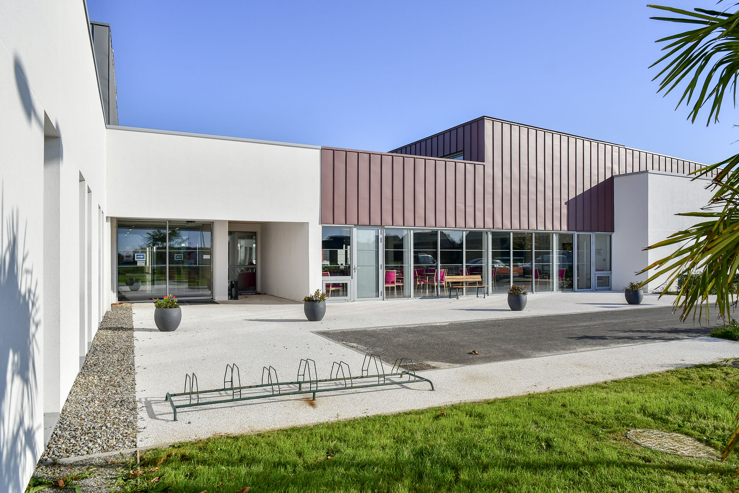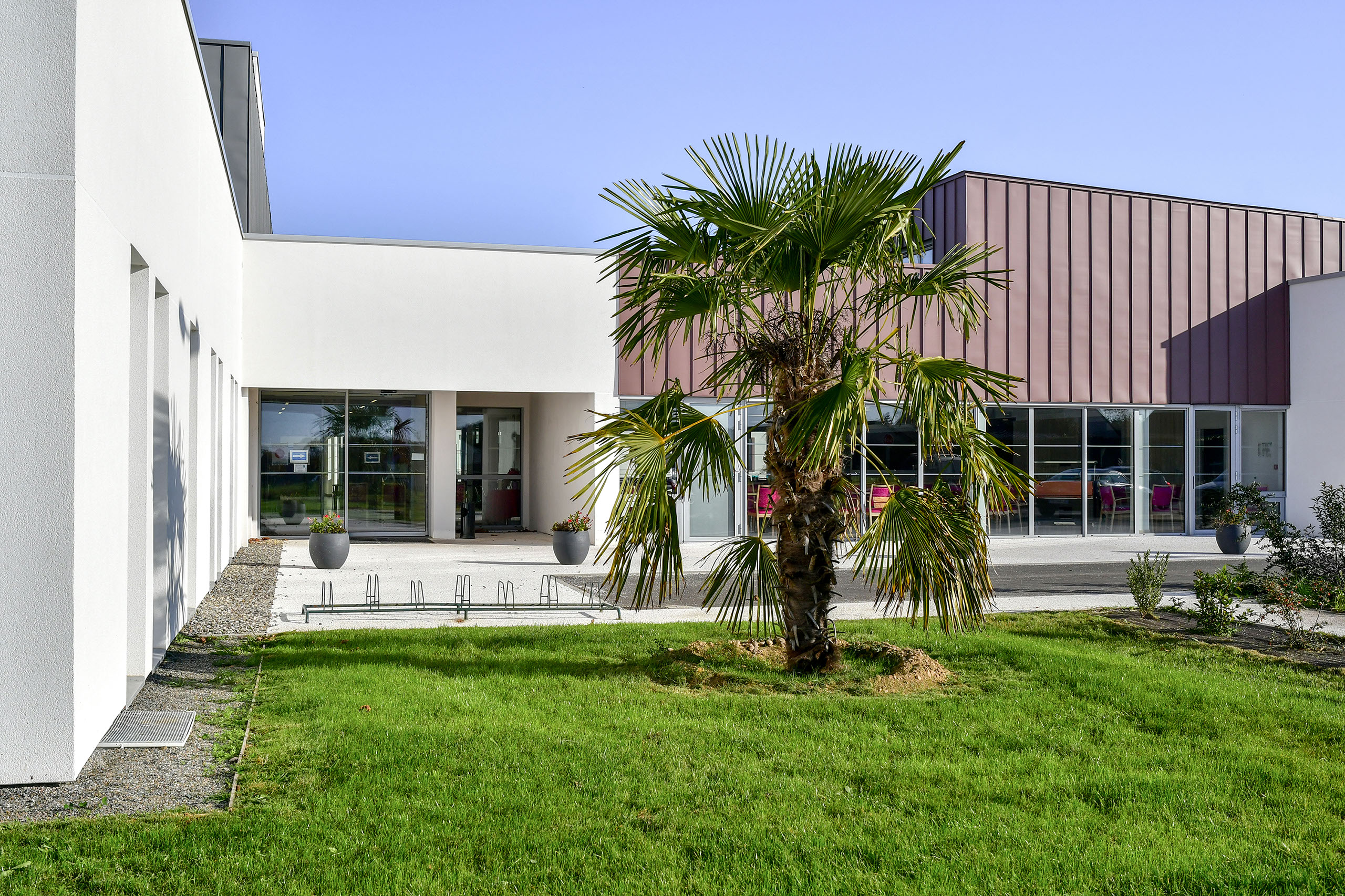 L’aspect masse qui aurait pu naître est rompu par le décalage des toitures, par le jeu des matériaux utilisés.