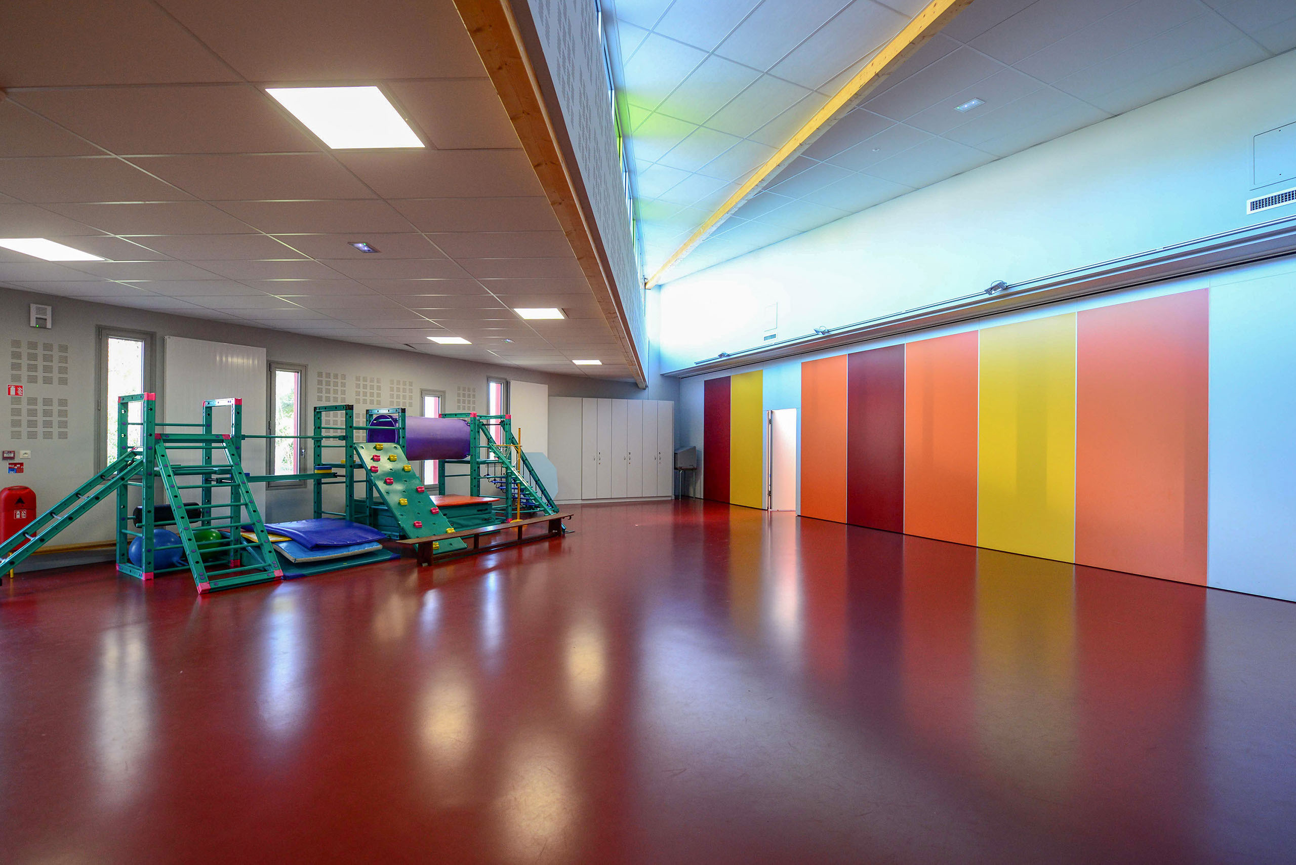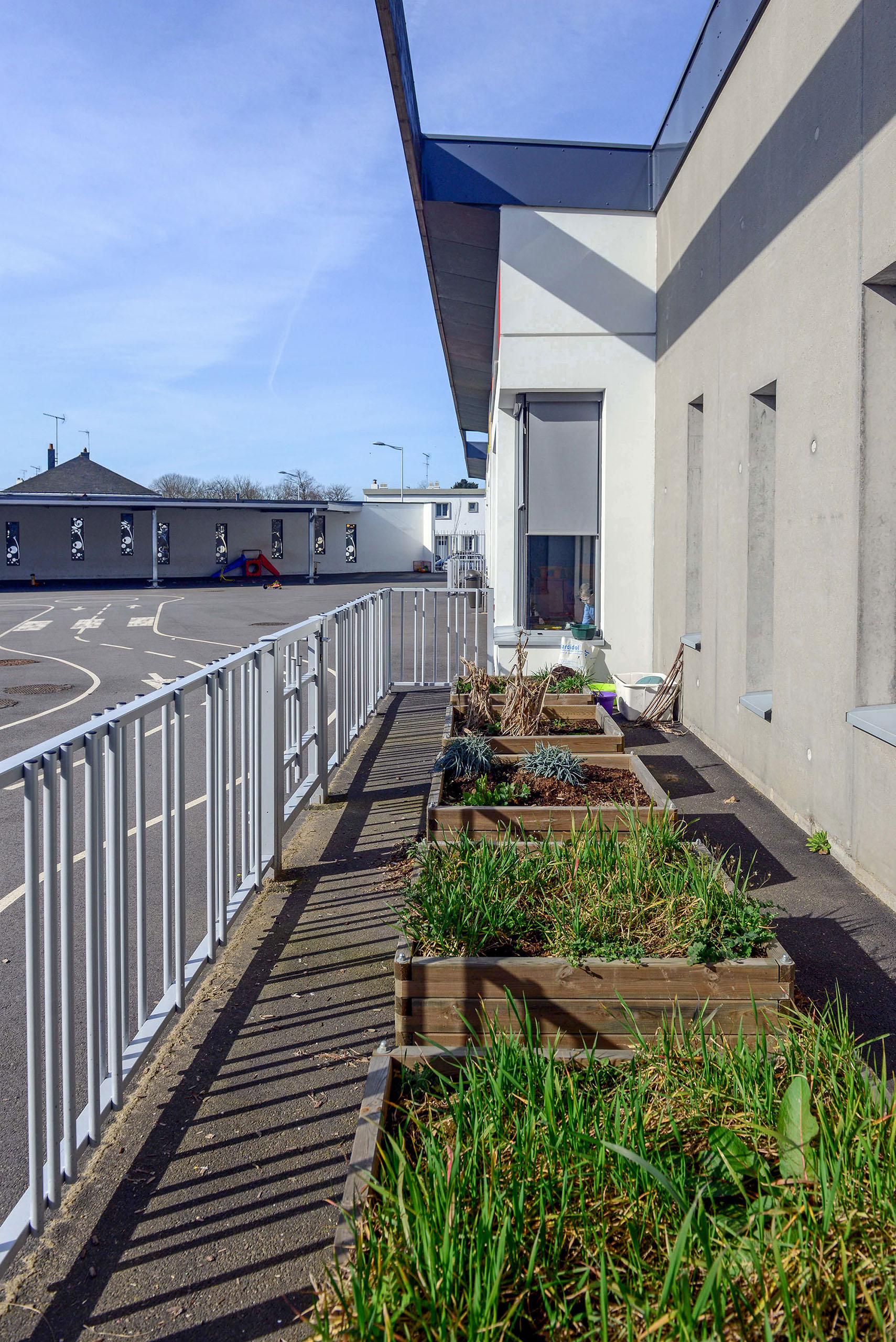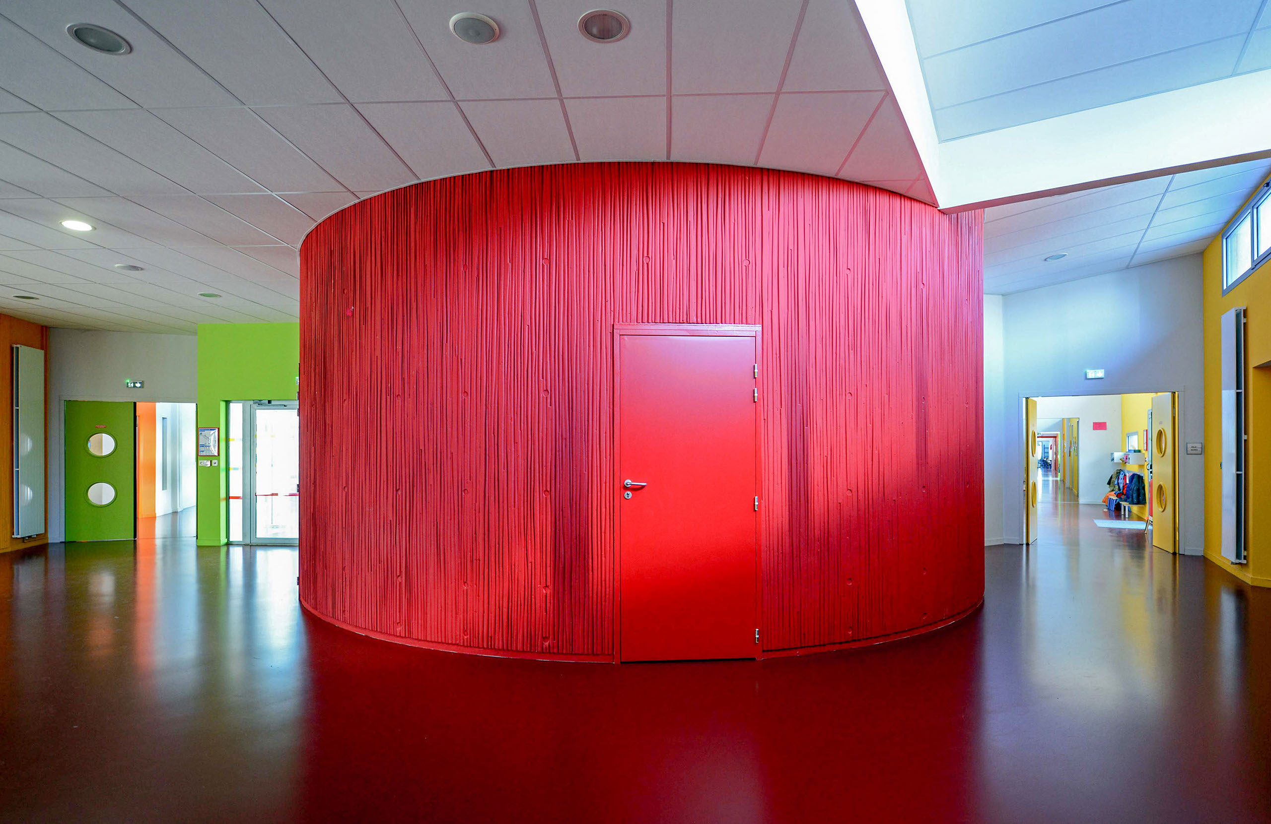 Couvert par une toiture terrasse d’où émerge en figure de proue le volume des salles de motricité, signal et clin d’oeil en même temps, enrobé dans le cylindre rassurant qui sert d’étrave à l’ensemble.