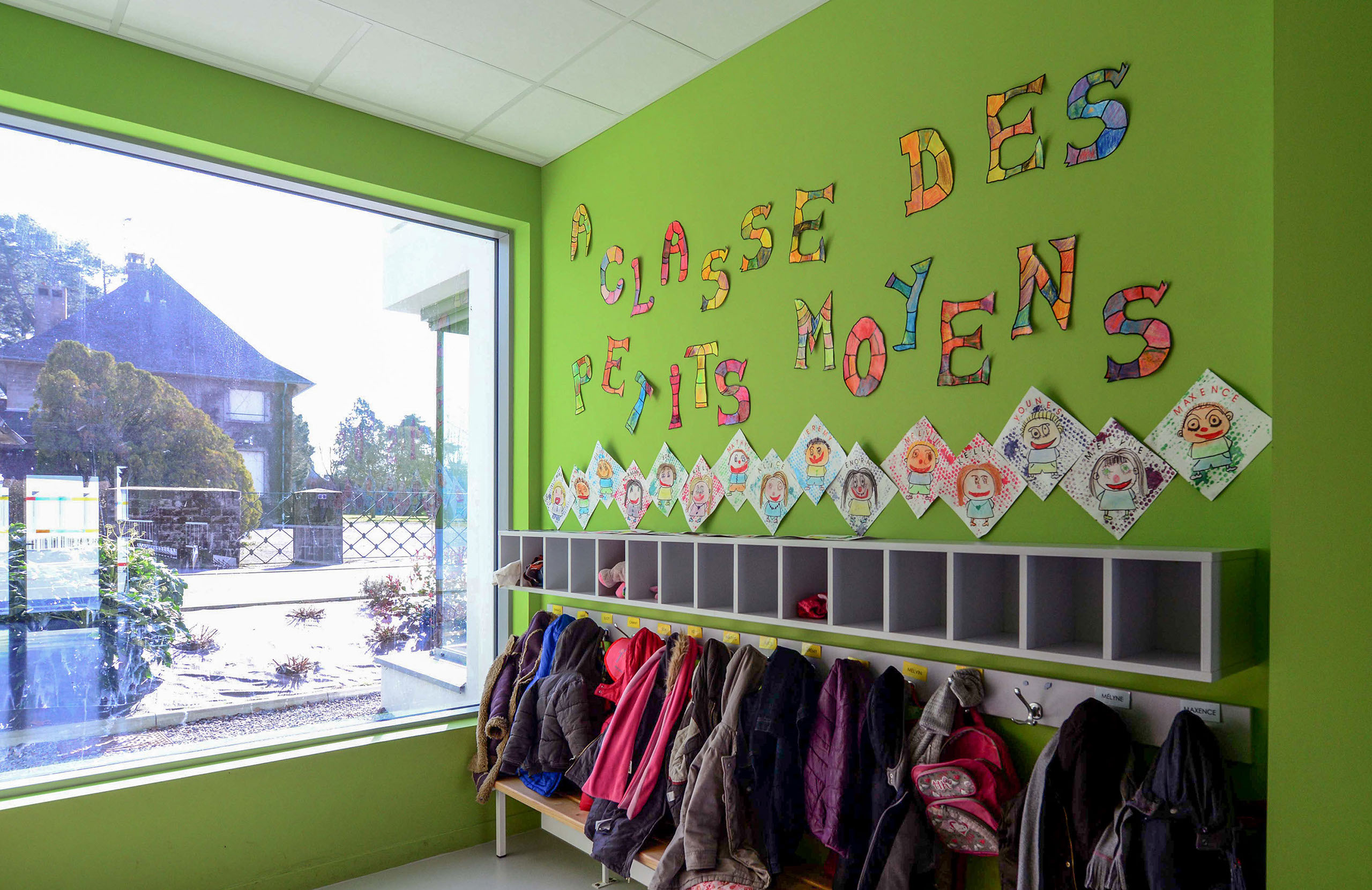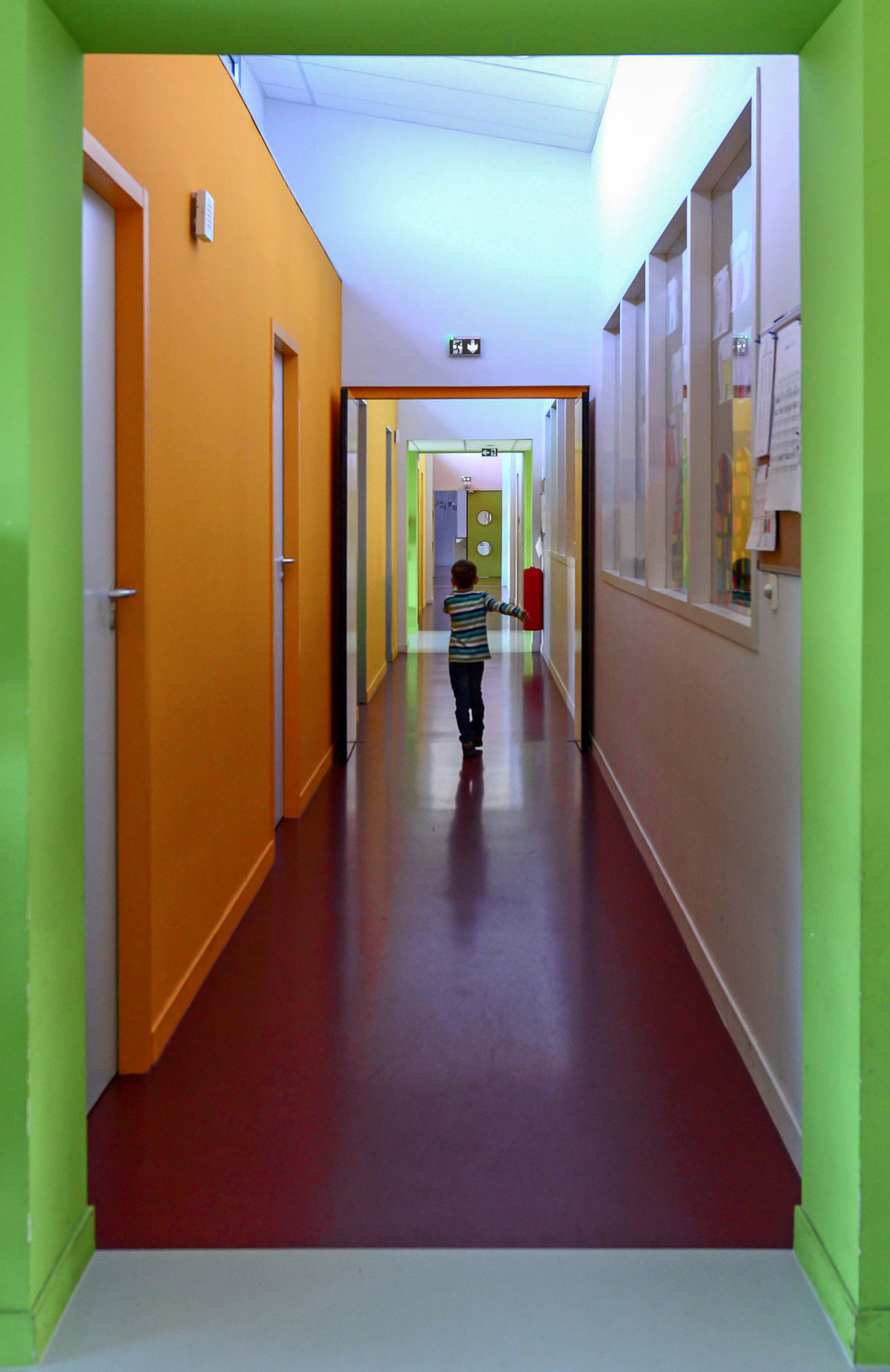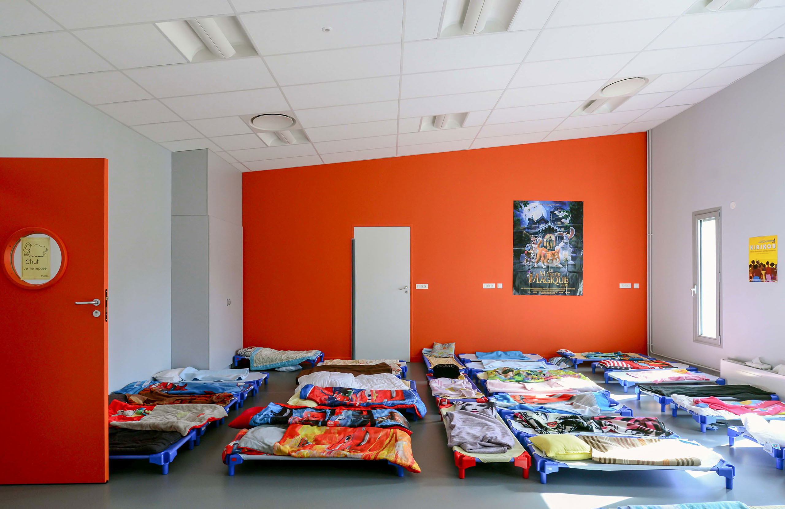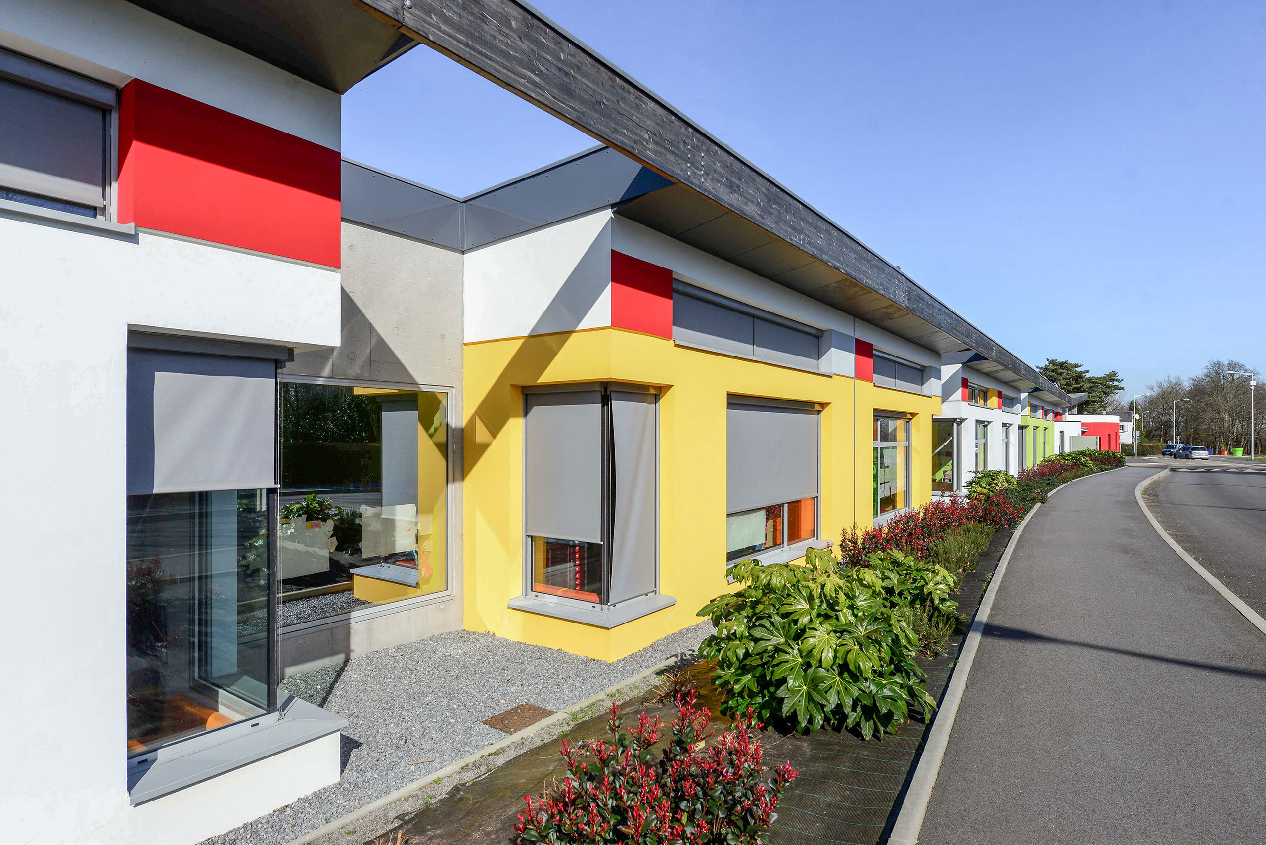 Couvert par une toiture terrasse d’où émerge en figure de proue le volume des salles de motricité, signal et clin d’oeil en même temps, enrobé dans le cylindre rassurant qui sert d’étrave à l’ensemble.