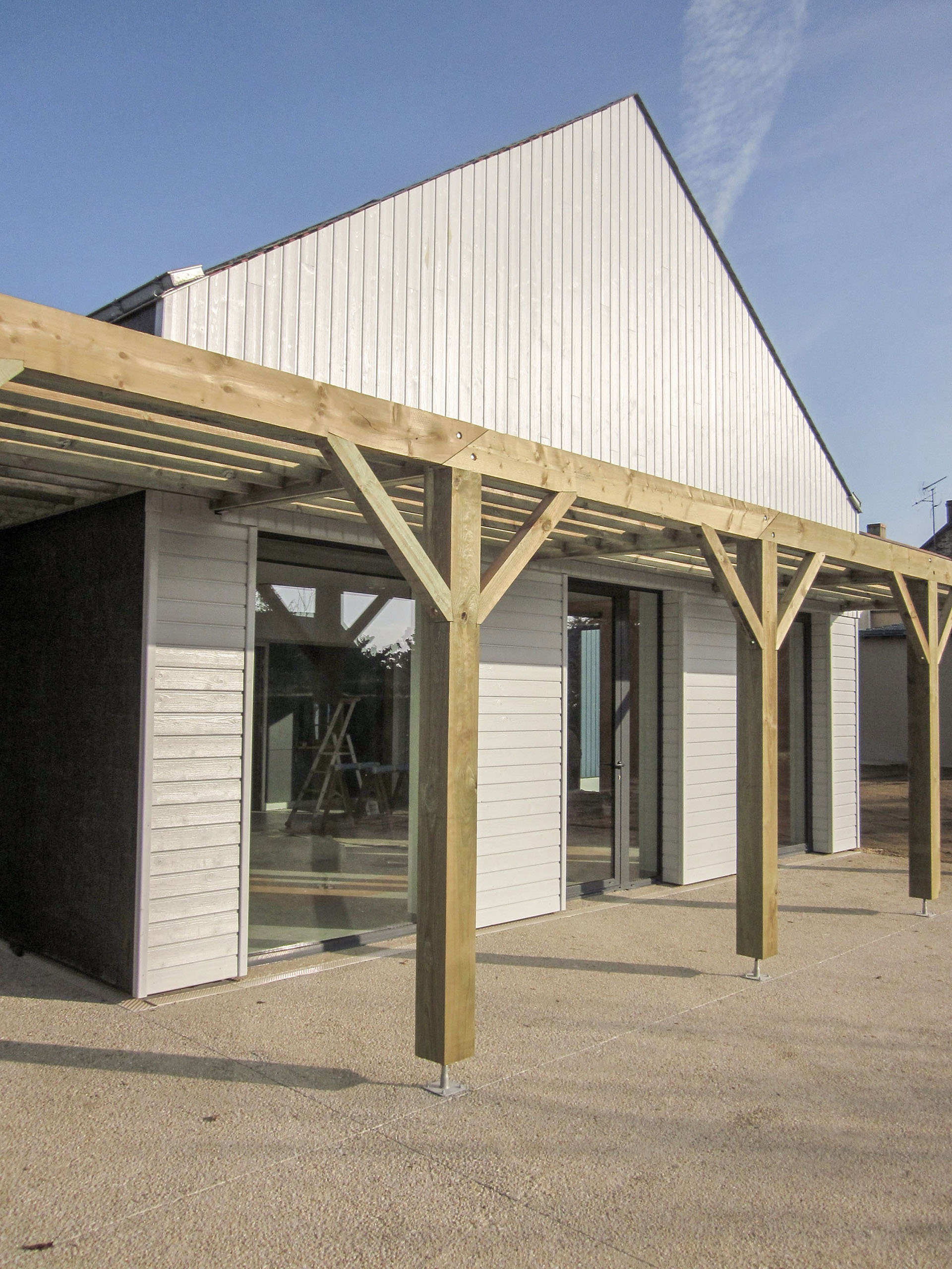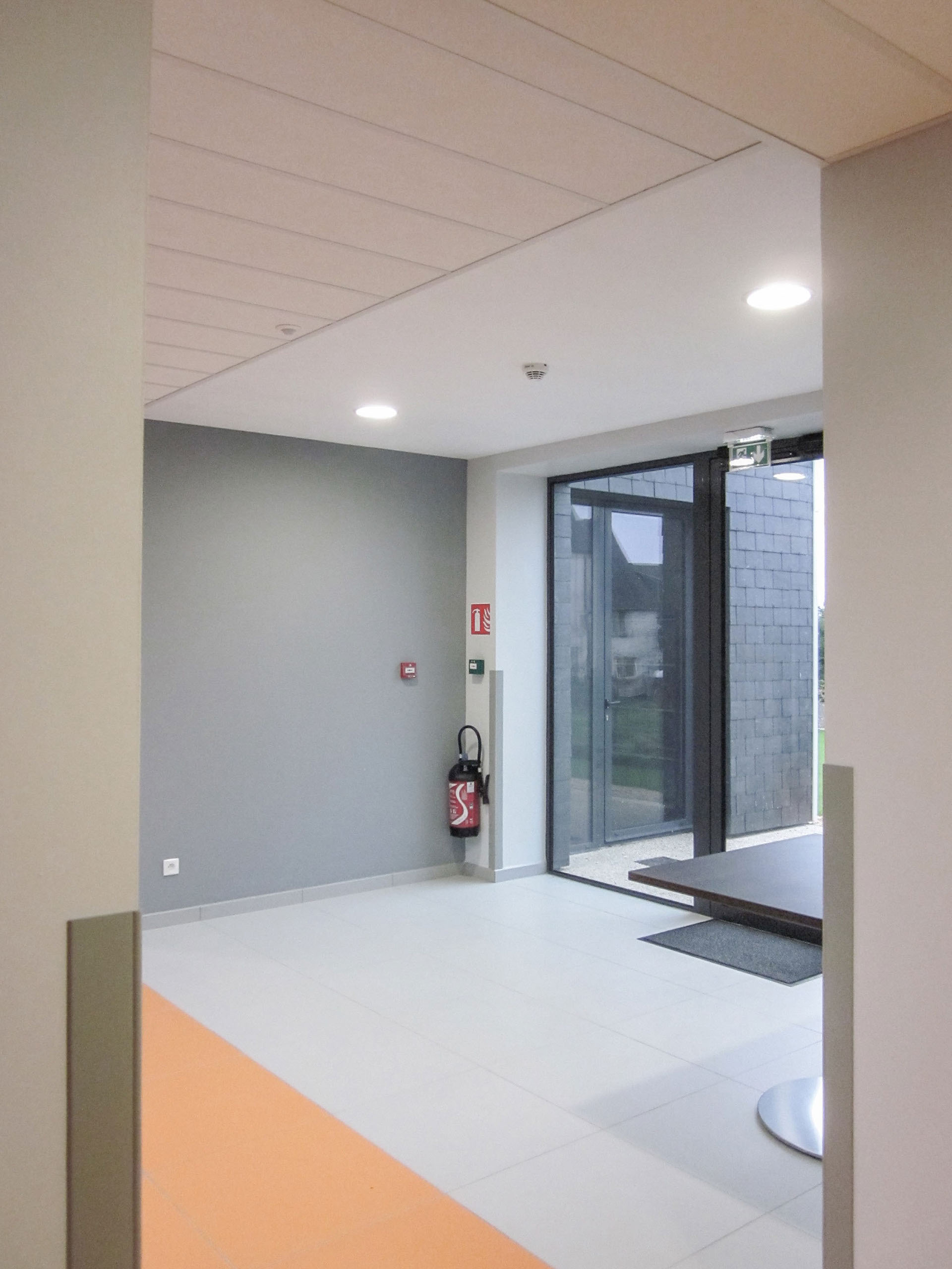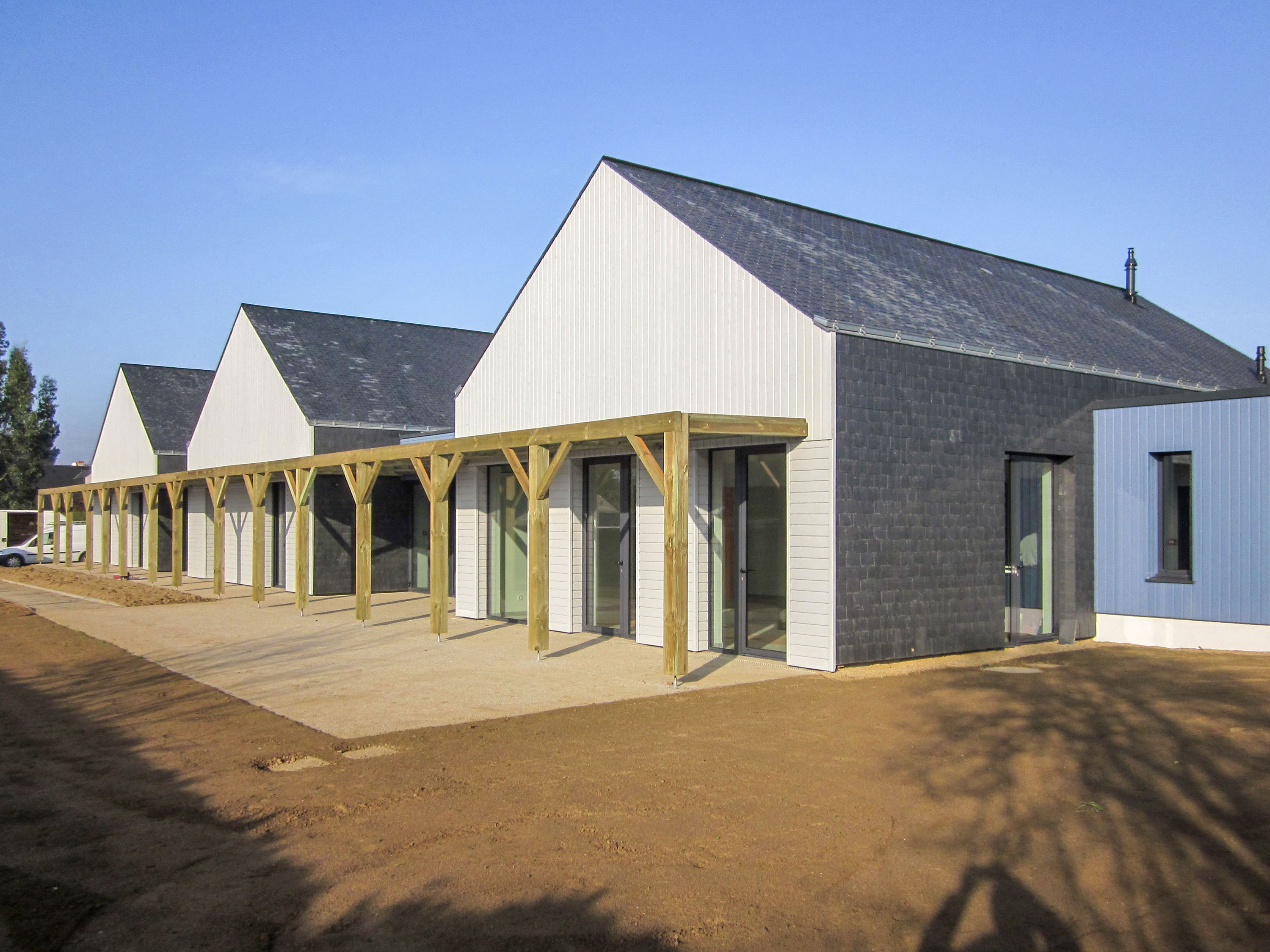 Le bâtiment, à simple rez-de-chaussée est constitué de 3 « maisons » : volumes simples aux toiture à 2 pentes orientées est et ouest évoquant les habitations environnantes, reliées par des volumes plus bas à toiture terrasse en retrait.
