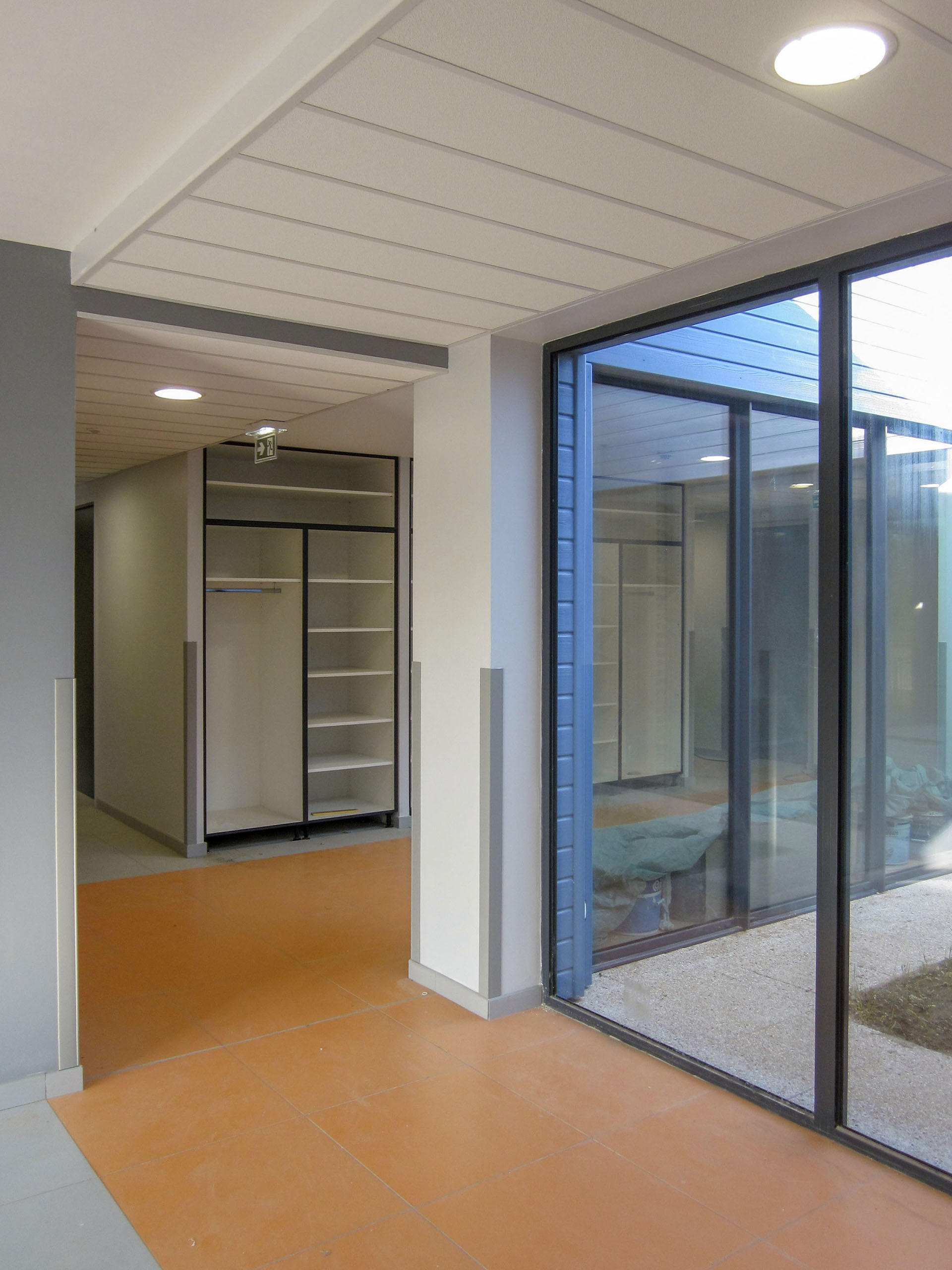 Un patio s’ouvre au centre permettant des apports de lumière naturelle dans les circulations.
