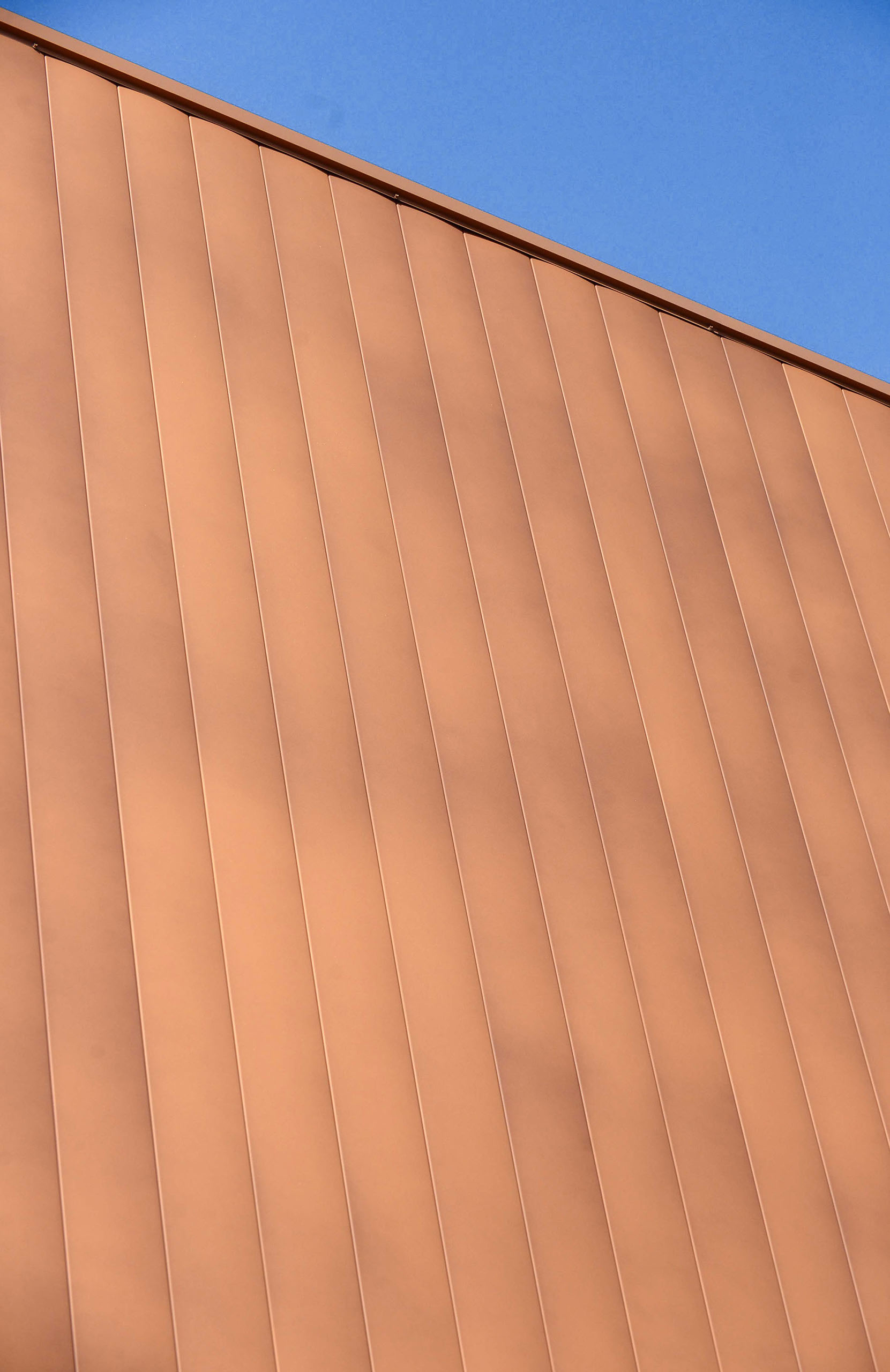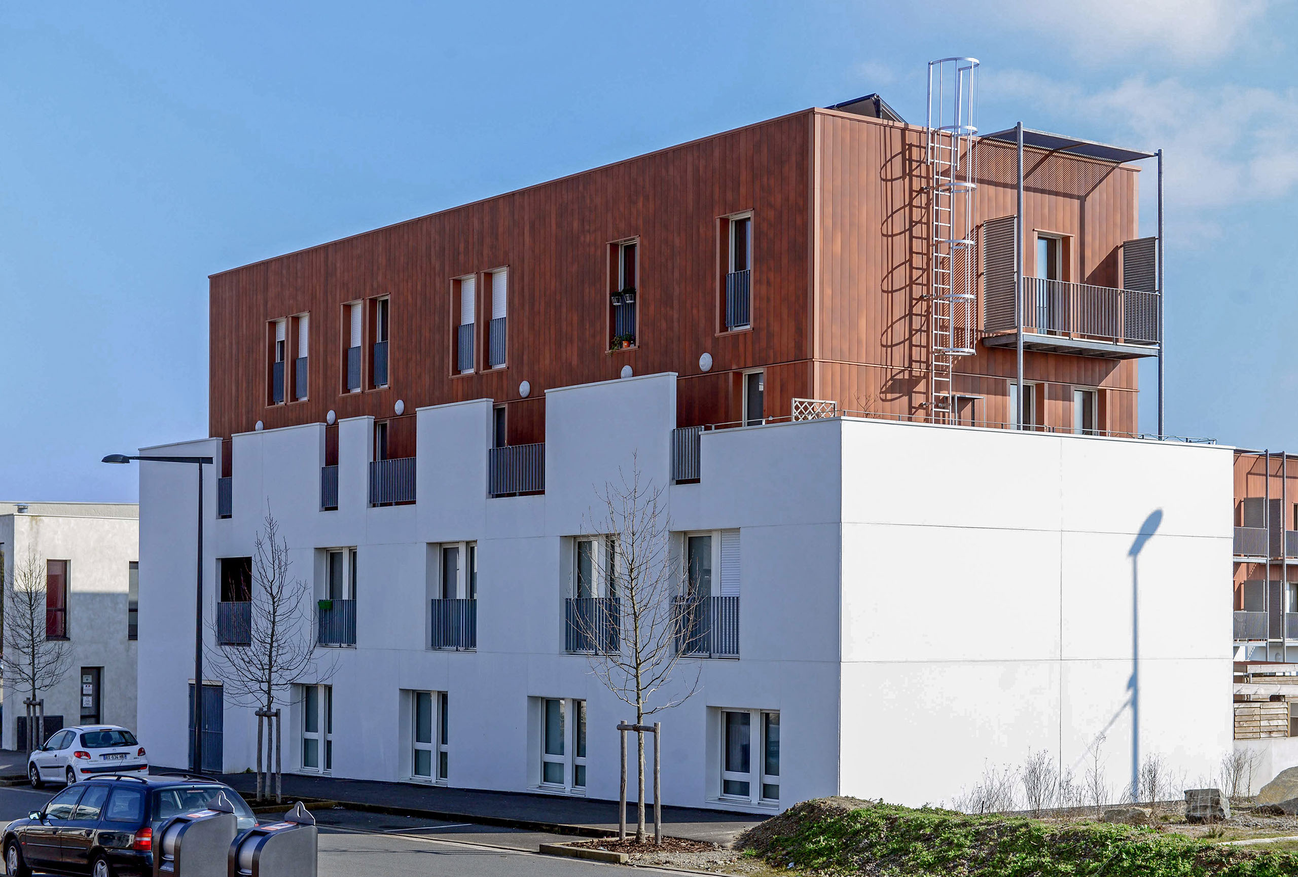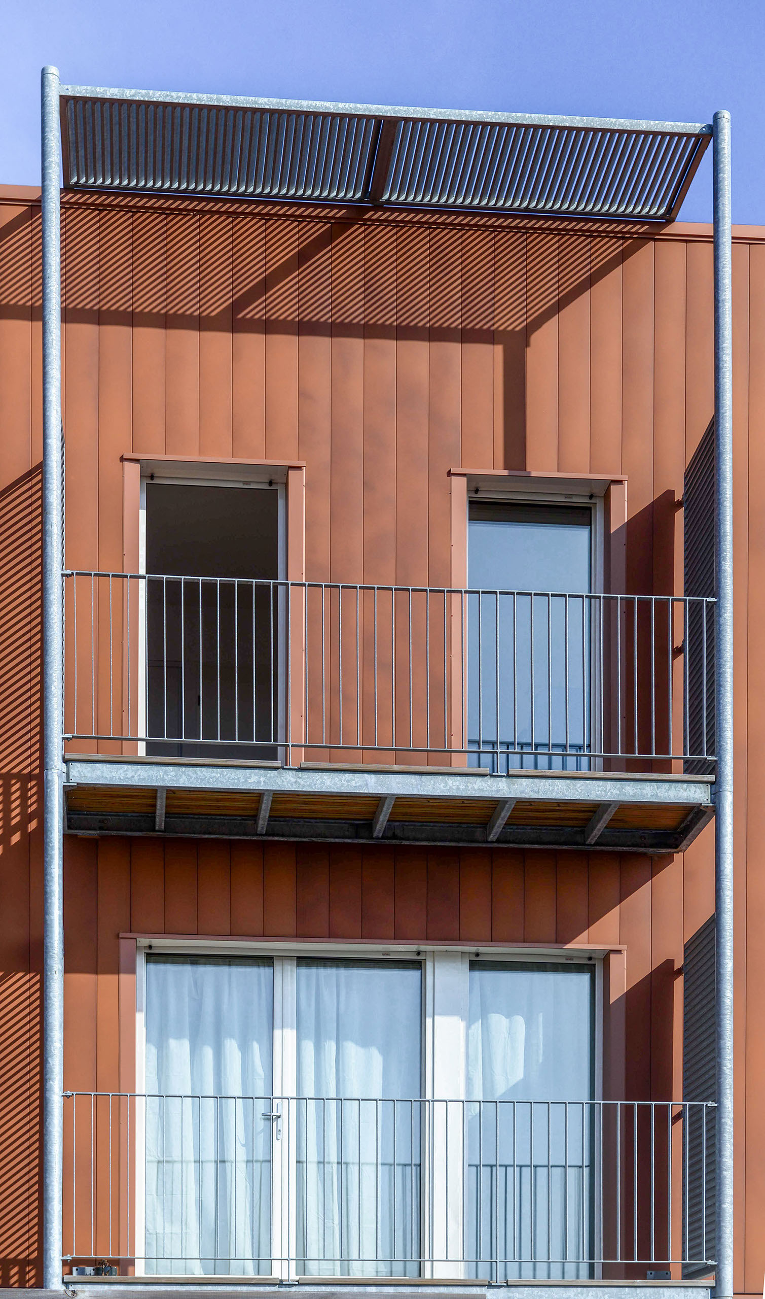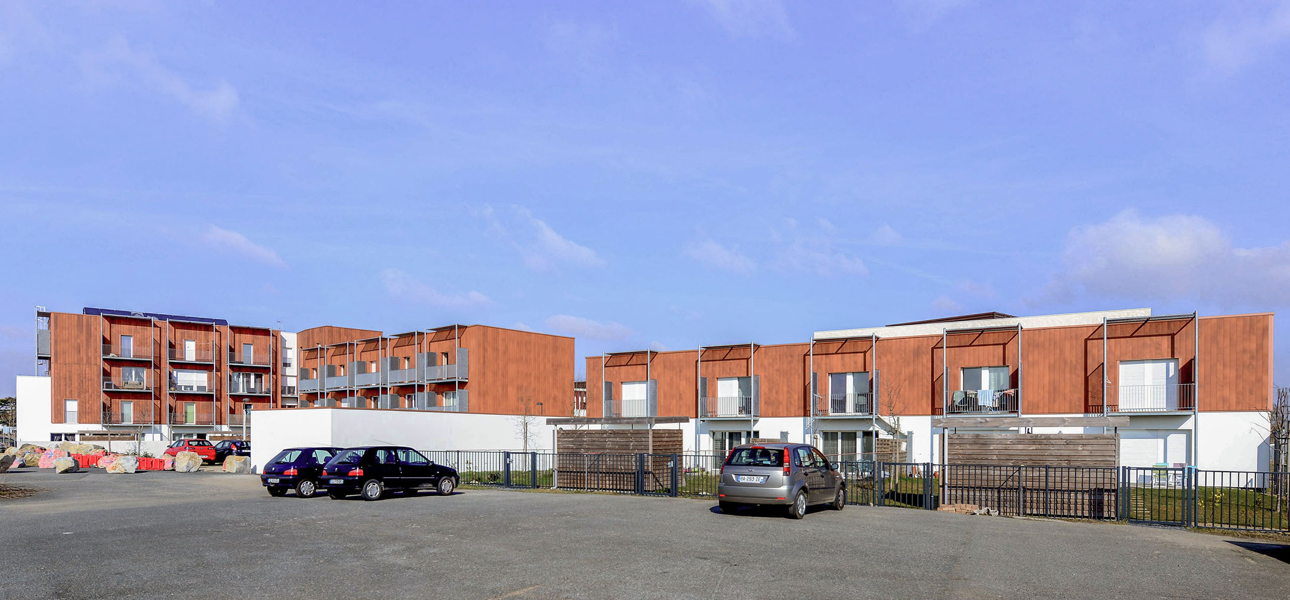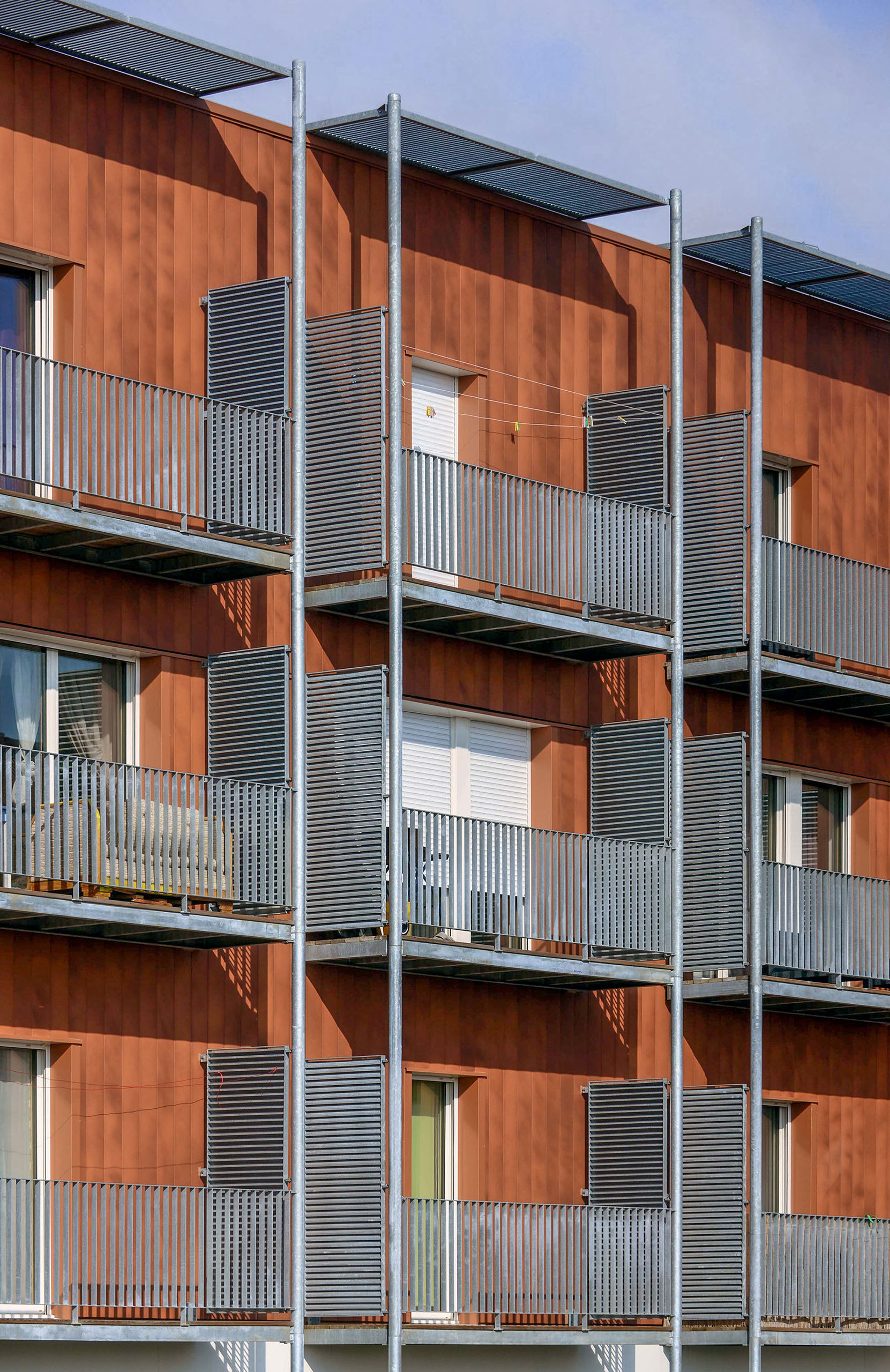 La coursive vient ainsi scindé le bâtiment en deux parties constitué par un socle traité en voile béton peint surmonté par le corps du bâtiment traité par un bardage métal. Cette césure en deux se généralise à l’ensemble des bâtiments assurant ainsi une unité architecturale à l’opération tout en offrant une dynamique urbaine par la déclinaison des volumes et la dualité du traitement des façades.