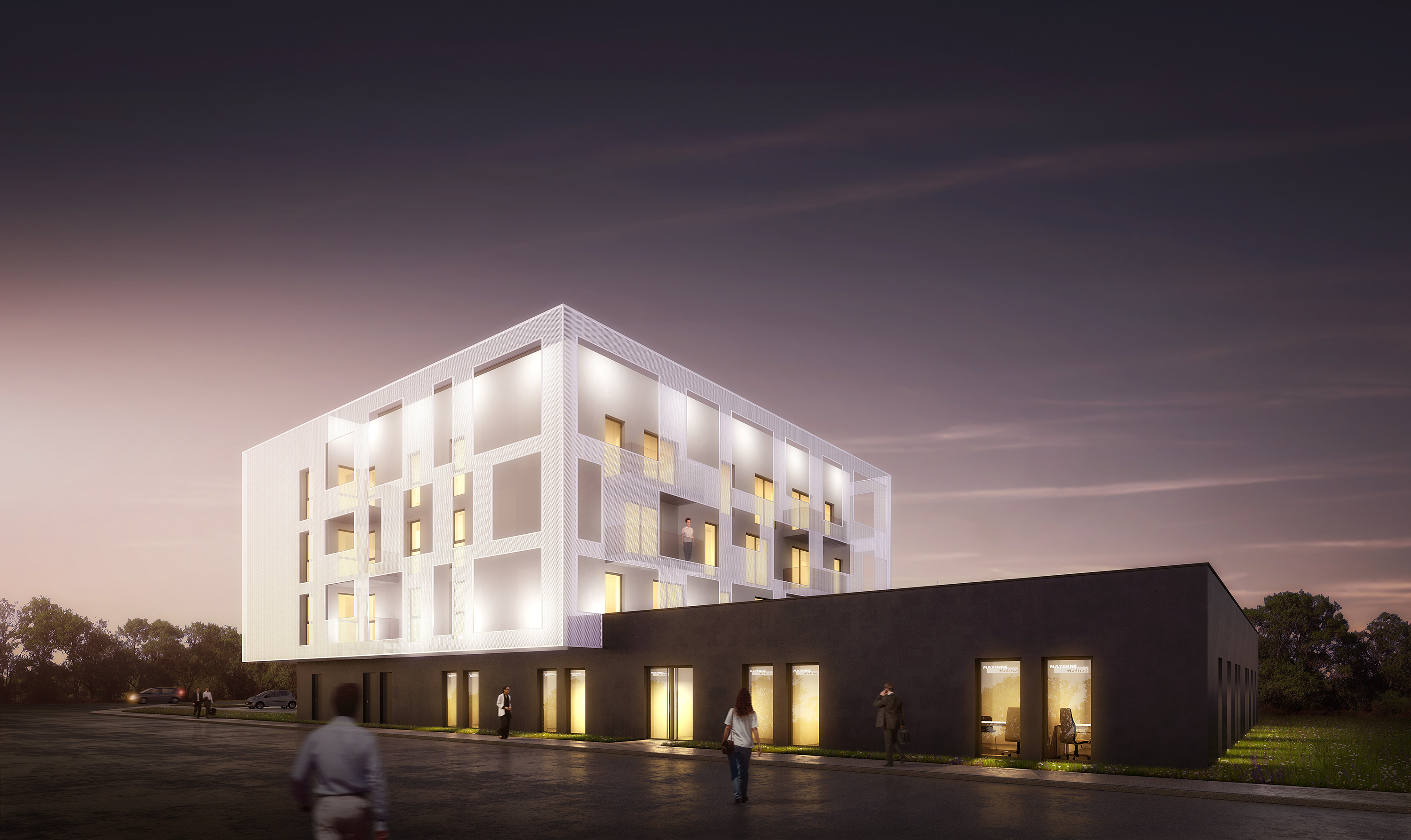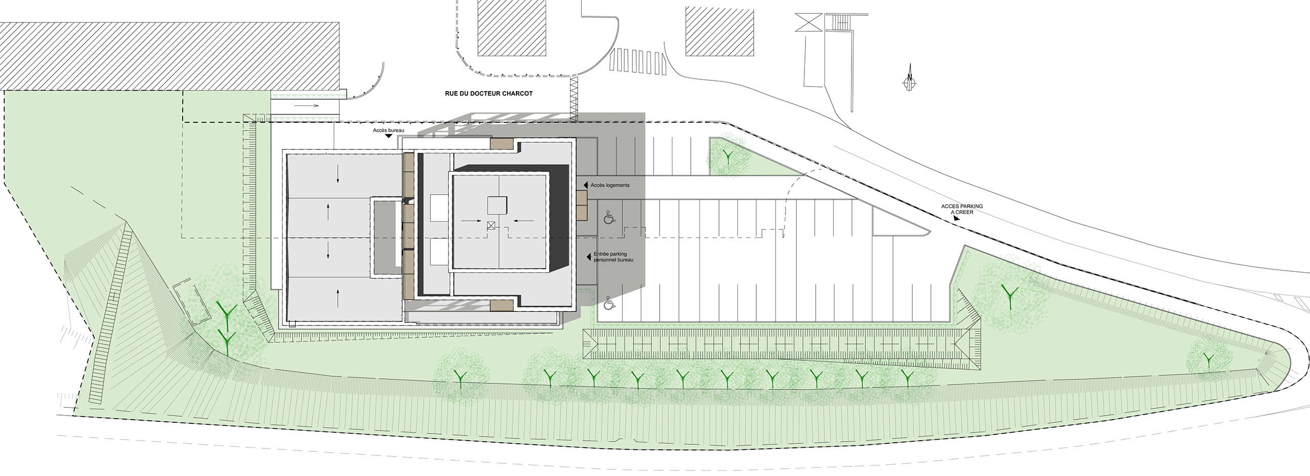 Le projet joue sur la dualité des matériaux et des entités avec le béton pour les bureaux au rez-de-chaussée et un bardage métallique perforé sur les 4 niveaux de logements.