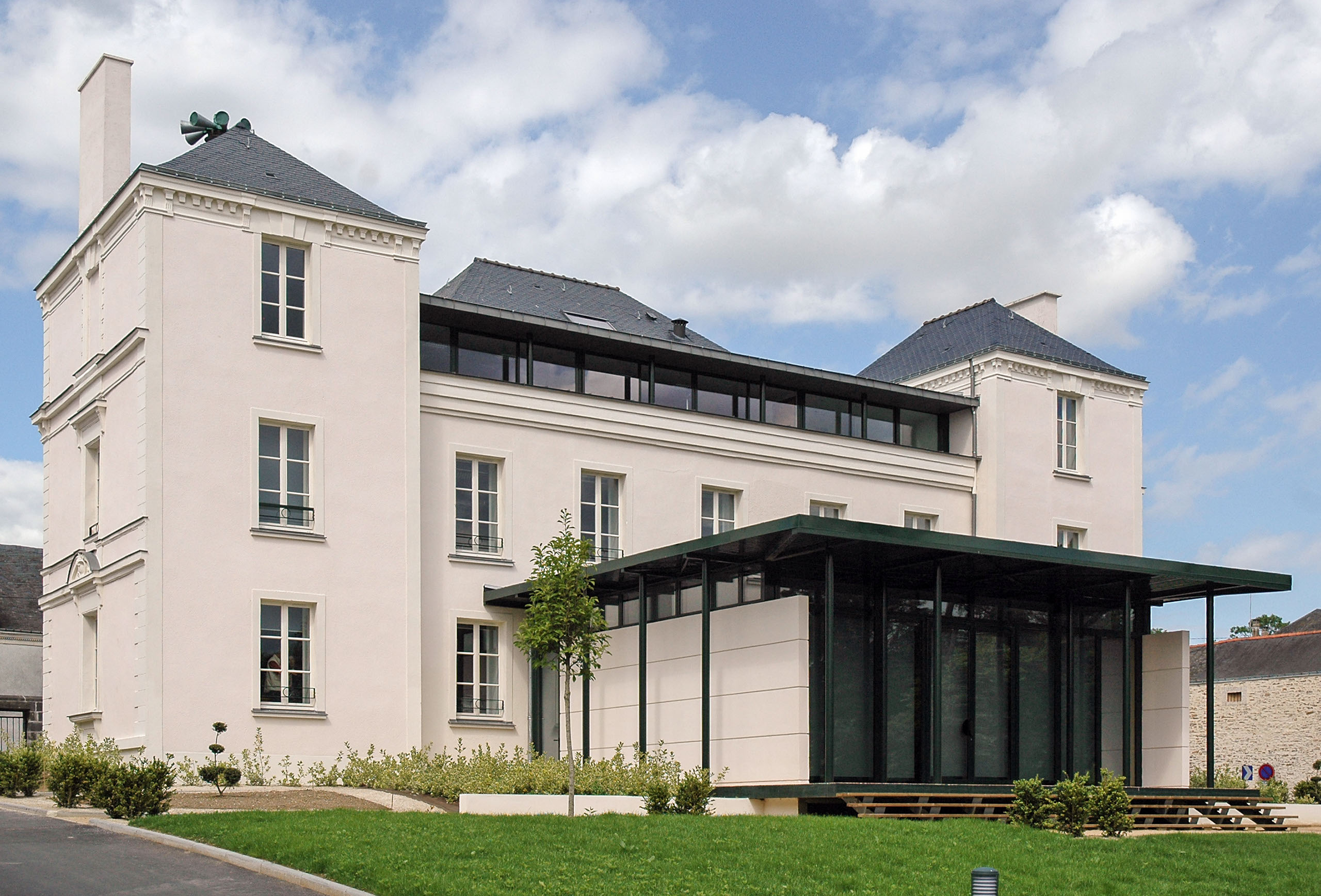 La mairie de Pouancé est une belle maison bourgeoise marquant sa différence en se reculant de la rue et rompant son austérité, en arrière, par l'ouverture généreuse sur un parc d'agrément.