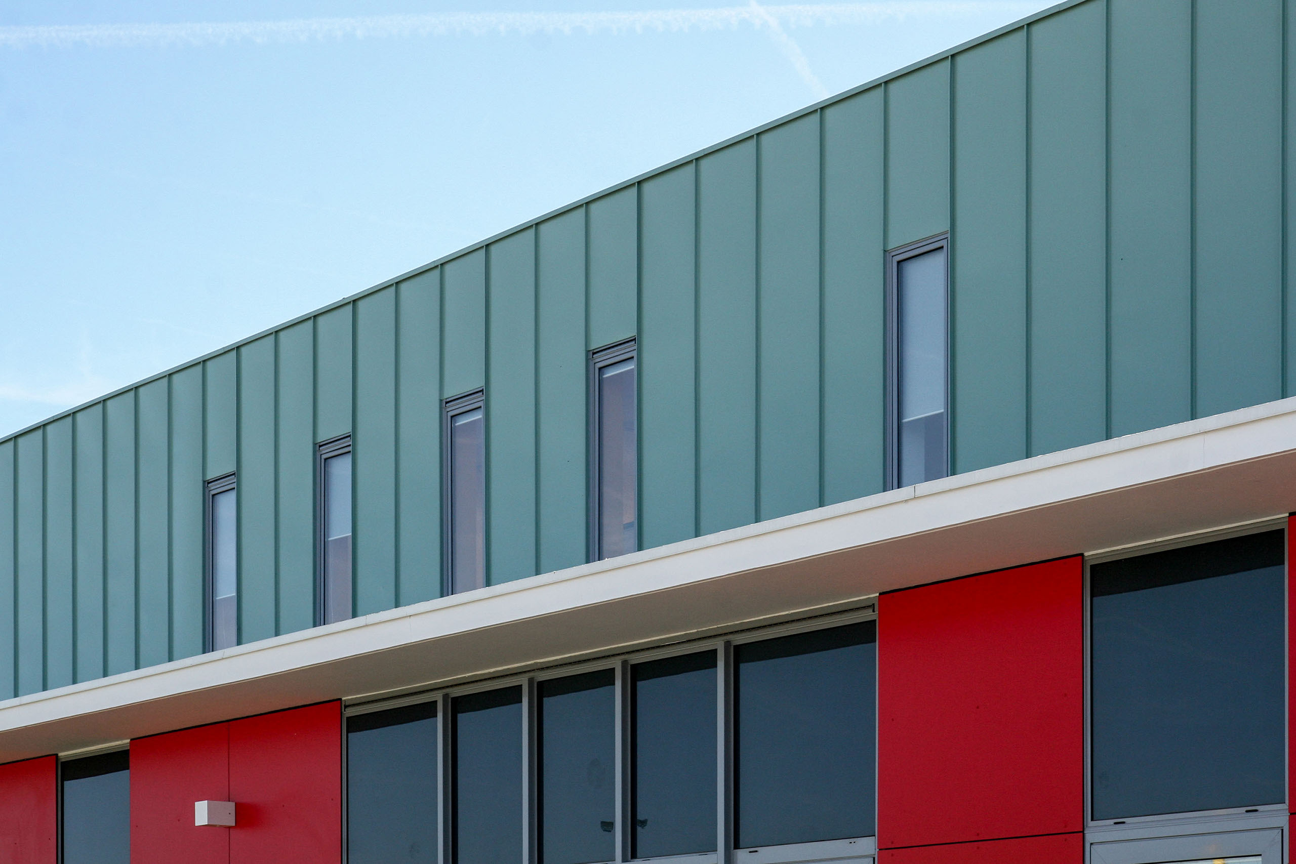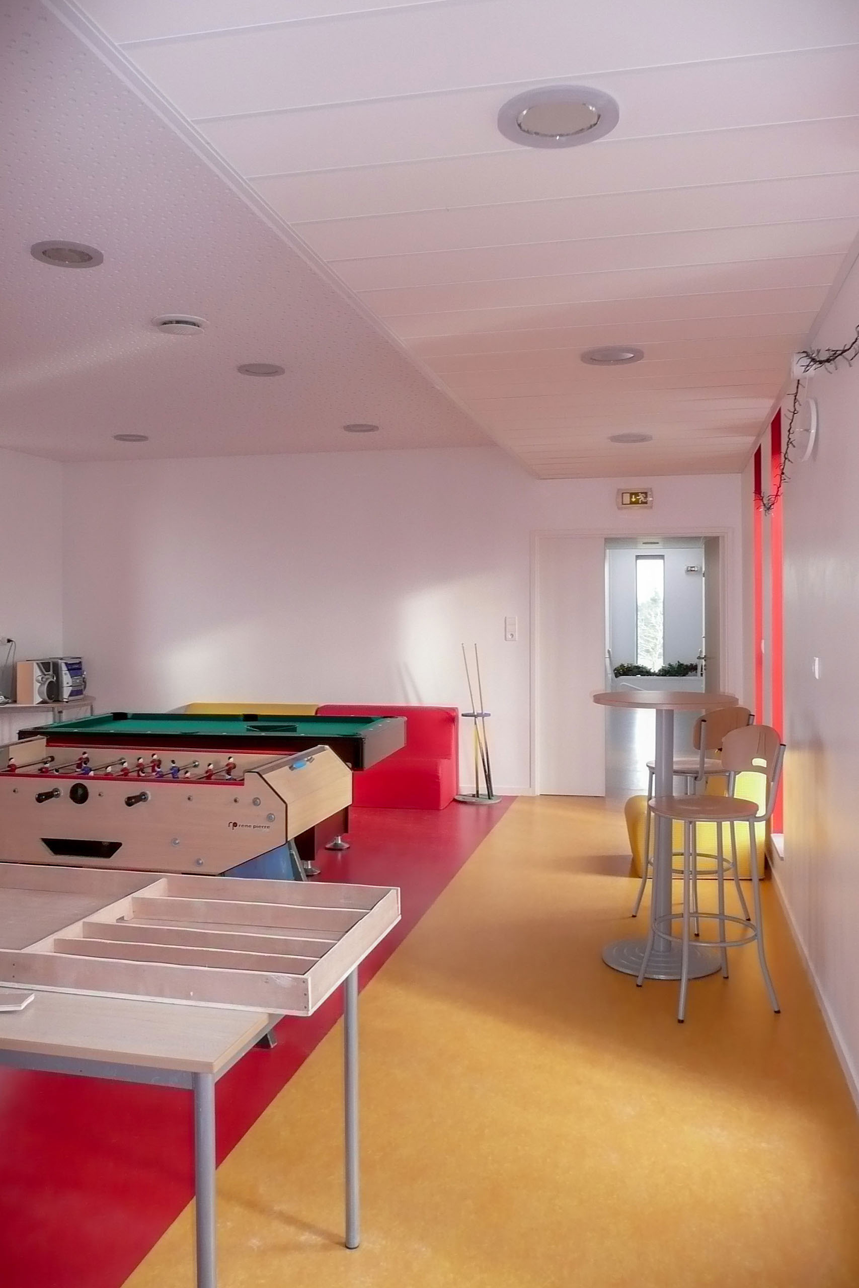 Le projet s’articule sur un vaste rez-de-chaussée à deux niveaux permettant ainsi le lien de plain-pied avec d’un côté le plateau sportif et de l’autre le parking, et surmonté d’un volume simple dans sa partie centrale.