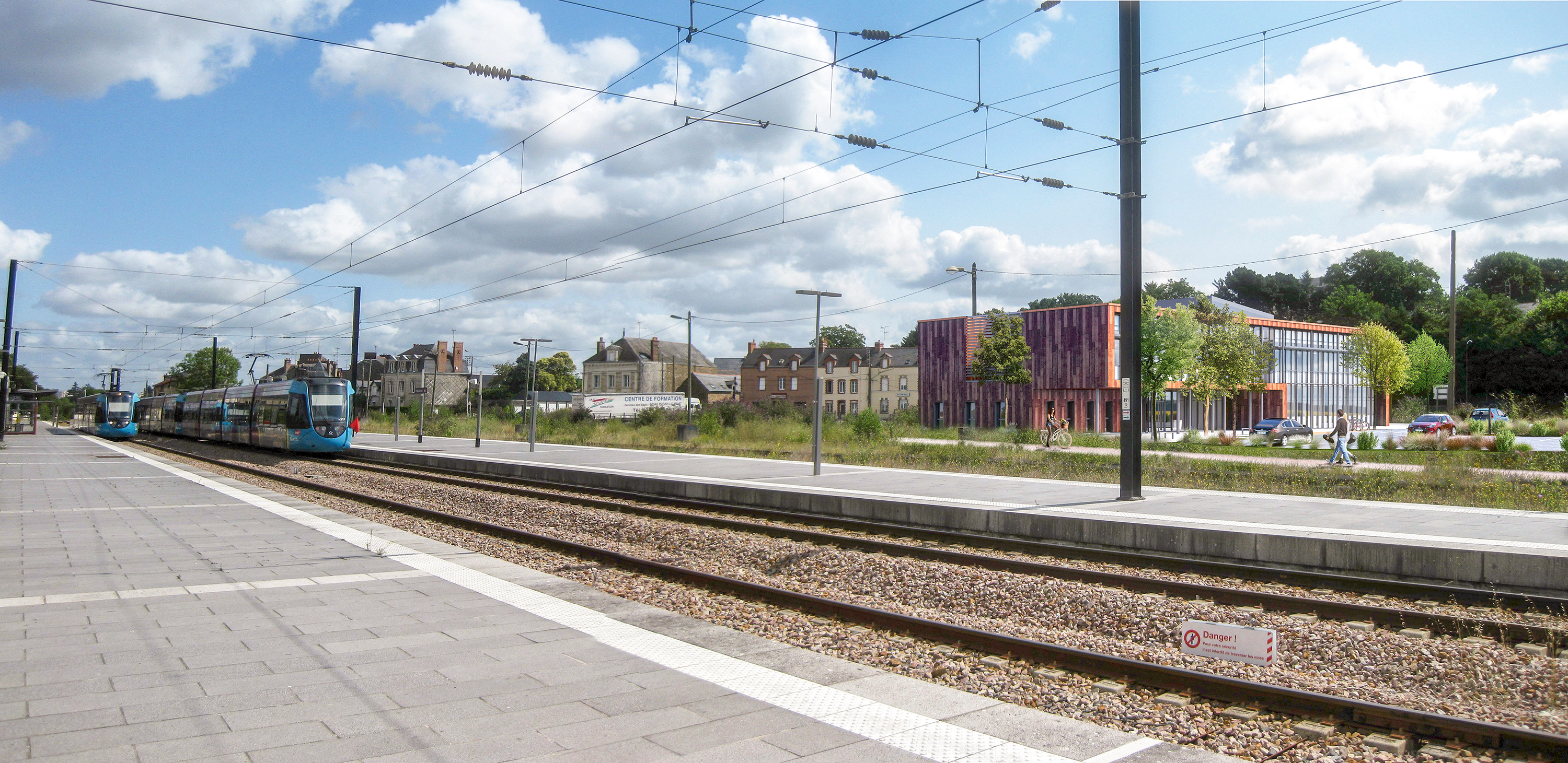 Le bâtiment se développe en longueur sur un axe est-ouest en recul important par rapport à la limite sud afin de bénéficier au maximum des apports solaires. Le pignon Est est aligné partiellement sur la rue d’Ancenis.