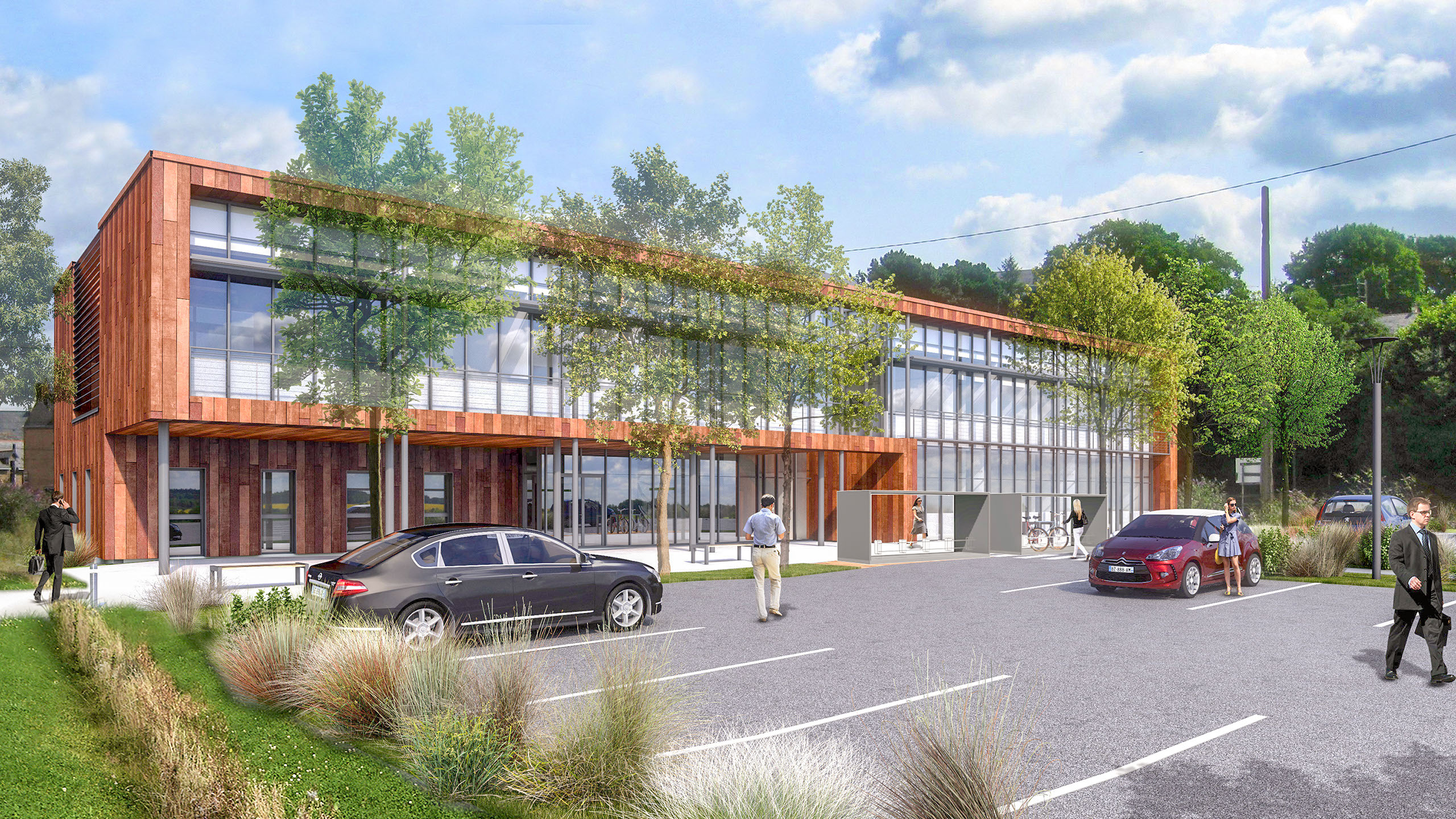 La façade nord, plus fermée, est animée par les fenêtres verticales des bureaux de l’étage et le mur rideau au niveau de la cage d’escalier permettant des vues traversantes depuis le hall, les pignons à l’ouest par une terrasse au niveau 1, protégée par des brise-soleils fixes en tôle laquée et à l’est par un volume plus bas percé de 2 fentes, et ménageant une entrée secondaire.